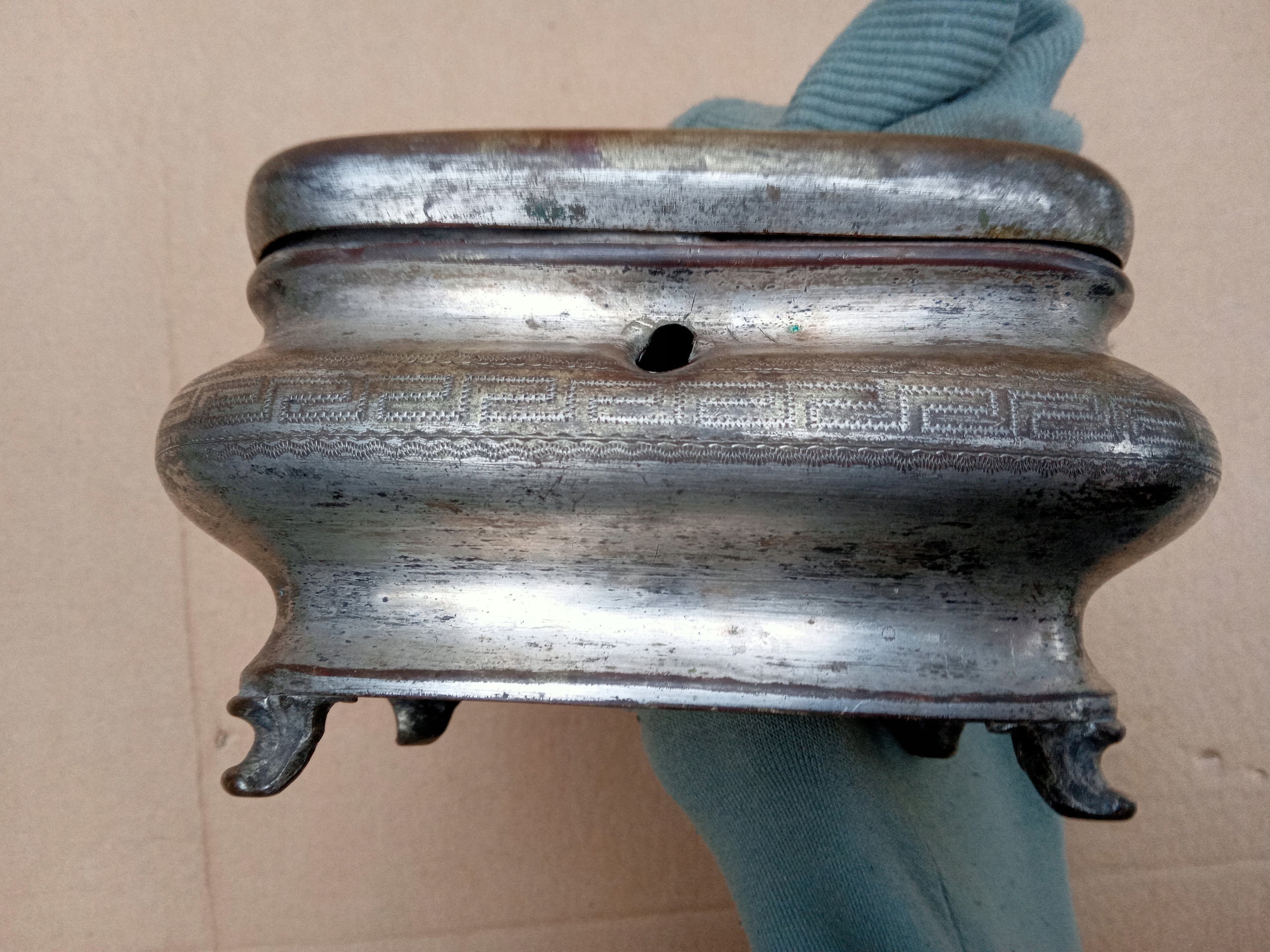 размеры прибл. 14,5 см х 11 см х 8,5 см, погнуты, вмятины, потертости серебрения, трещина на обложке в углу, отсутствует замок с ключом, крышка не закрывается сама - петля требует ремонта, декорирована гравировкой, требует реставрации