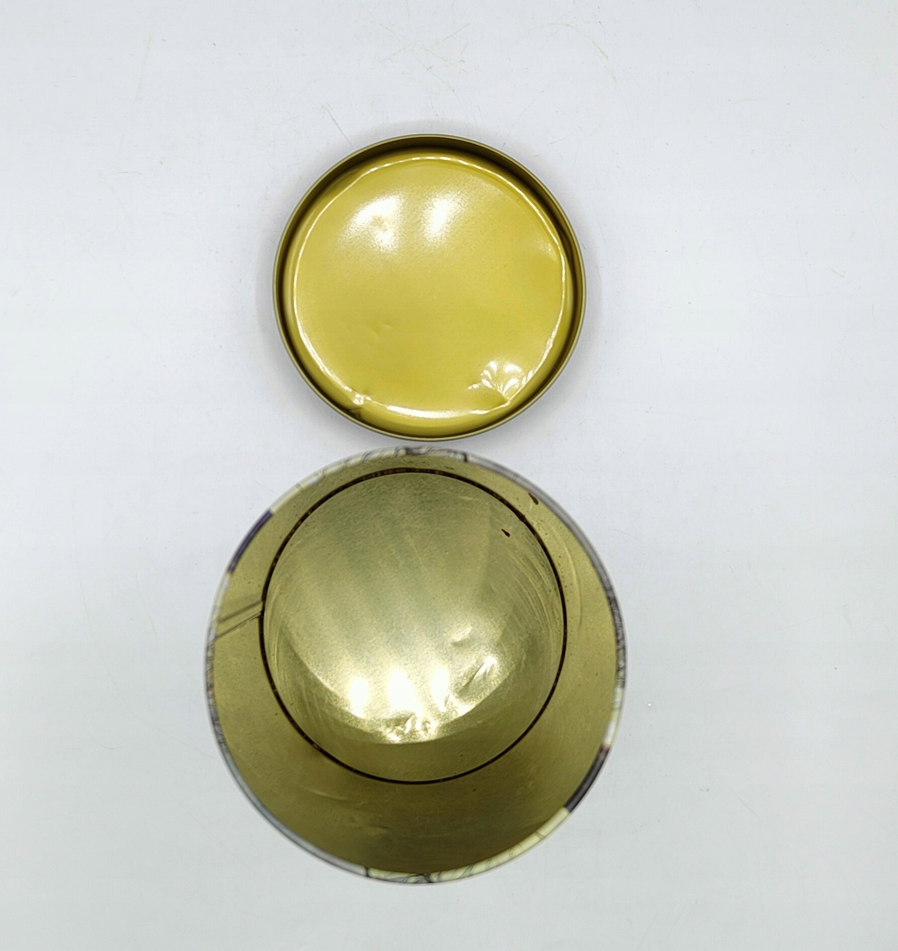 - он уже старый, и после того, как тут и там можно увидеть вмятины и царапины, но это только добавляет шарма жестянке, а дополняется все это красивыми зимними мотивами, банка явно функциональная, очень красиво внутри,