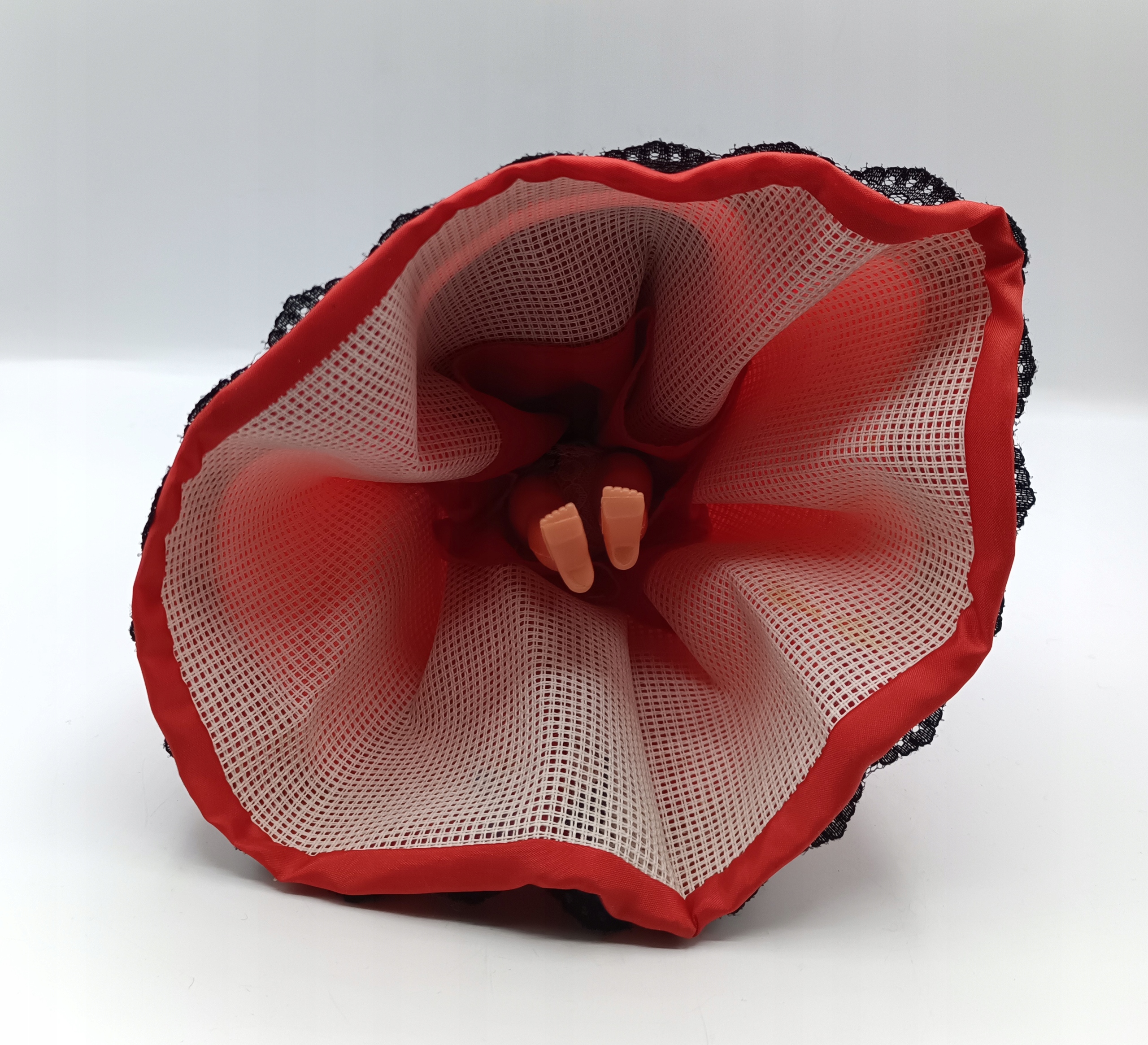 - из пластика и материала, голова имеет движущиеся глаза, плетеная корзина