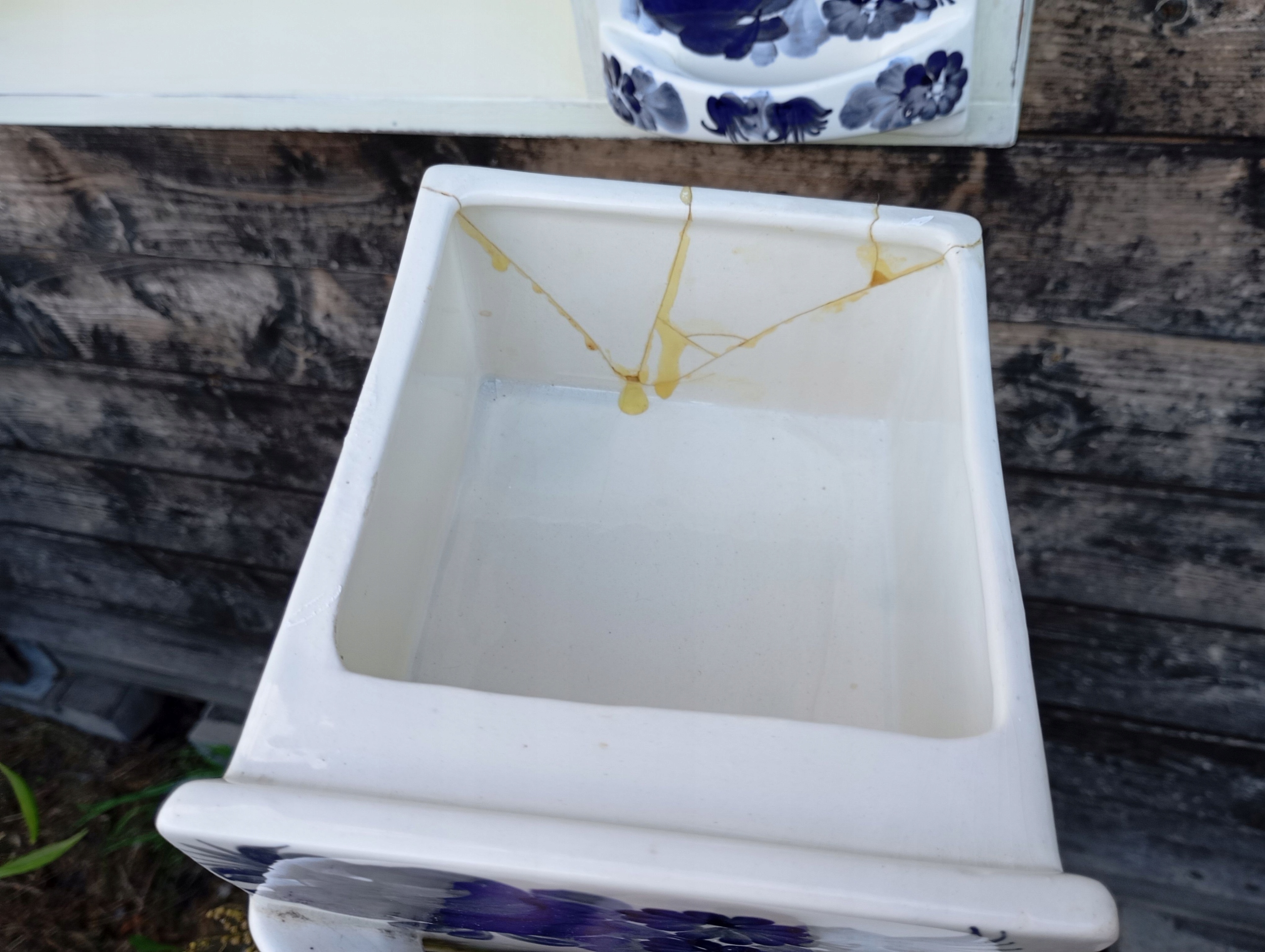 Ящики керамические, расписанные вручную (один ящик приклеен сверху к ручке, другой с приклеенной спинкой - видно на фото)