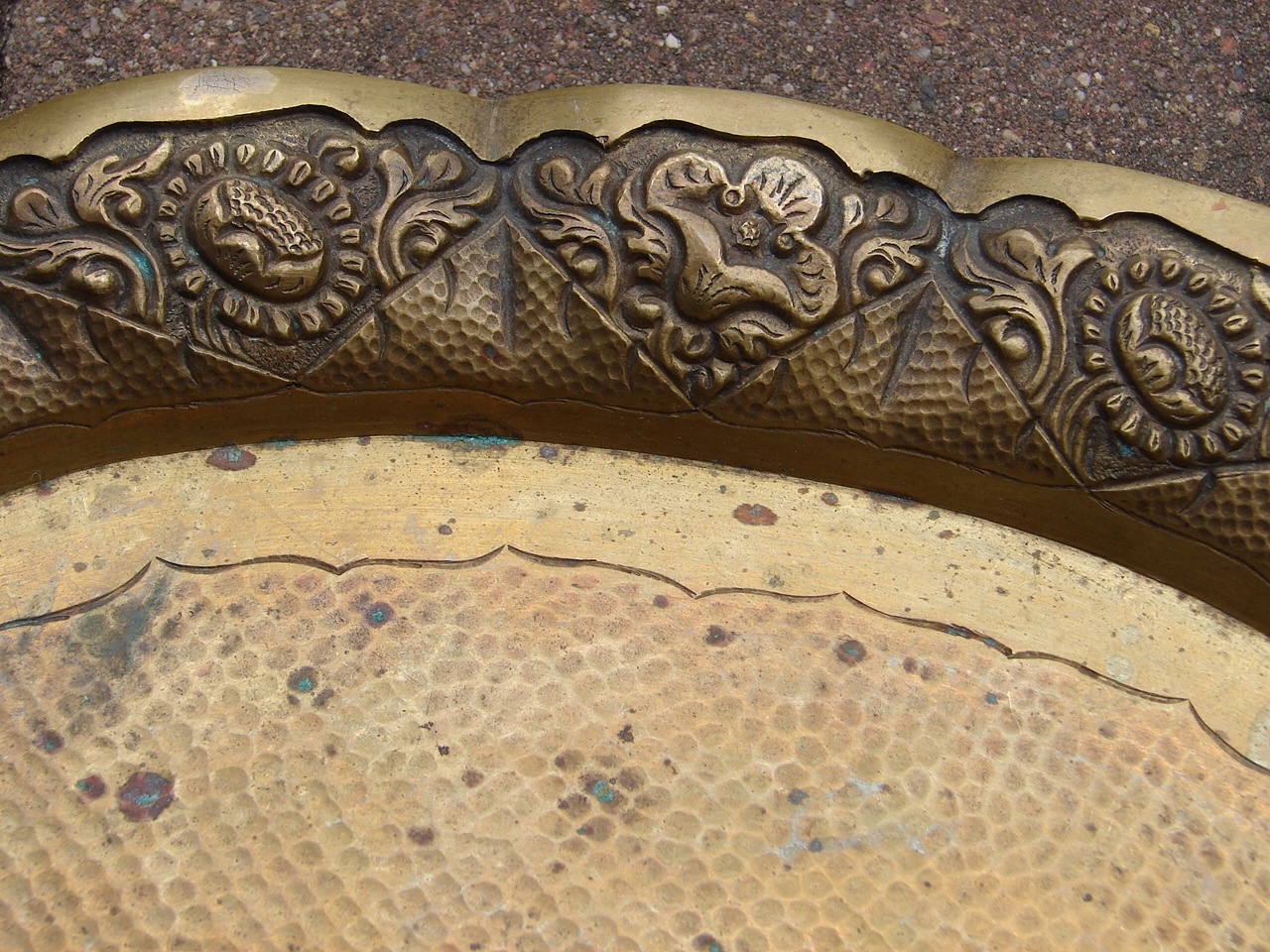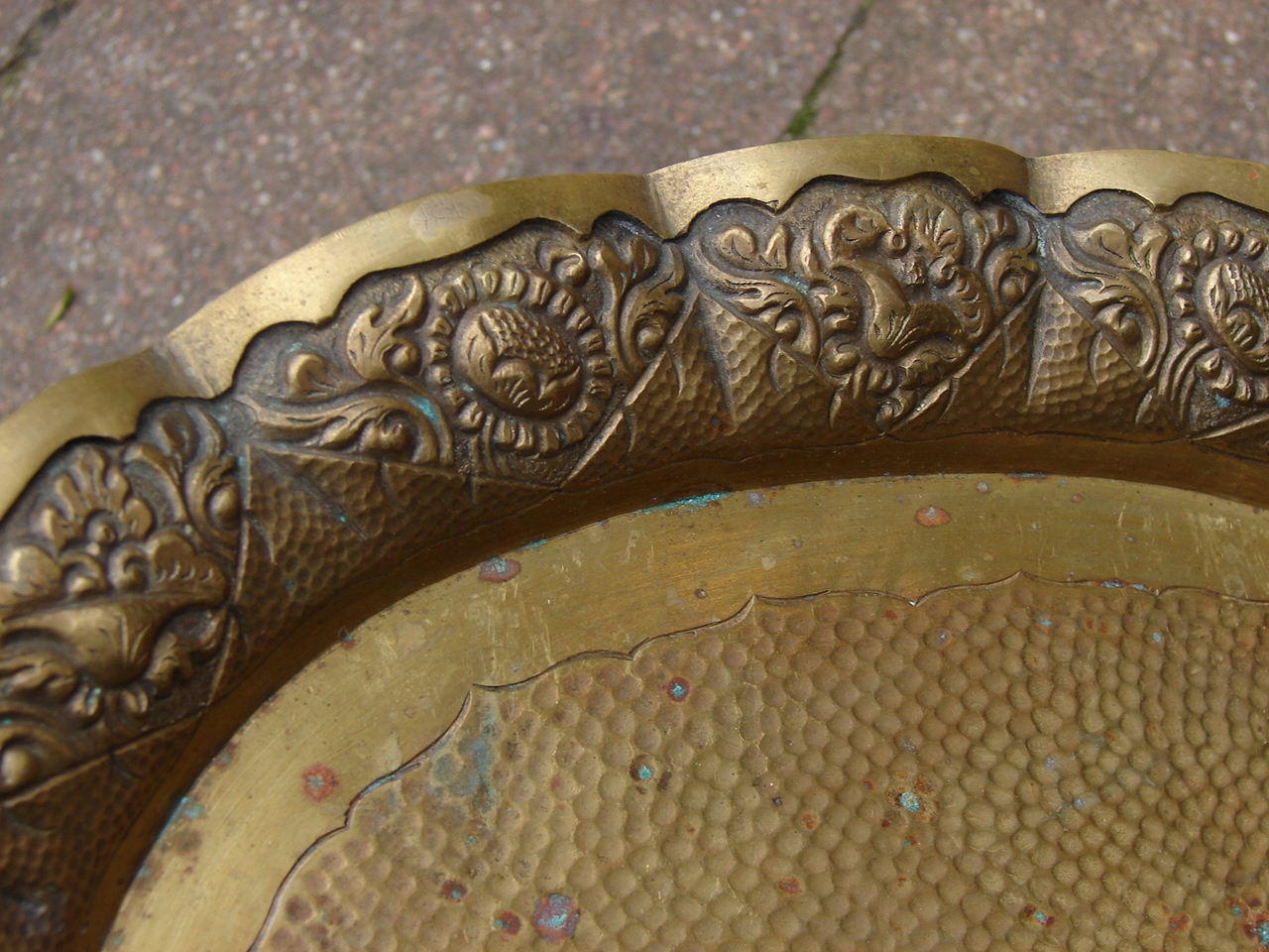 Внешний край патеры богато украшен рельефными украшениями с цветочным мотивом, таким как листья и цветы, край имеет волнистую декоративную форму.