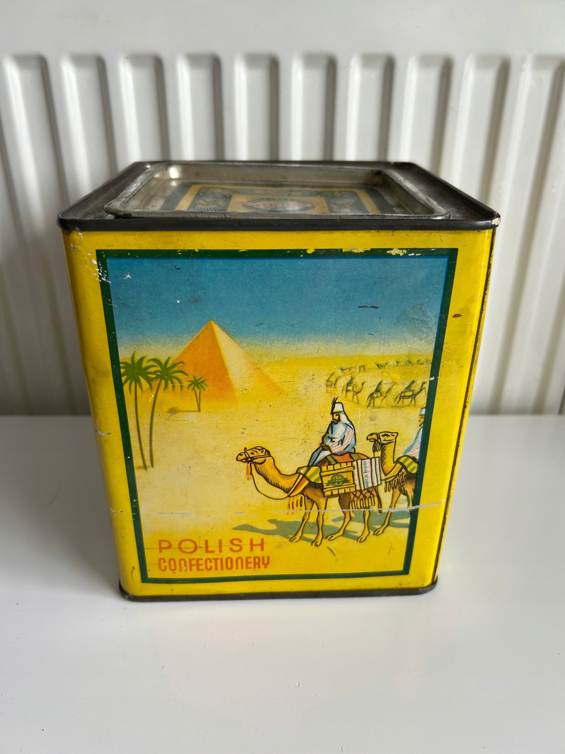 Старая, оригинальная, большая, пустая банка из-под конфет времен Польской Народной Республики - у.