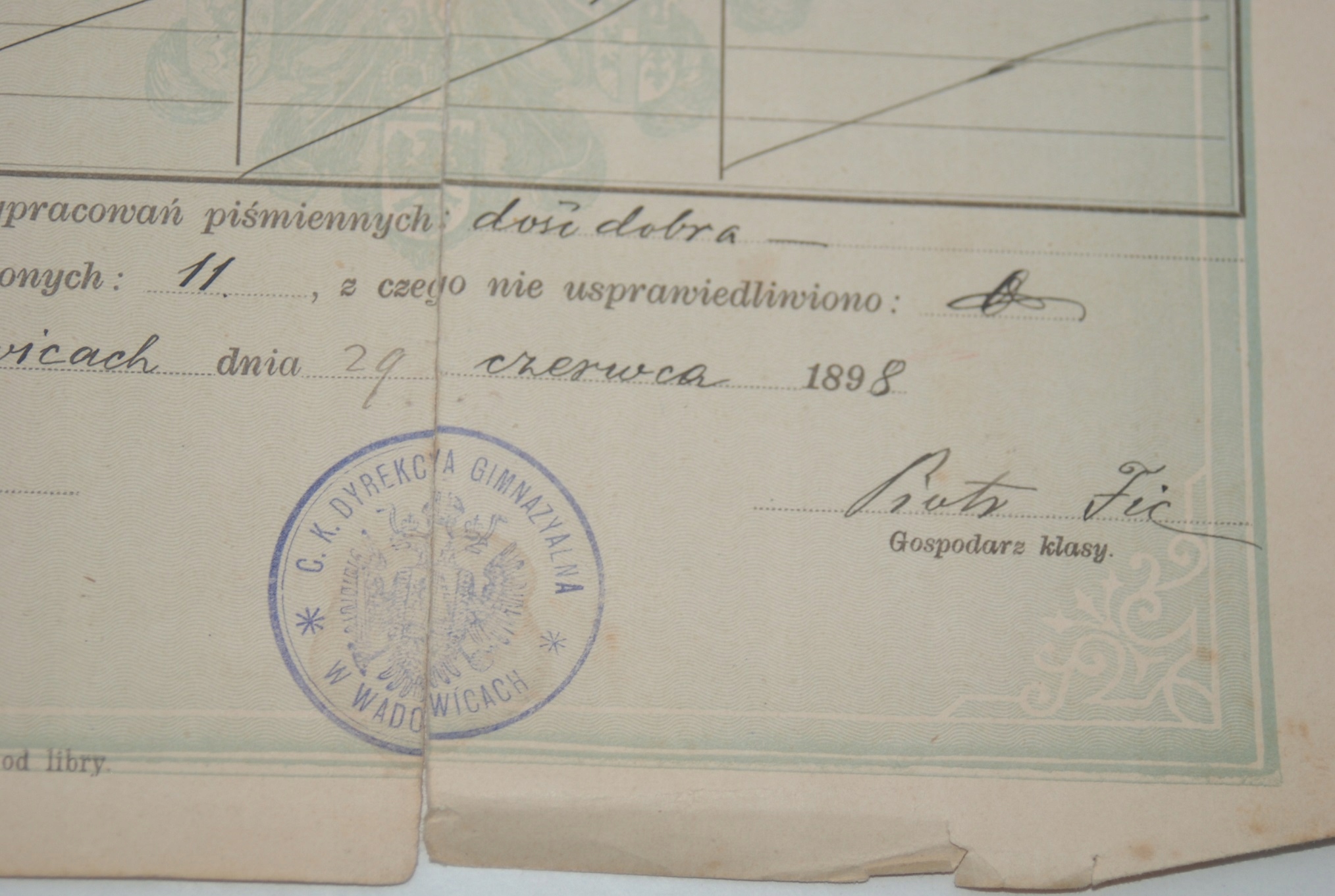 Табель успеваемости старой школы 1898 года, Вадовицкая неполная средняя школа