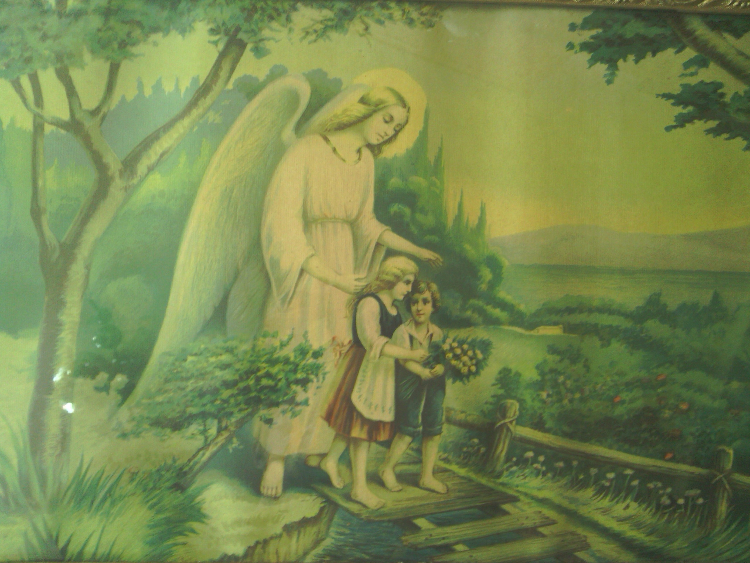 Старая большая картина, ангел -хранитель в деревянной раме 2