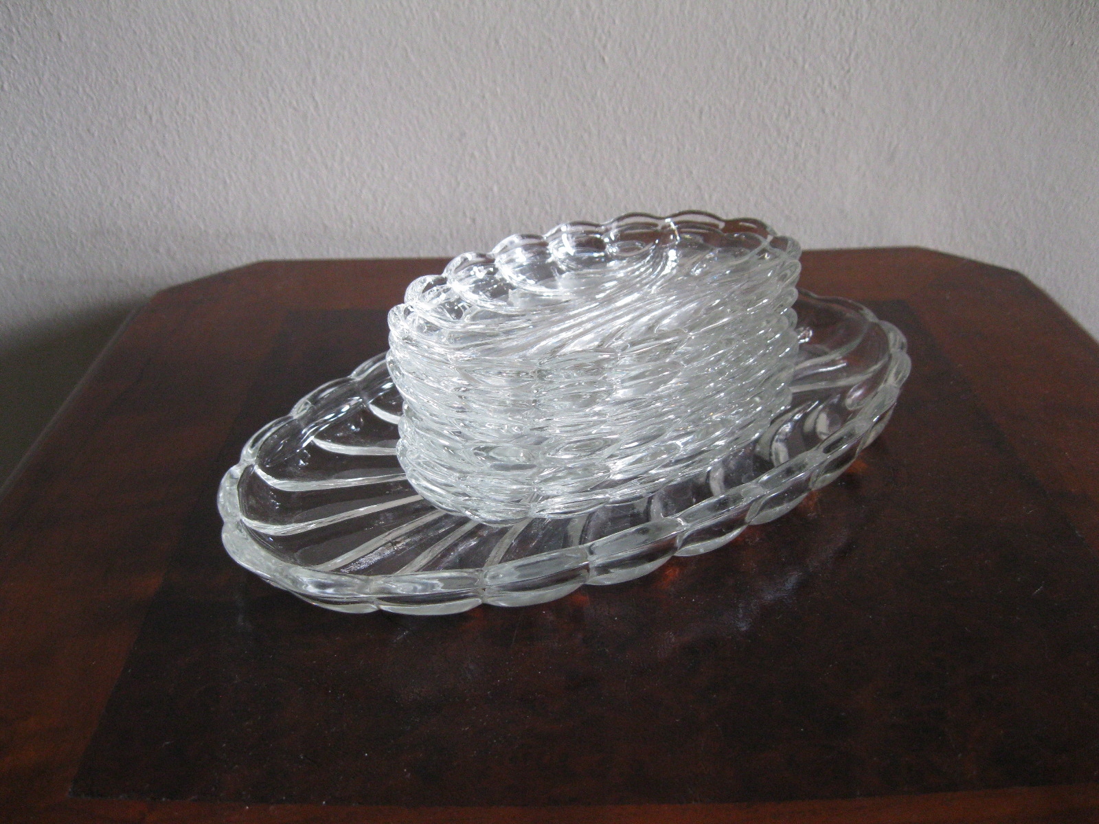 Оригинальный, старинный набор, большая салатница и 6 маленьких салатниц. Набор изготовлен из качественного белого прозрачного стекла, украшенного снаружи декоративным тиснением и волнистой декоративной кромкой. Набор в очень хорошем состоянии, совершенно неповрежденный - большая салатница имеет технологический/производственный дефект в виде двух царапин снаружи и мелких царапин от возраста, не влияющих на красоту изделия. Рекомендую!