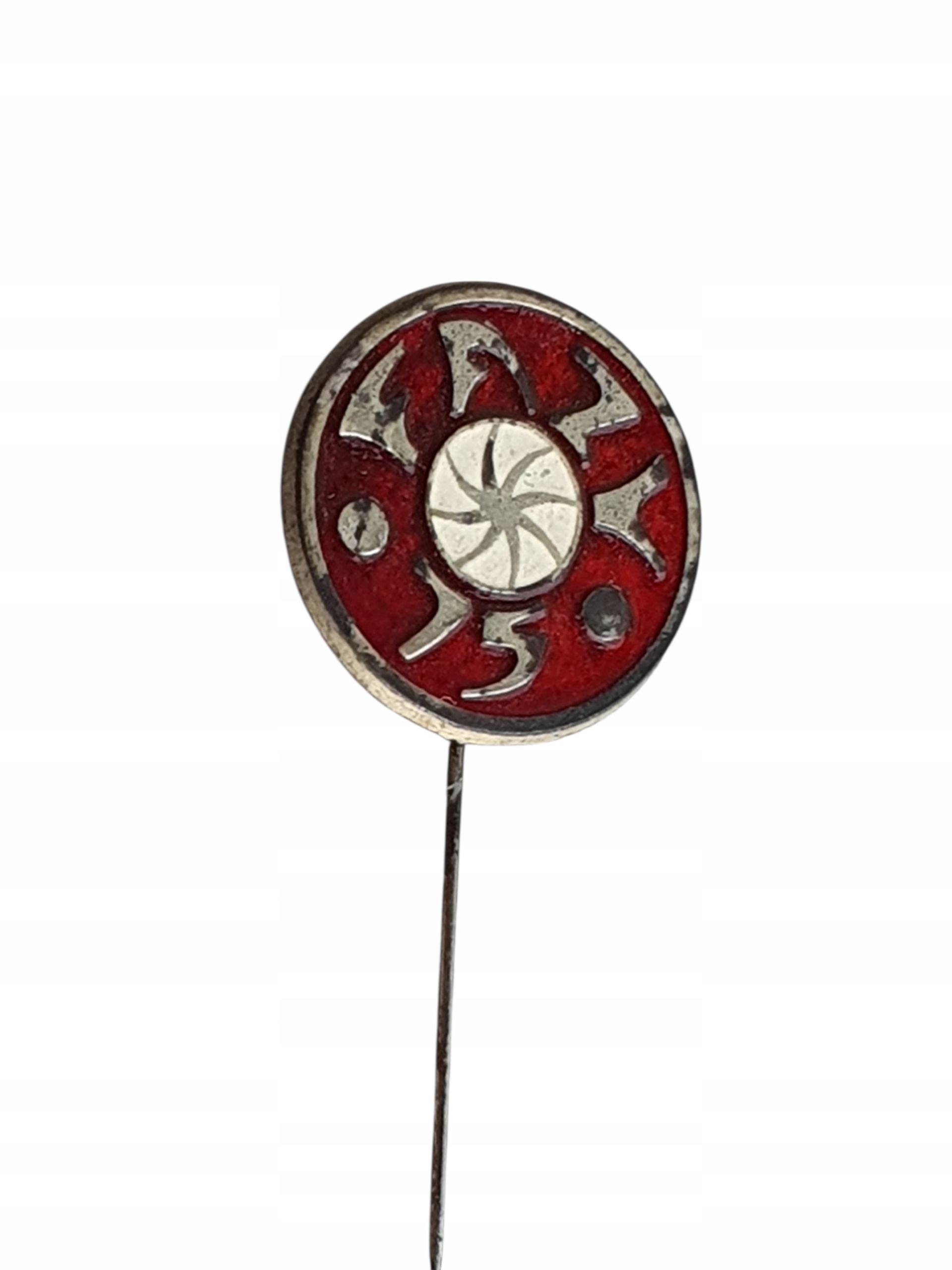 Продается оригинальная металлическая булавка 1975 года, скорее всего, родом из спортивного мероприятия, организованного во времена Польской Народной Республики. На мемориальной доске имеется аббревиатура FAZL и число 75, что, скорее всего, указывает на год события. В центре расположен стилизованный символ, напоминающий пропеллер или раскидистые лучи, - типичный для графических спортивных или профсоюзных знаков того периода.