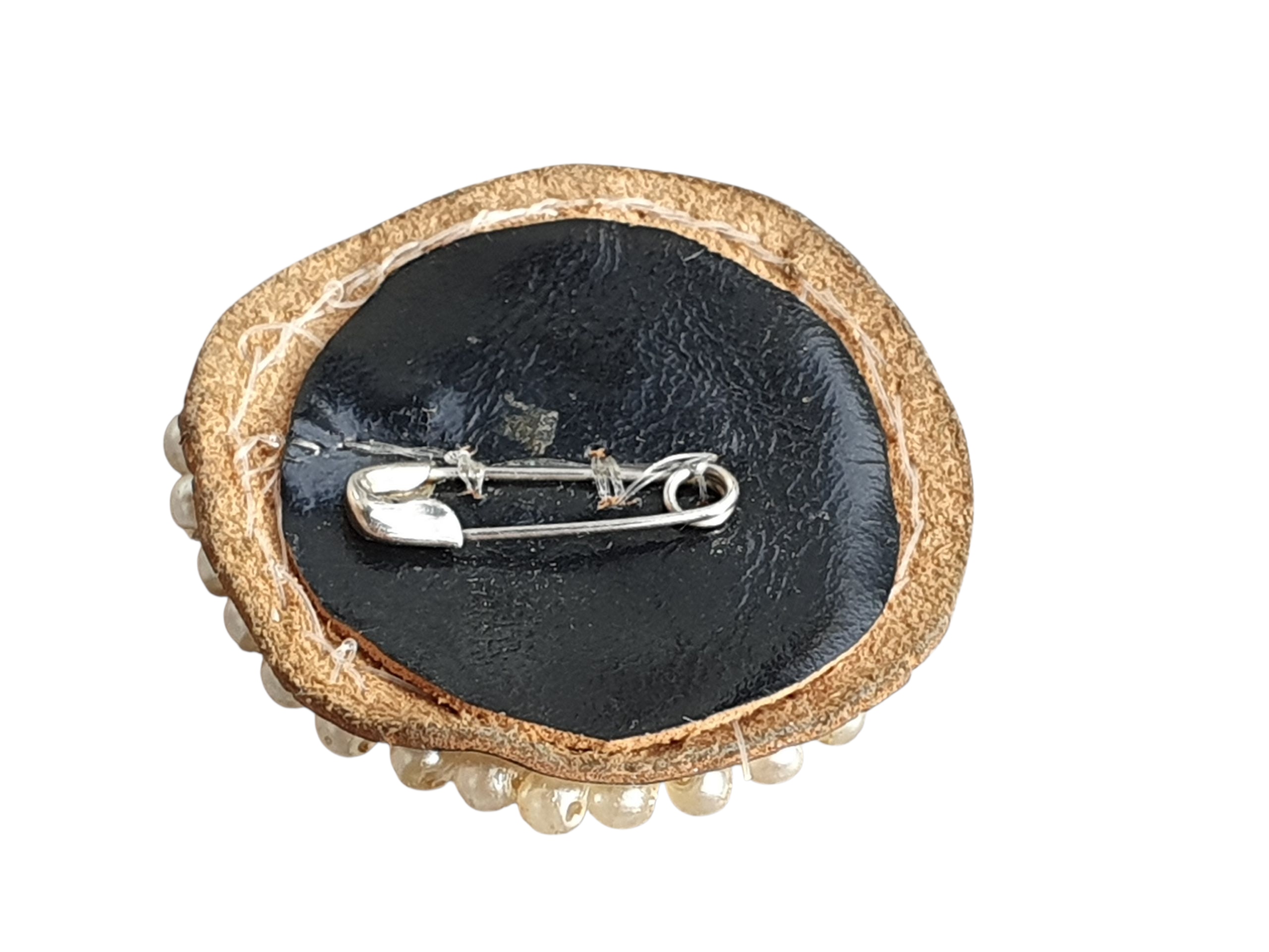 Задняя часть броши отделана кожаной или кожзаменительной подложкой черного и коричневого цвета, к которой прикреплена металлическая булавка – благодаря ей булавку легко прикрепить к одежде, шарфу, сумке или шапке. Все сохранило свой характерный старинный шарм, а небольшие следы использования подчеркивают его подлинность и историю.