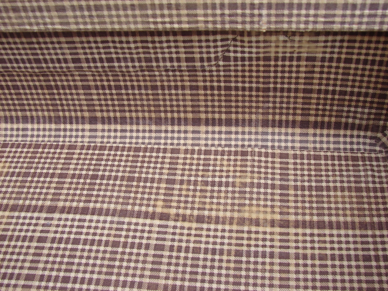 Чемодан выполнен из деревянного каркаса, обтянутого плотным картоном и с усиленными углами, внутри бумажная подкладка, ручка и металлические замки-замки. Чемодан имеет оригинальный ключ.