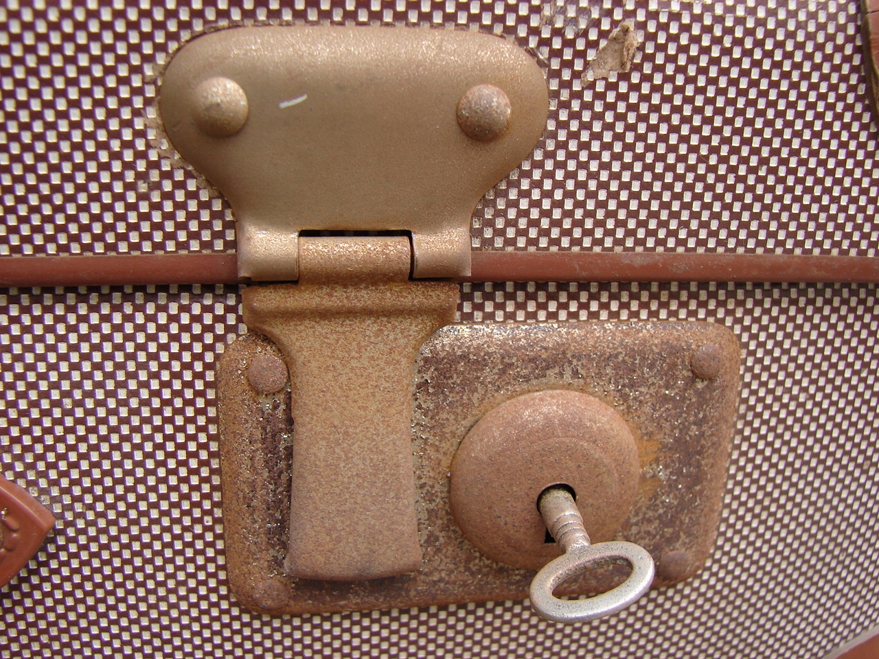 Чемодан требует ремонта, имеет следы использования и возраста. Металлические элементы крепежа покрыты ржавым налетом. Замки функциональные, закрываются на ключ.