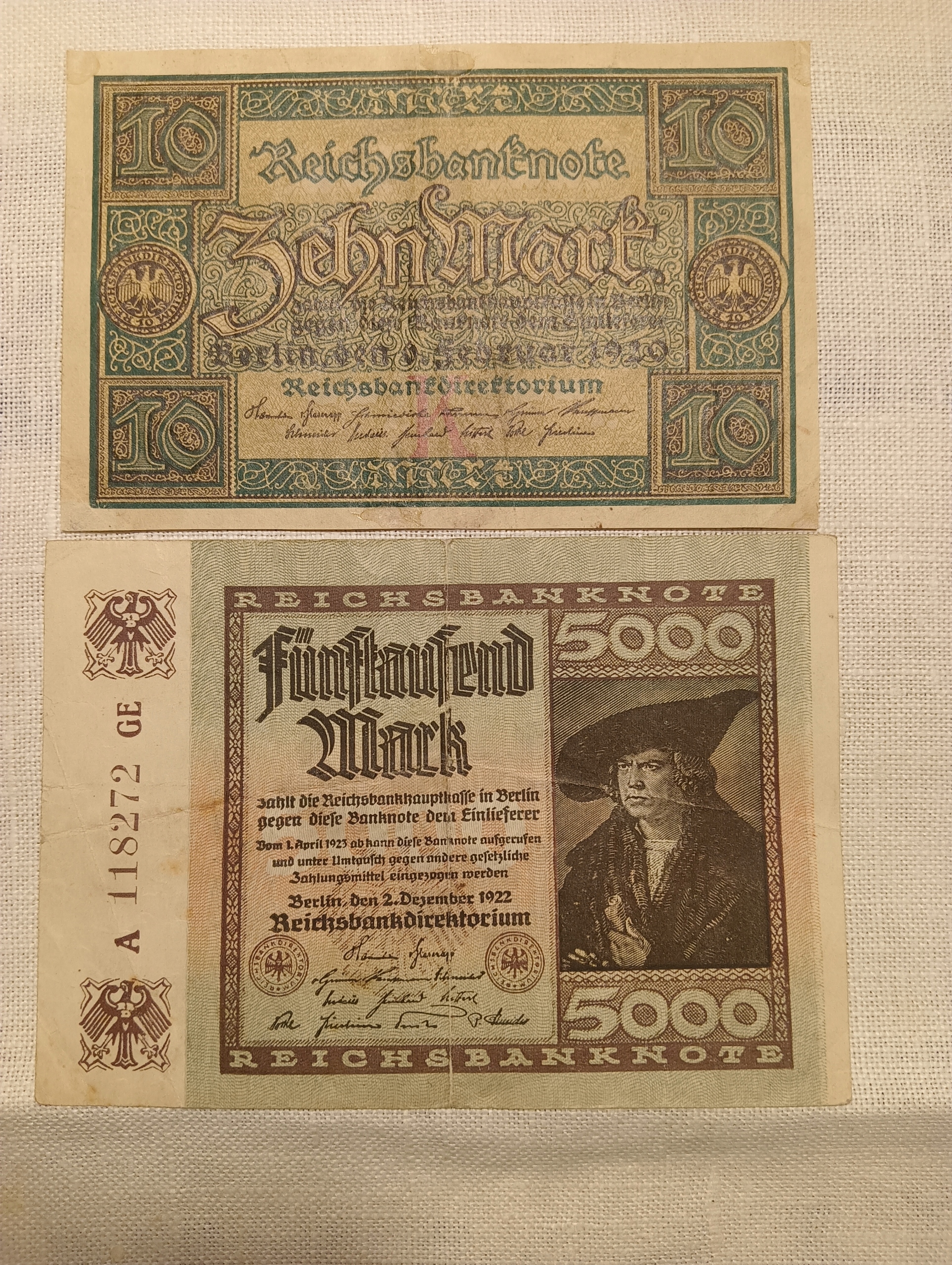 Stare banknoty 10 i 5000 marek 1920, 22 r. Niemcy