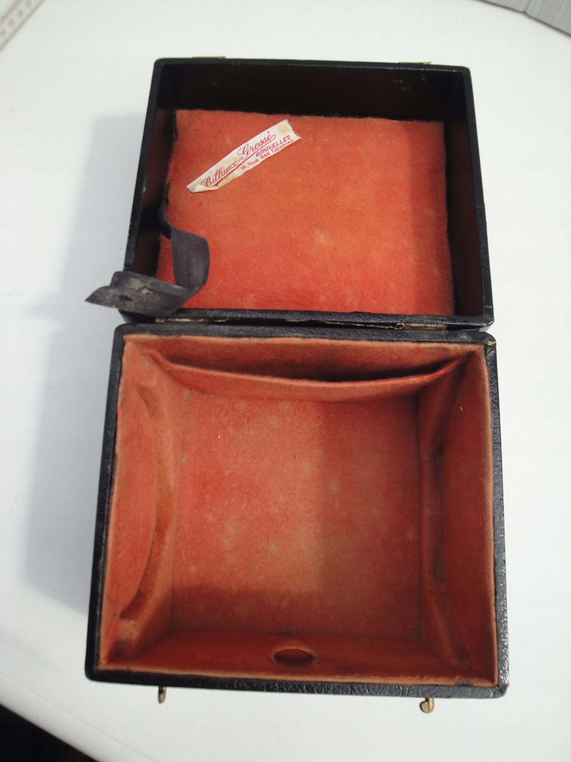 СТАРЫЙ КОРОБКА ДЛЯ ЦЕРЕМОНИАЛЬНЫХ ворот 16/17,5/15см ЧЕРНАЯ КРЫШКА НА ПОДКЛАДКЕ КРАСНОГО МАТЕРИАЛА С ПОДПИСЬЮ BILLAUX GROSSE BRUXELLES. СОСТОЯНИЕ, КАК ПОКАЗАНО НА ФОТОГРАФИЯХ, ДИСЦВЕТАНИЯ, ЦАРАПИНЫ.
