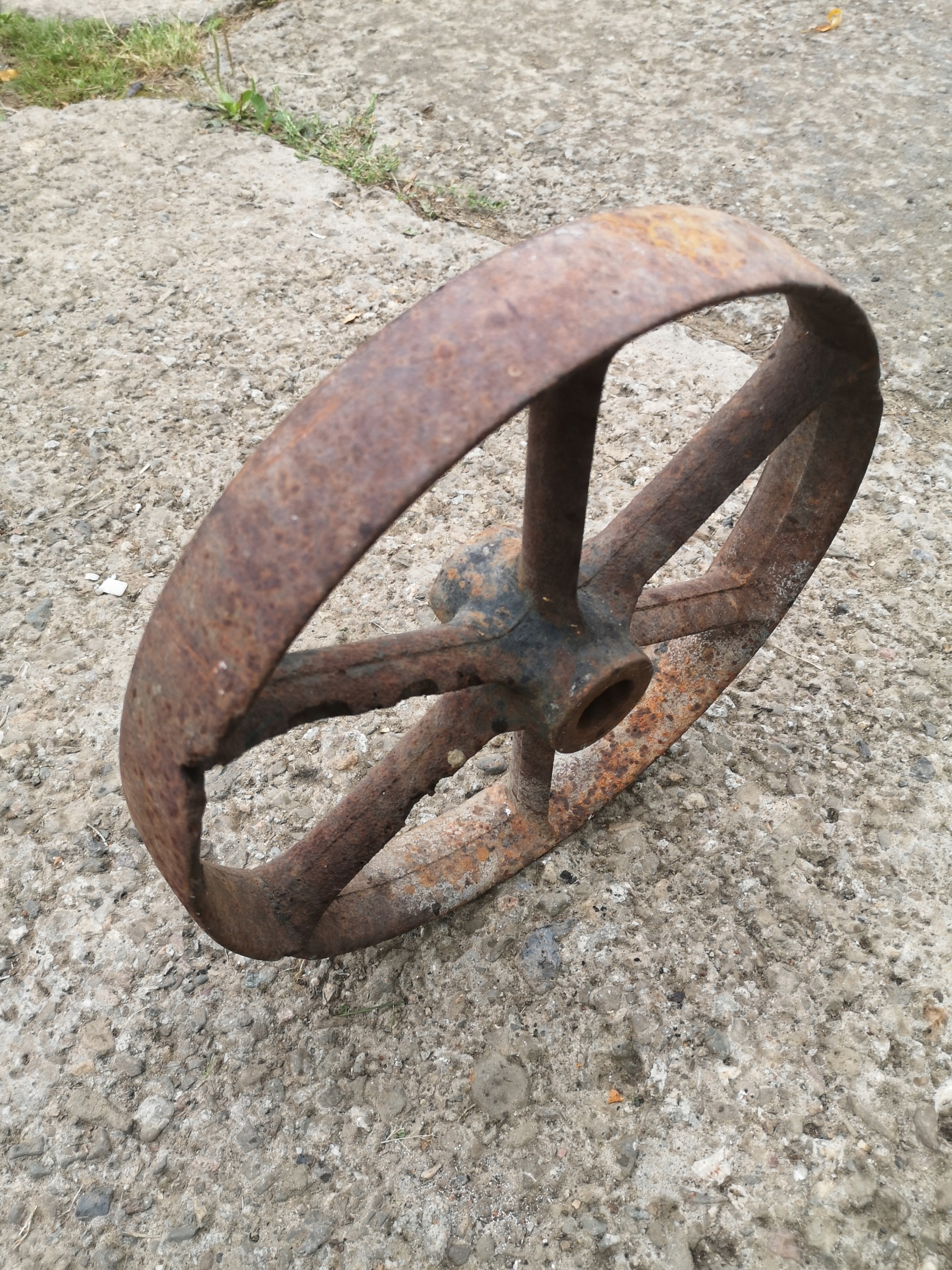 Стальное колесо без трещин в хорошем состоянии. Стальные руки из толстых стержней. Подходит для использования или украшения.