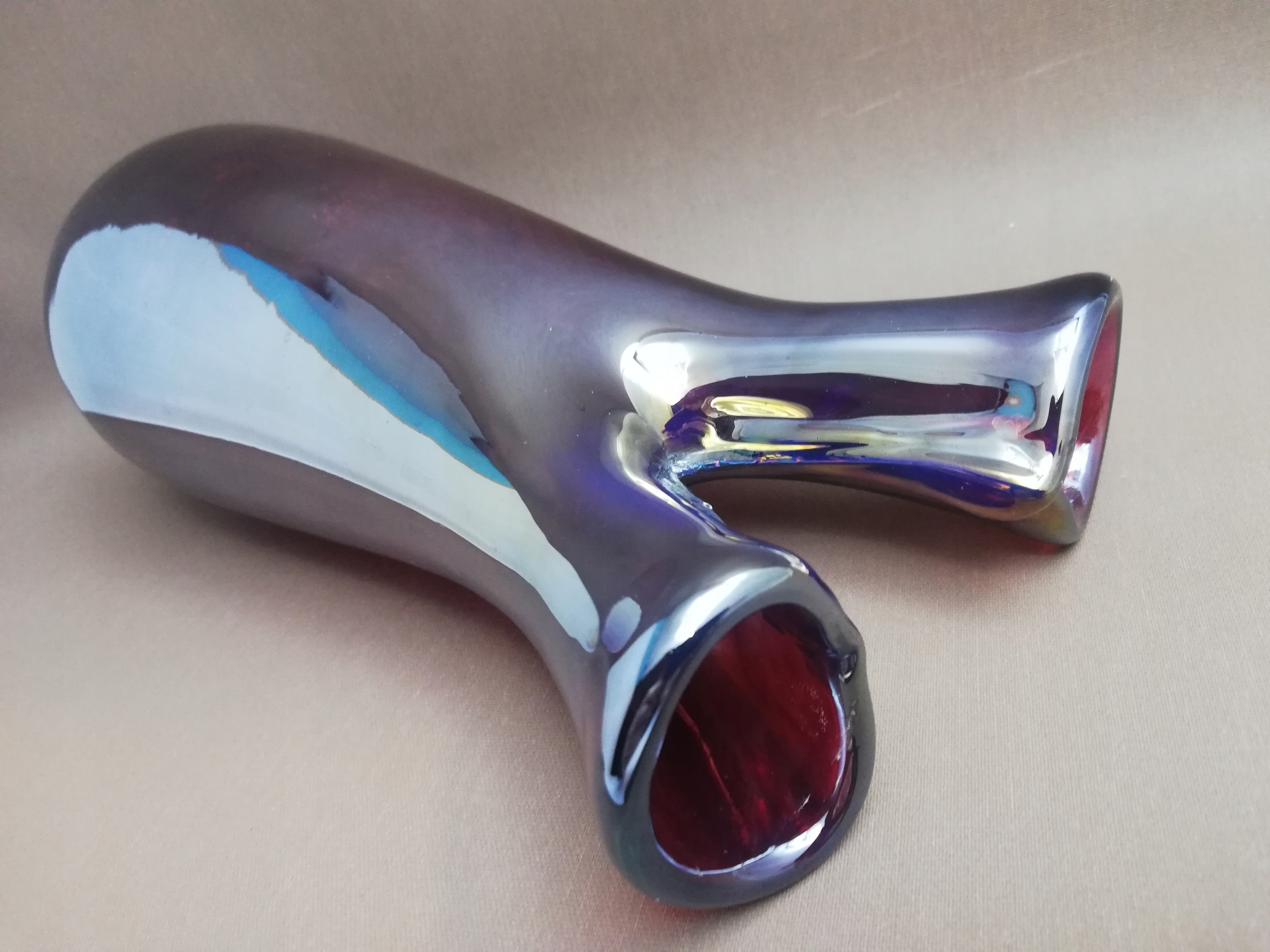 Интересная ваза старой коллекционеры, изготовленная из массового стекла, раздраженное стекло с оттенком, похожим на рубиновую, двойную инфузию