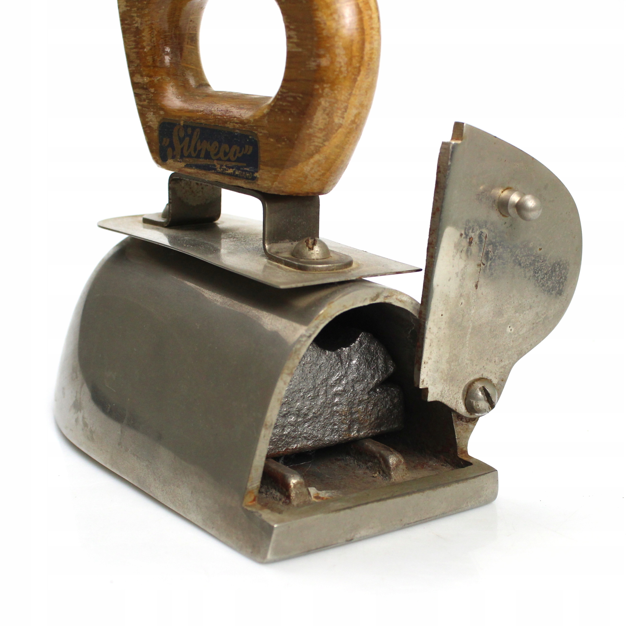 Описание: Очень старый утюг для души с открывающейся задней частью и символом «2» внутри. На деревянной ручке написано название «Sibreco Polska».