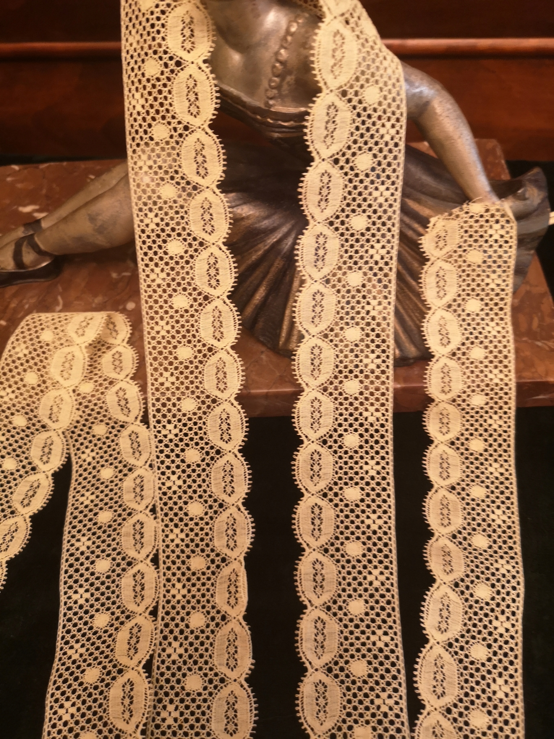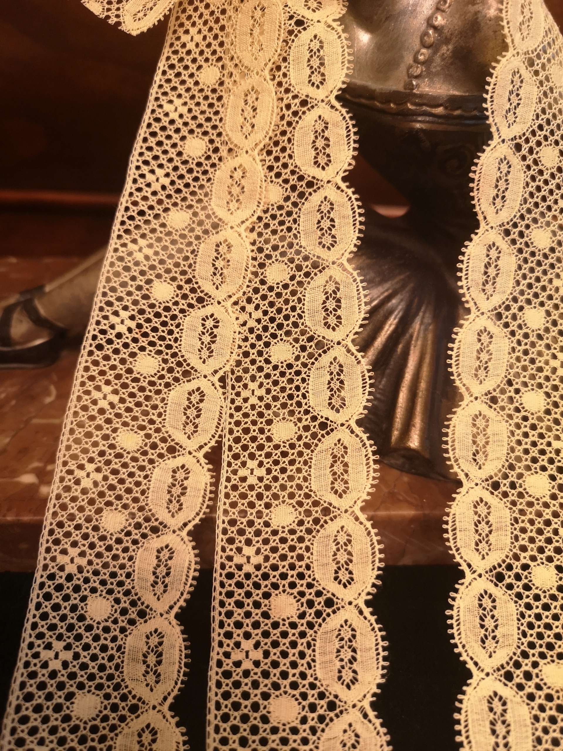 Нежное старинное кружево в тон, похожее на то, что на двух последних фото, вероятно, довоенное изделие. Ткань не обновлялась, выглядит неиспользованной, в хорошем состоянии. Шнурок еще крепкий, но из-за возраста появились потемнения и ржавые пятна. Размеры: 200 см х 3,5 см. Приглашаю вас принять участие в торгах и на других моих аукционах.