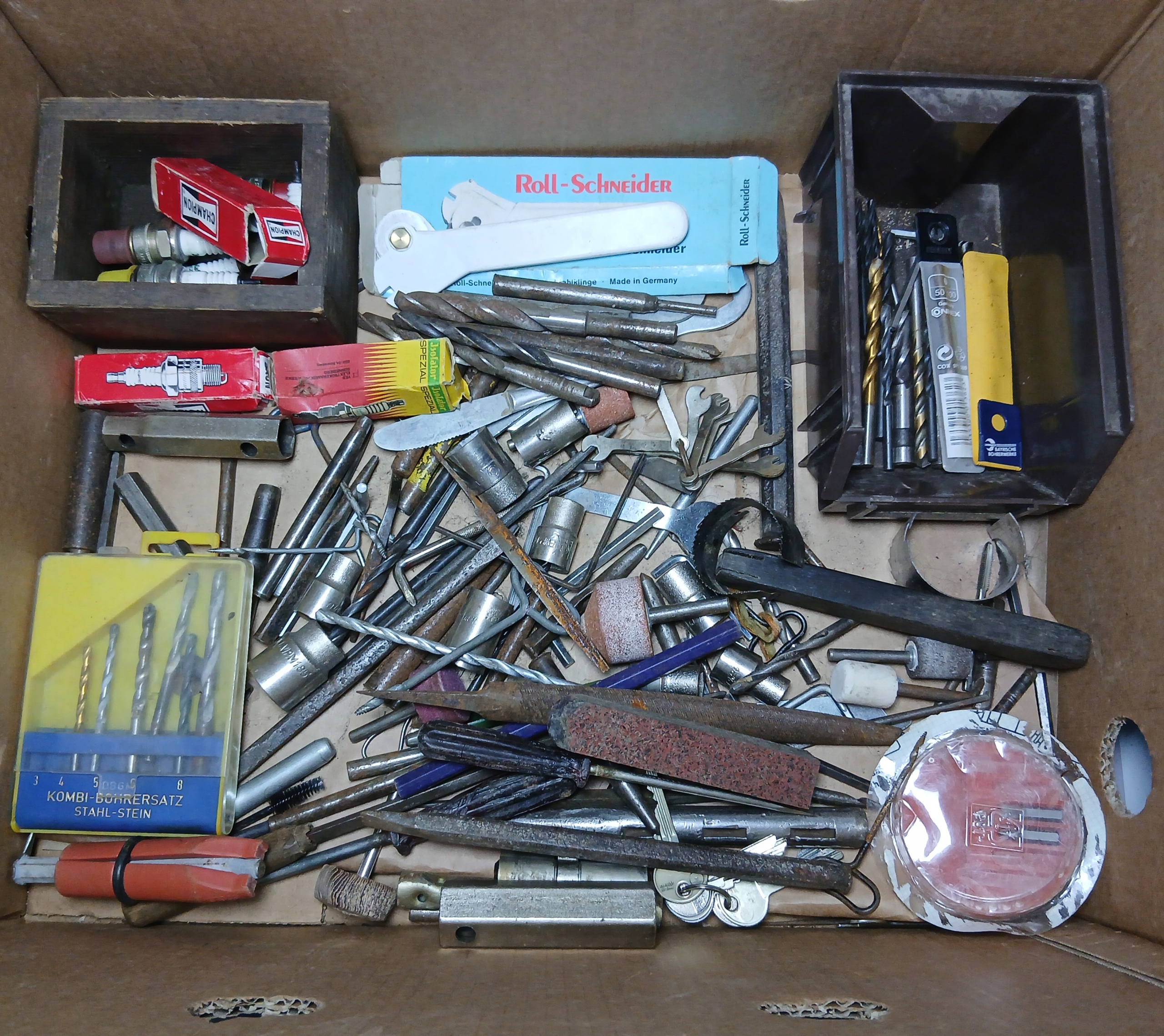 СТАРЫЙ ИНСТРУМЕНТАЛЬНЫЙ КАРТОН С ДЕТАЛЯМИ, СВЕРЛАМИ И ДРУГИМ