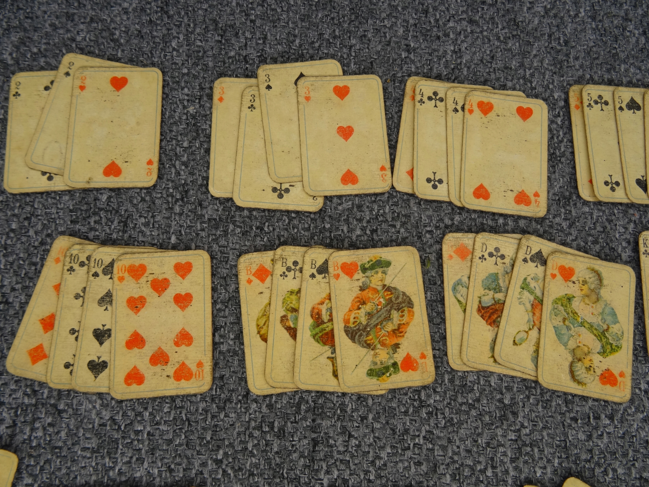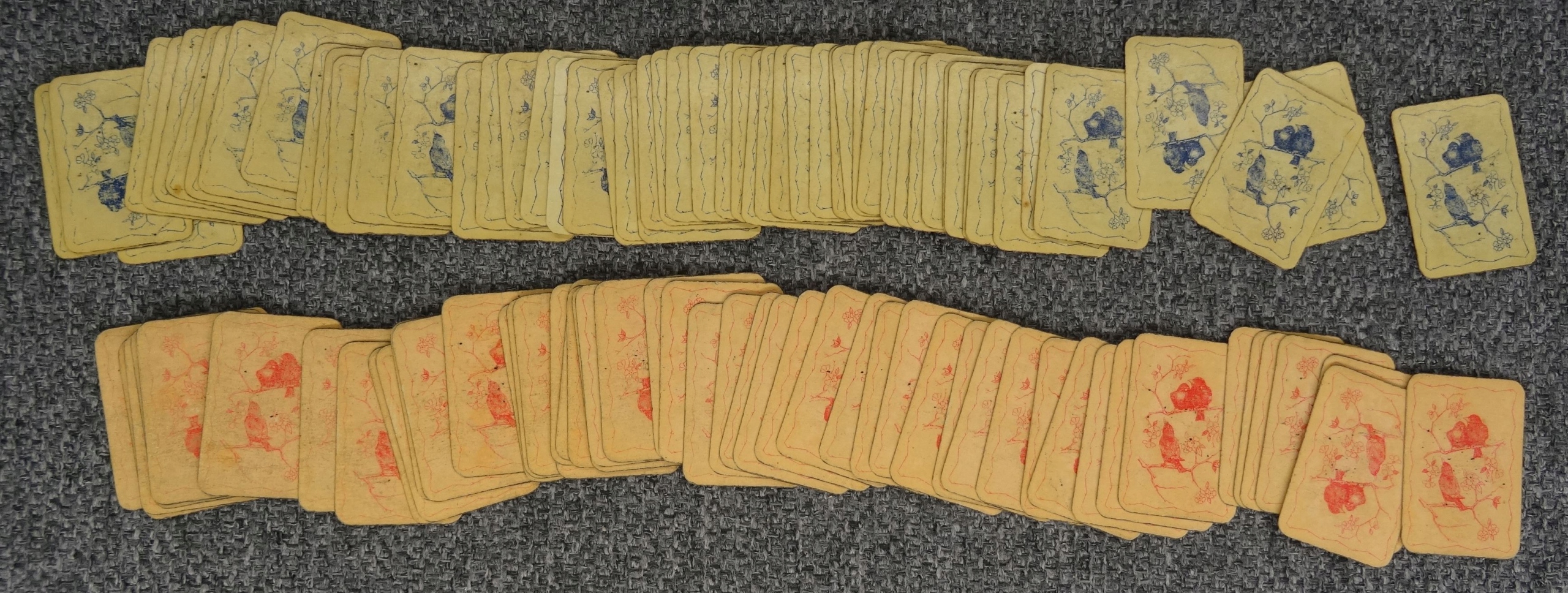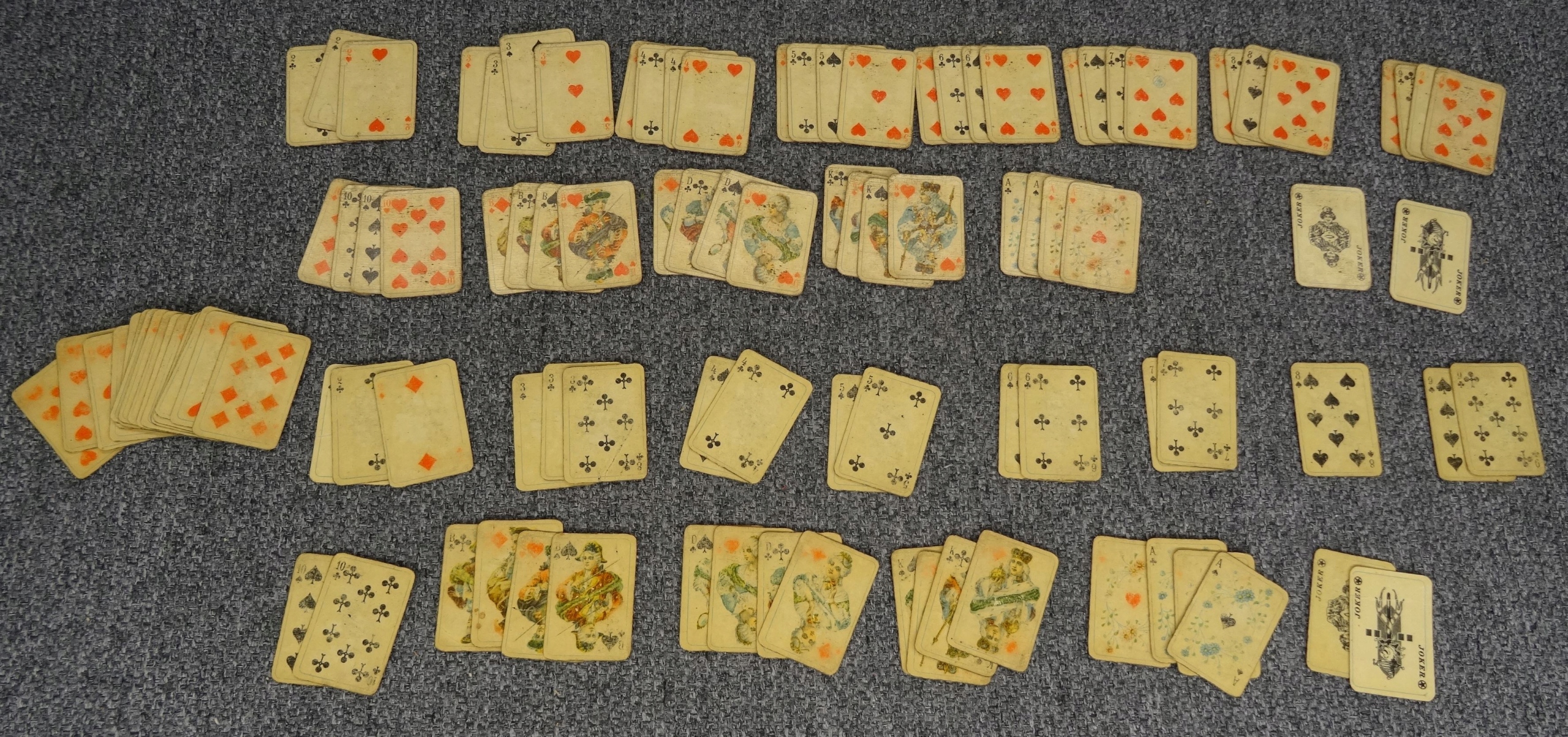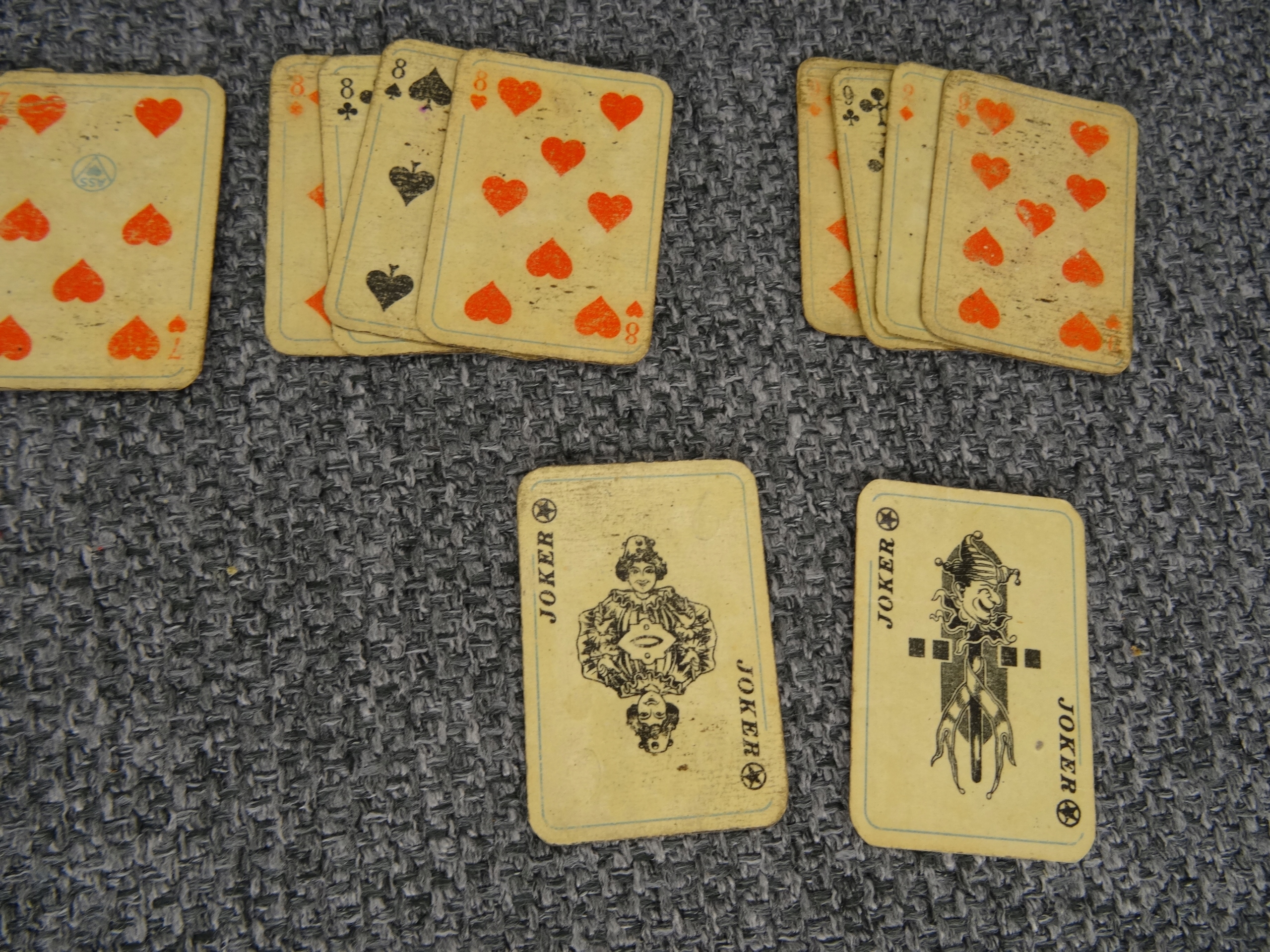 Старые маленькие игральные карты, две колоды. Одна 54 карты, другая 53 карты.