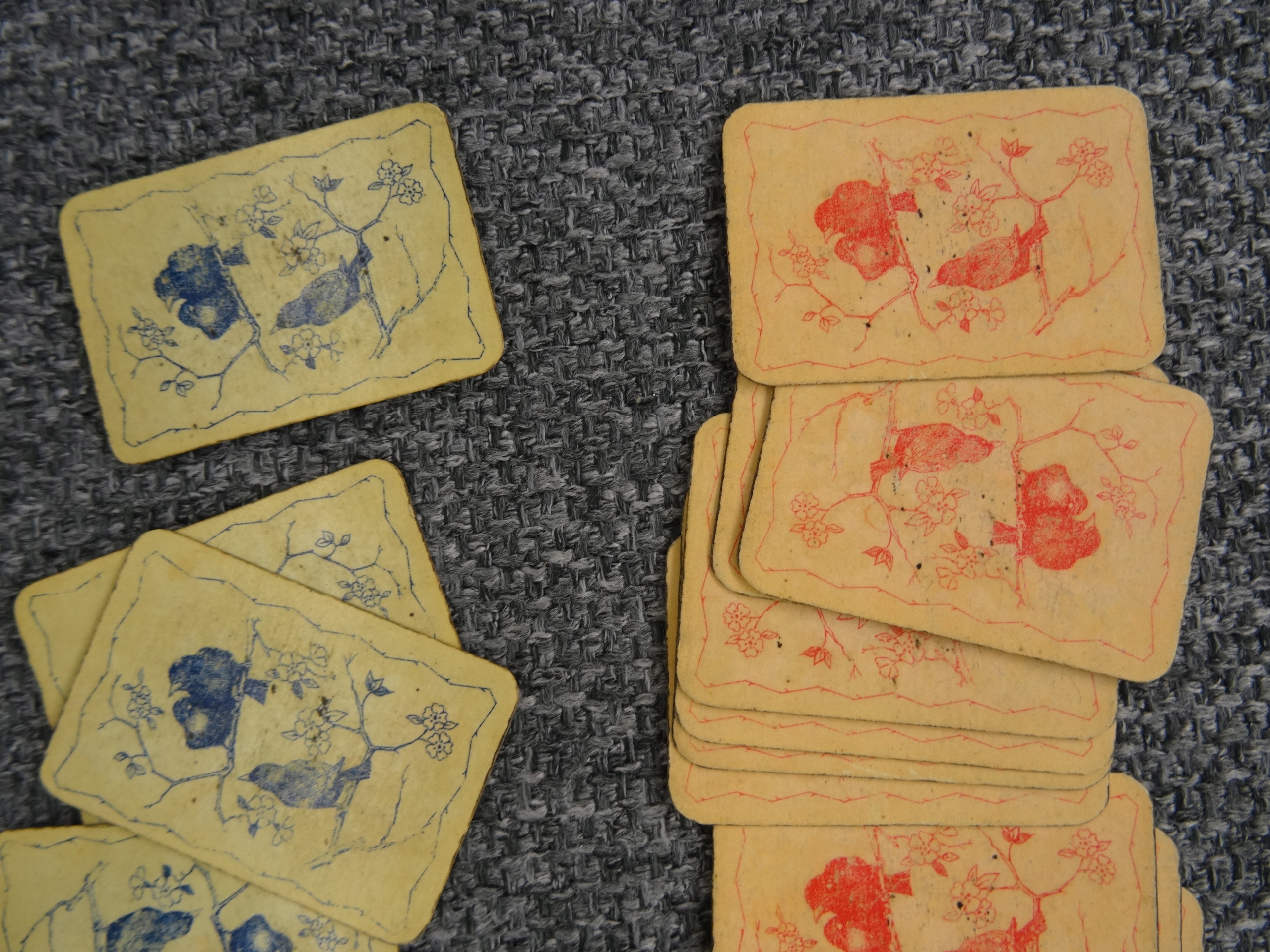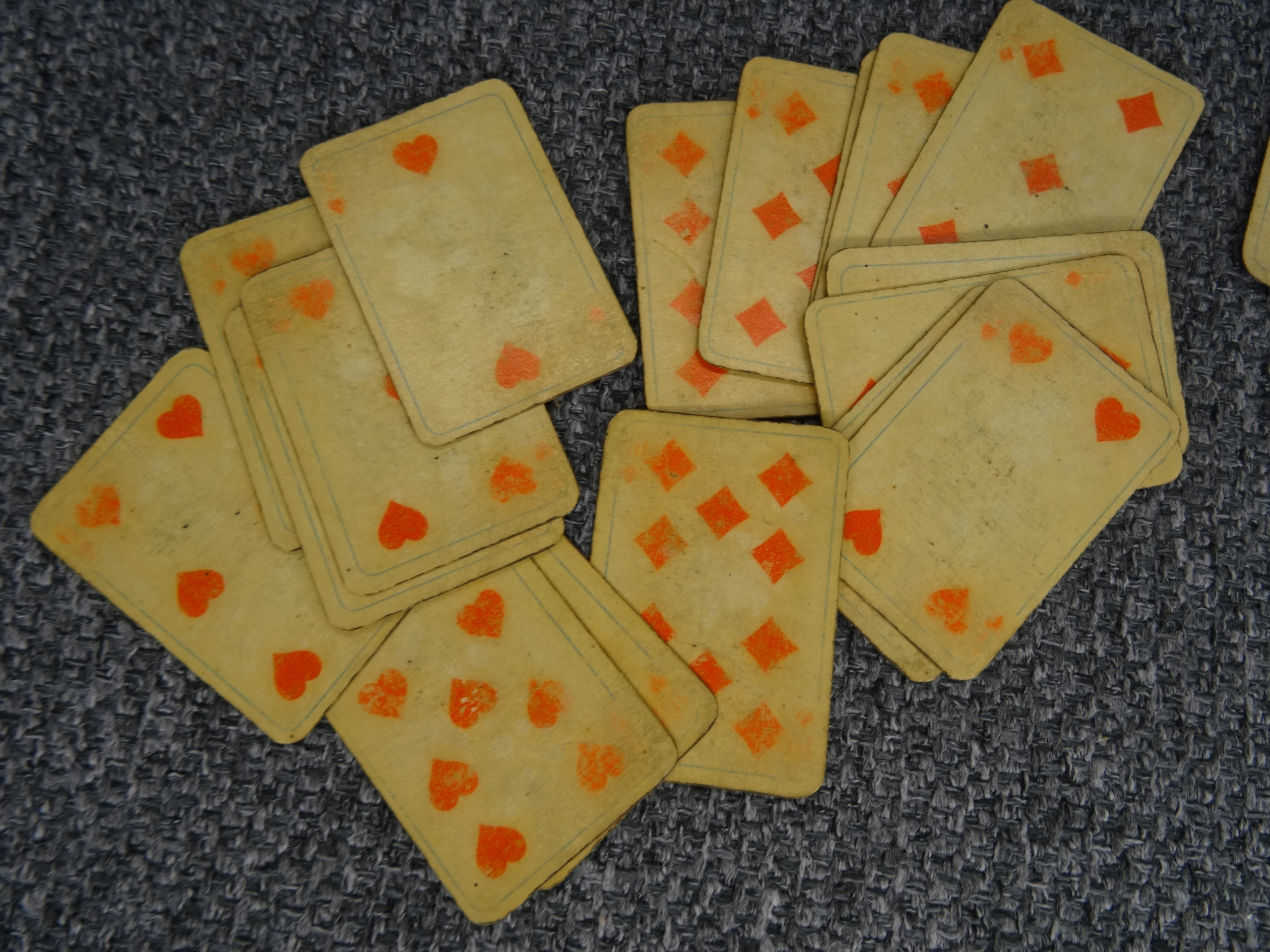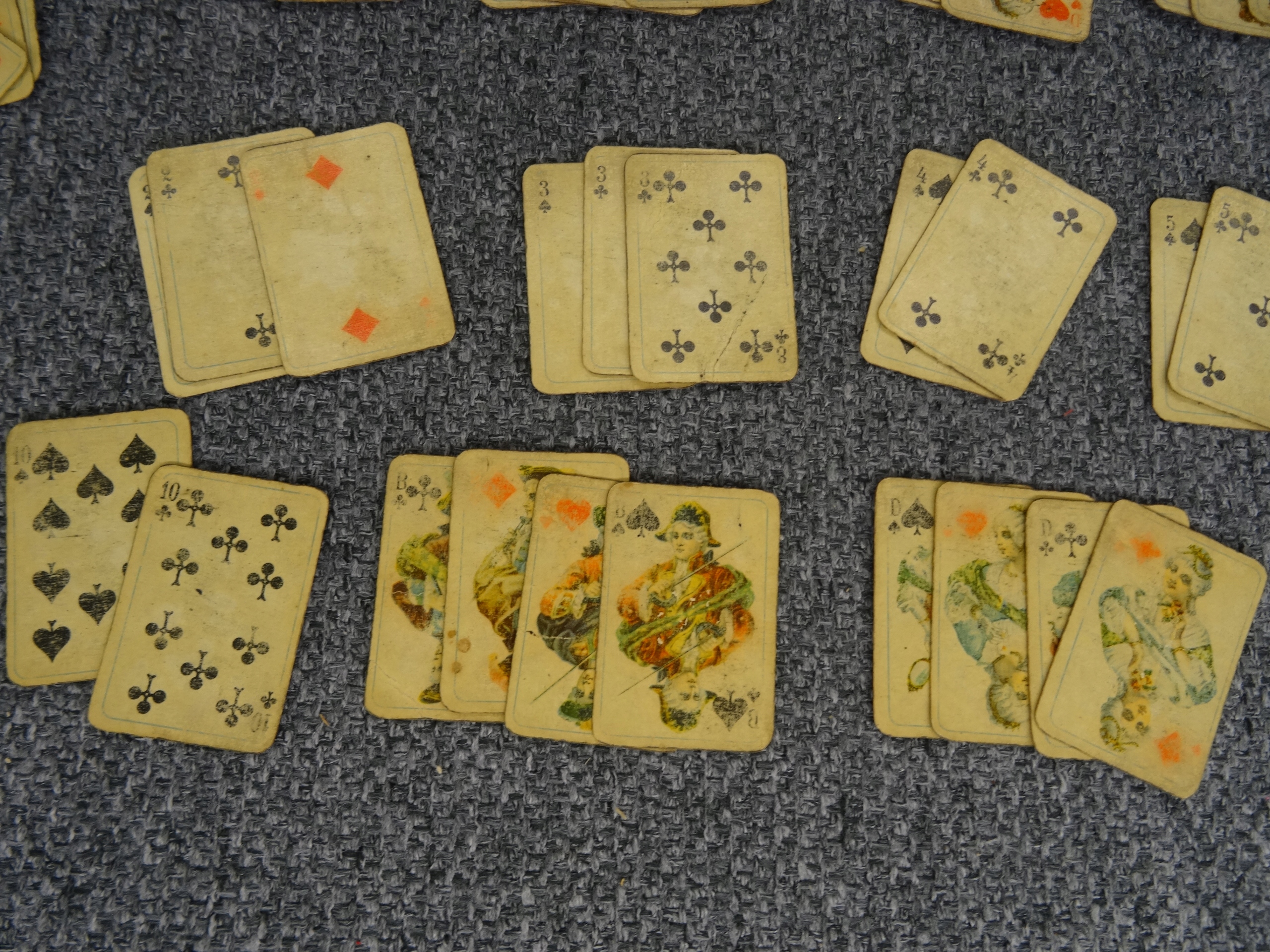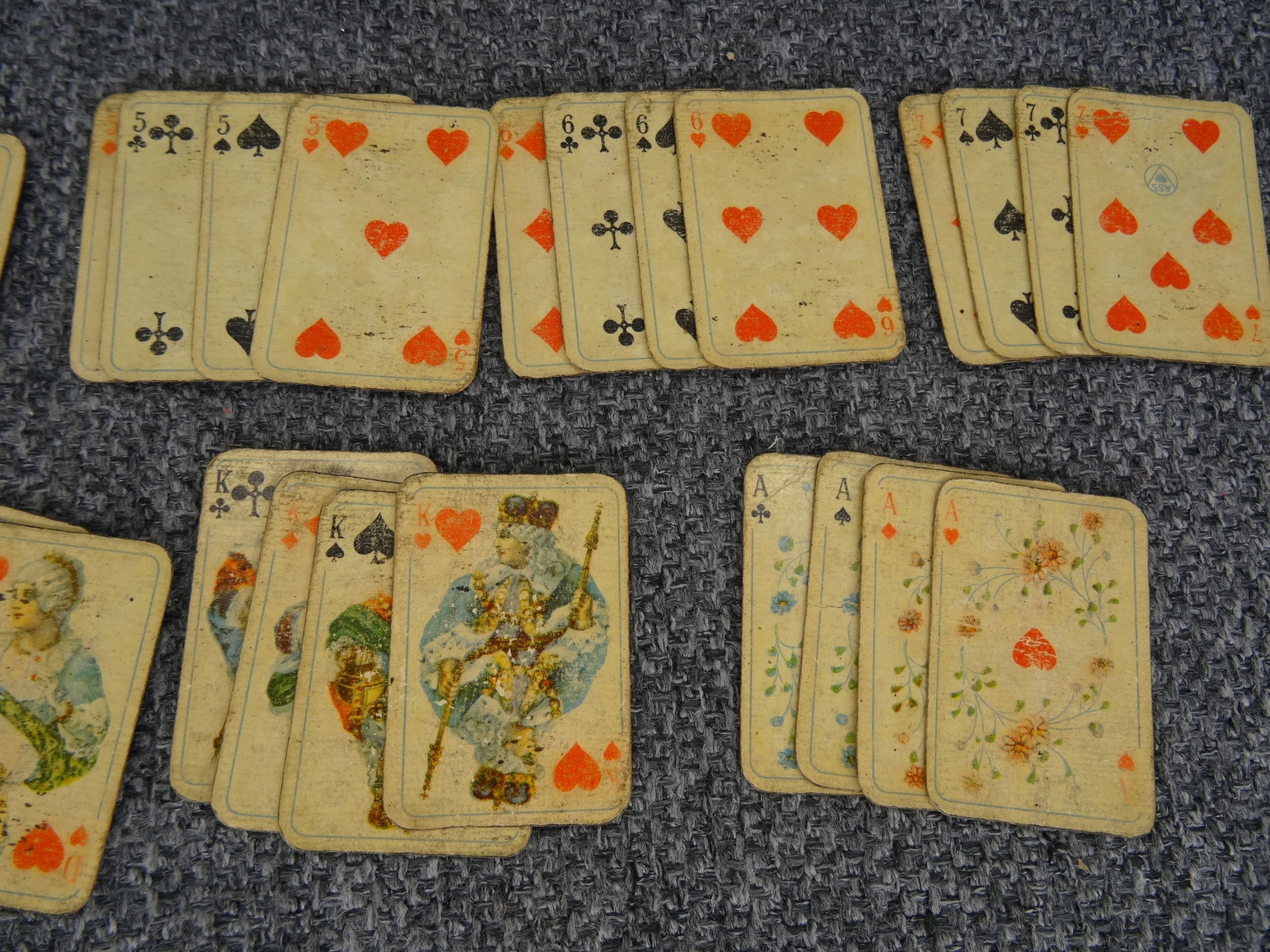 Старые маленькие игральные карты, две колоды. Одна 54 карты, другая 53 карты.