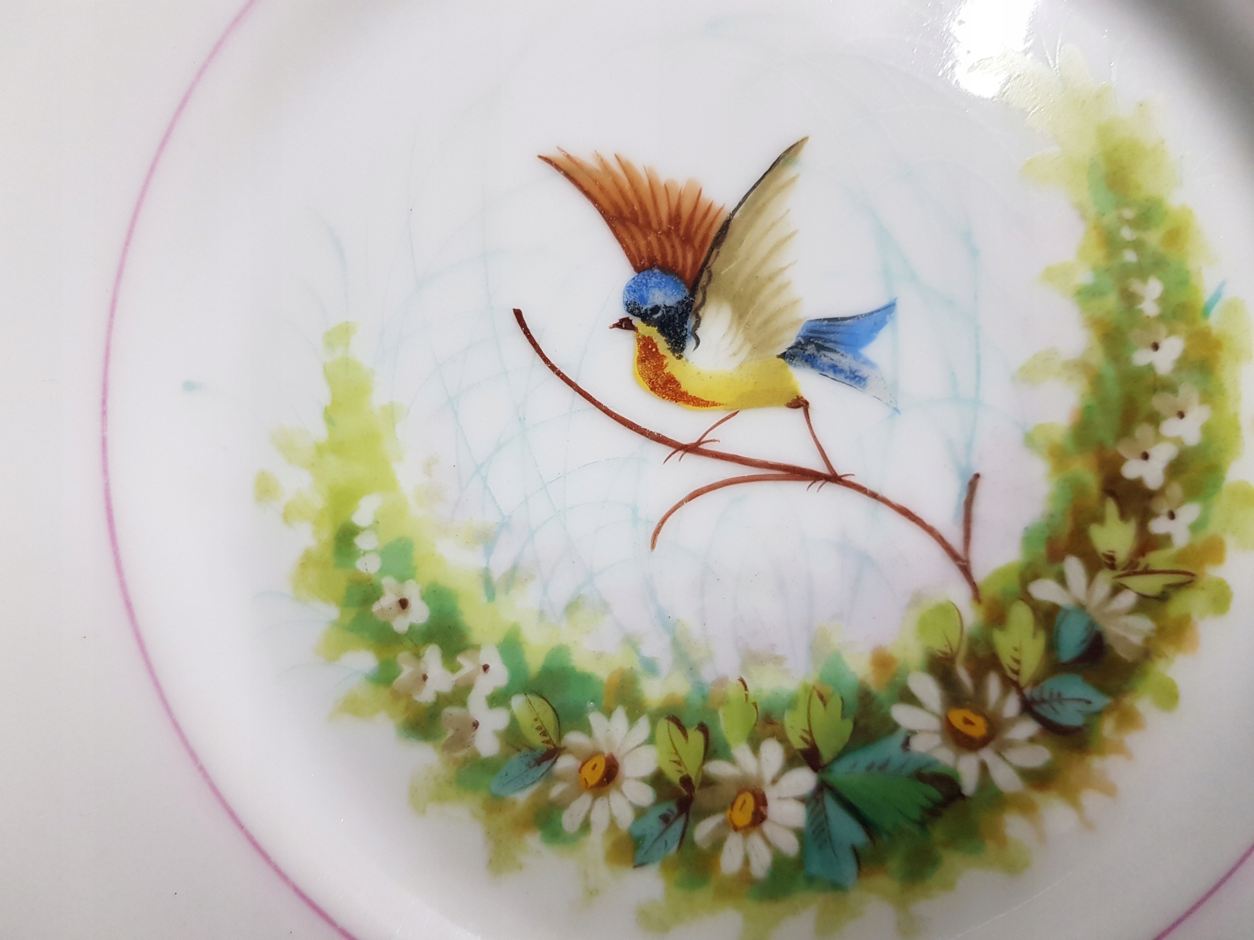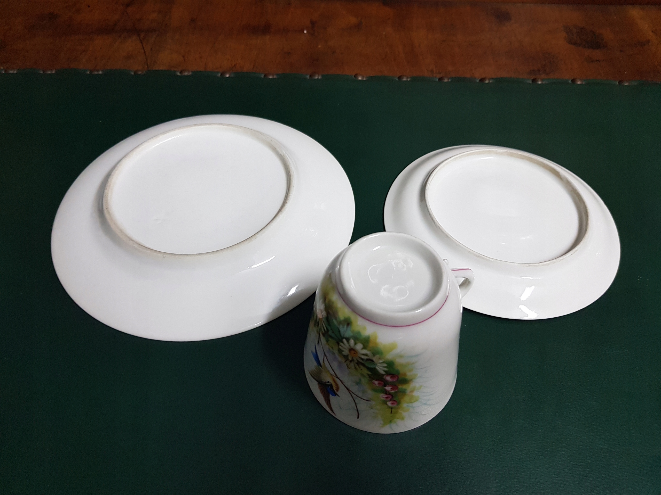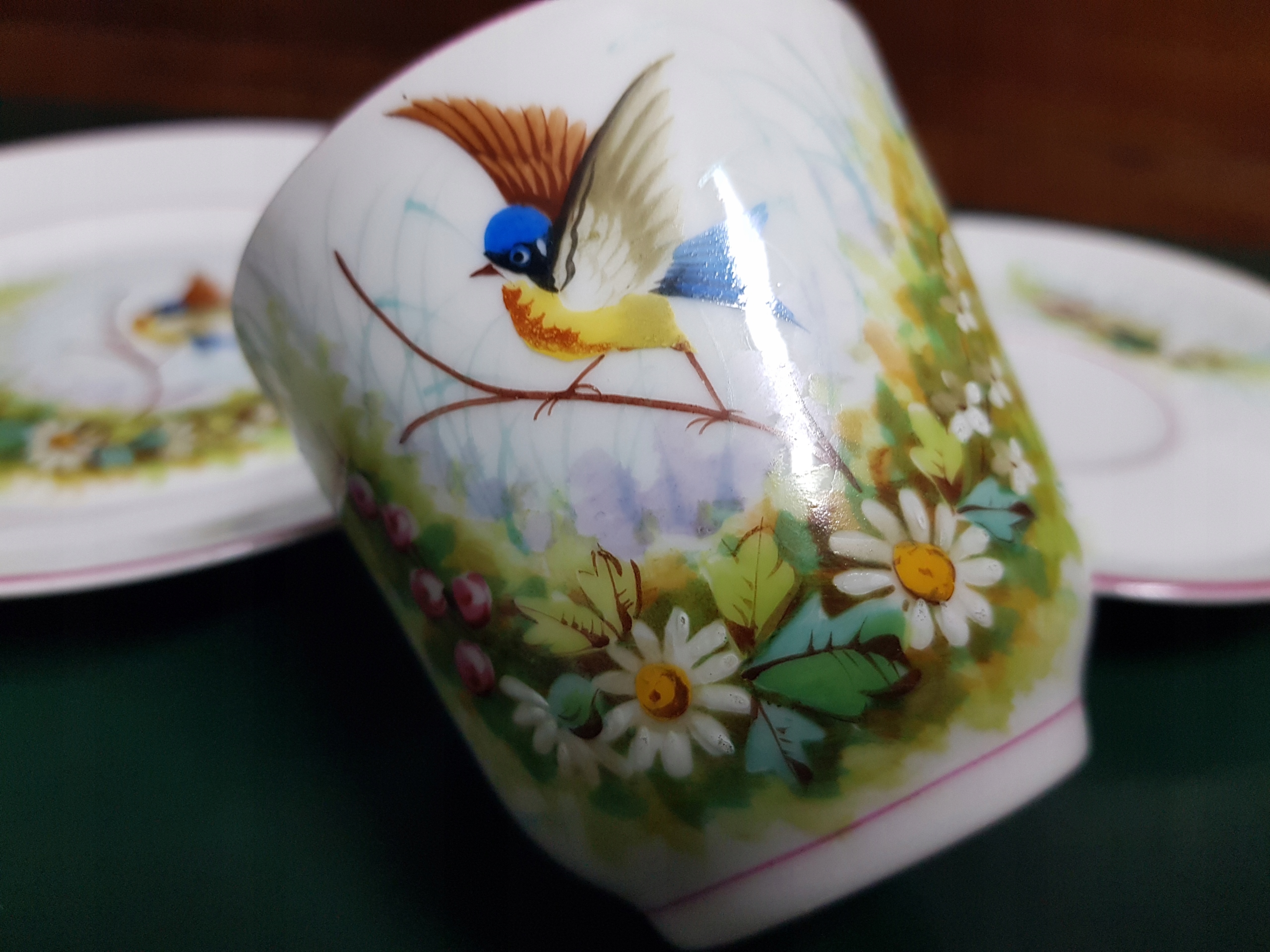 Предмет аукциона — расписанный вручную набор для завтрака с мотивом цветов и птиц. Белый фарфор.