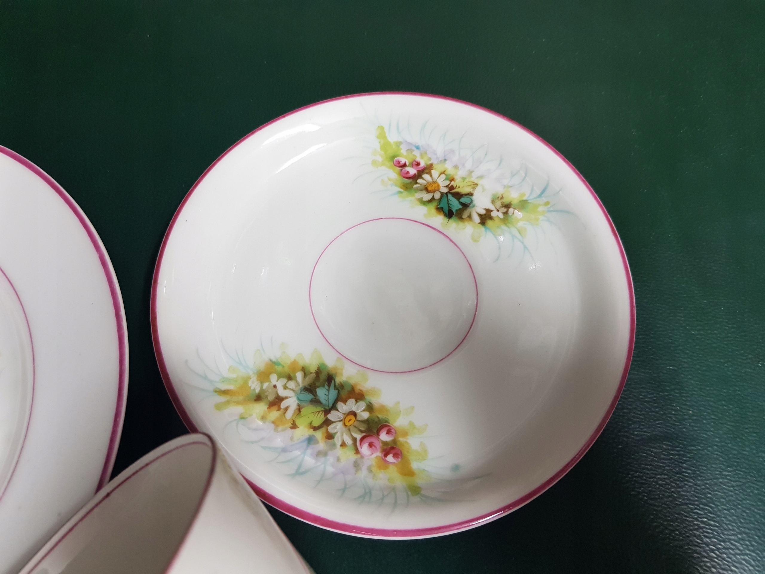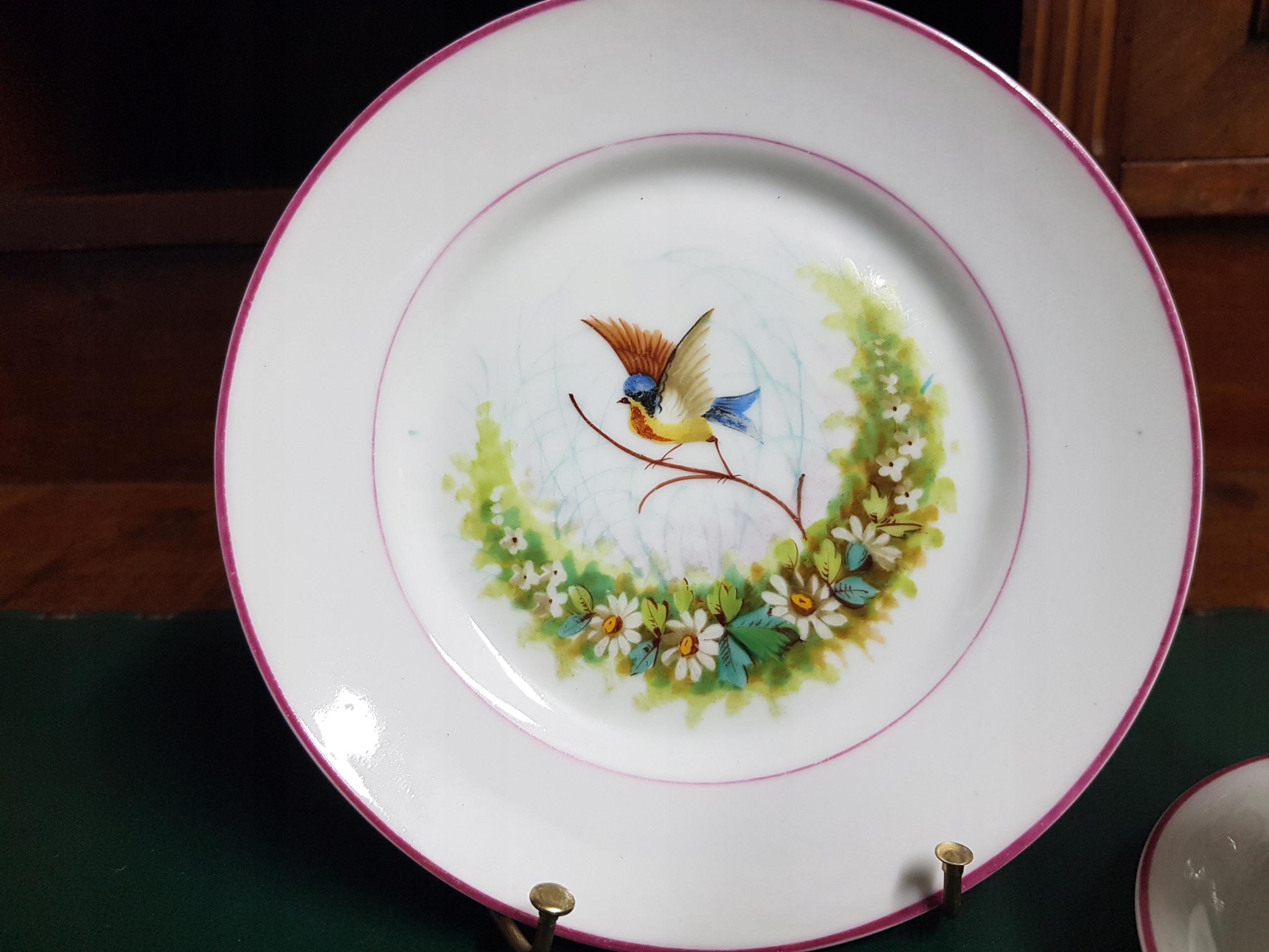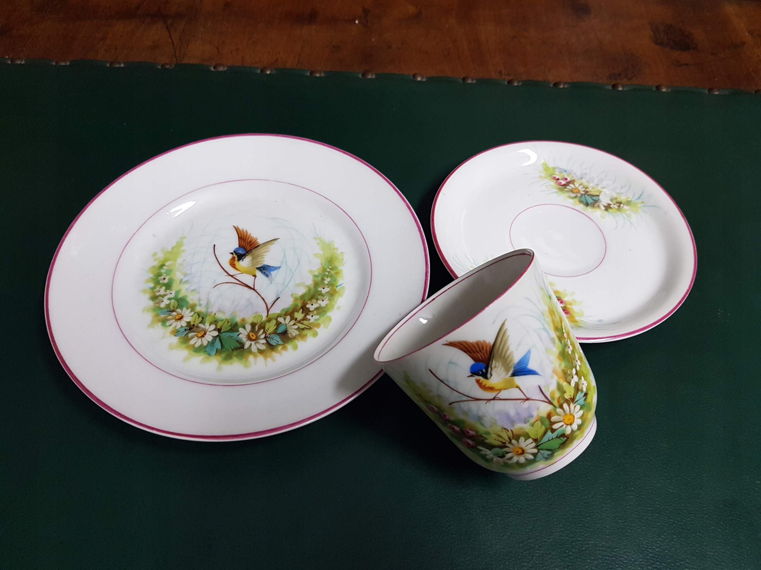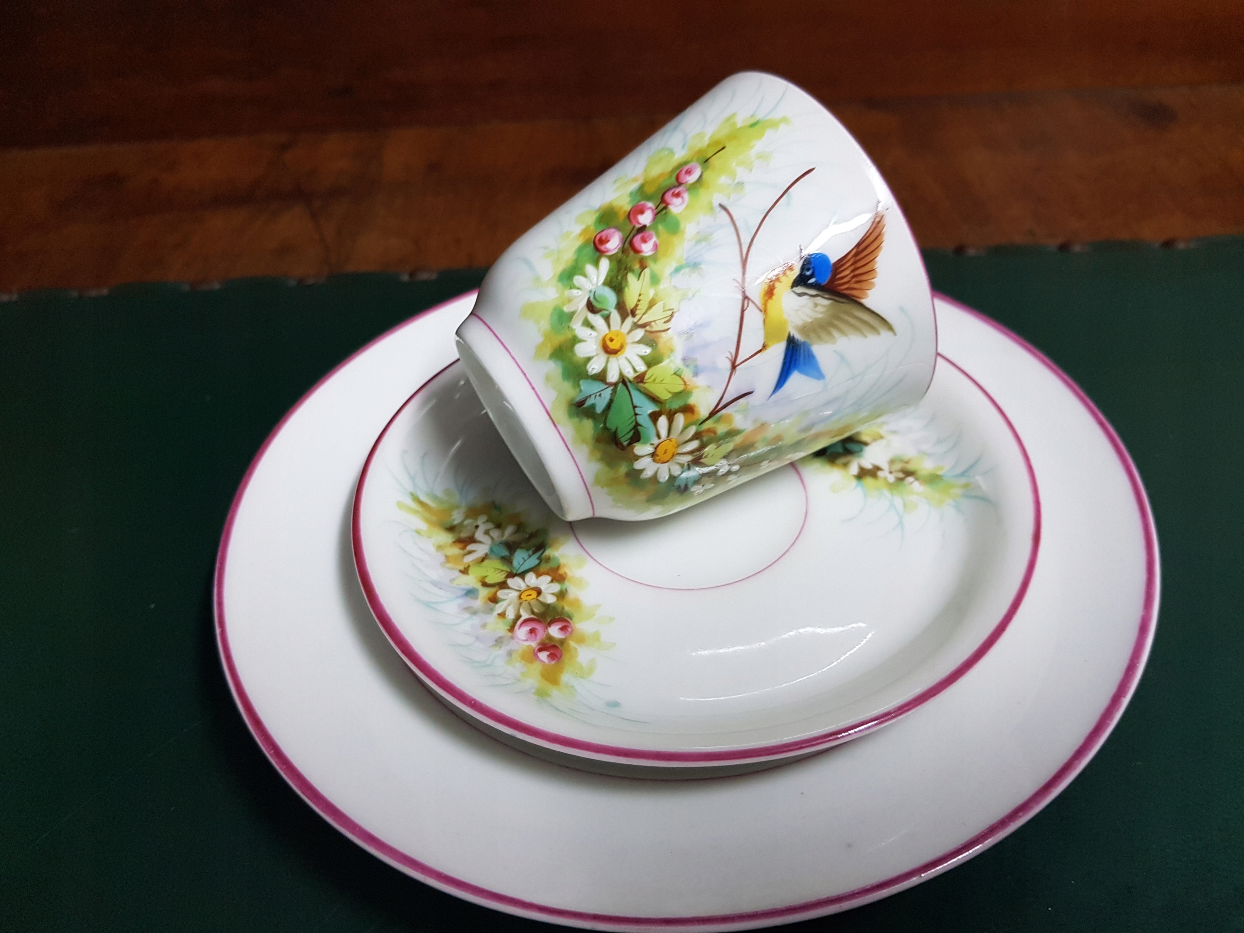 Предмет аукциона — расписанный вручную набор для завтрака с мотивом цветов и птиц. Белый фарфор.