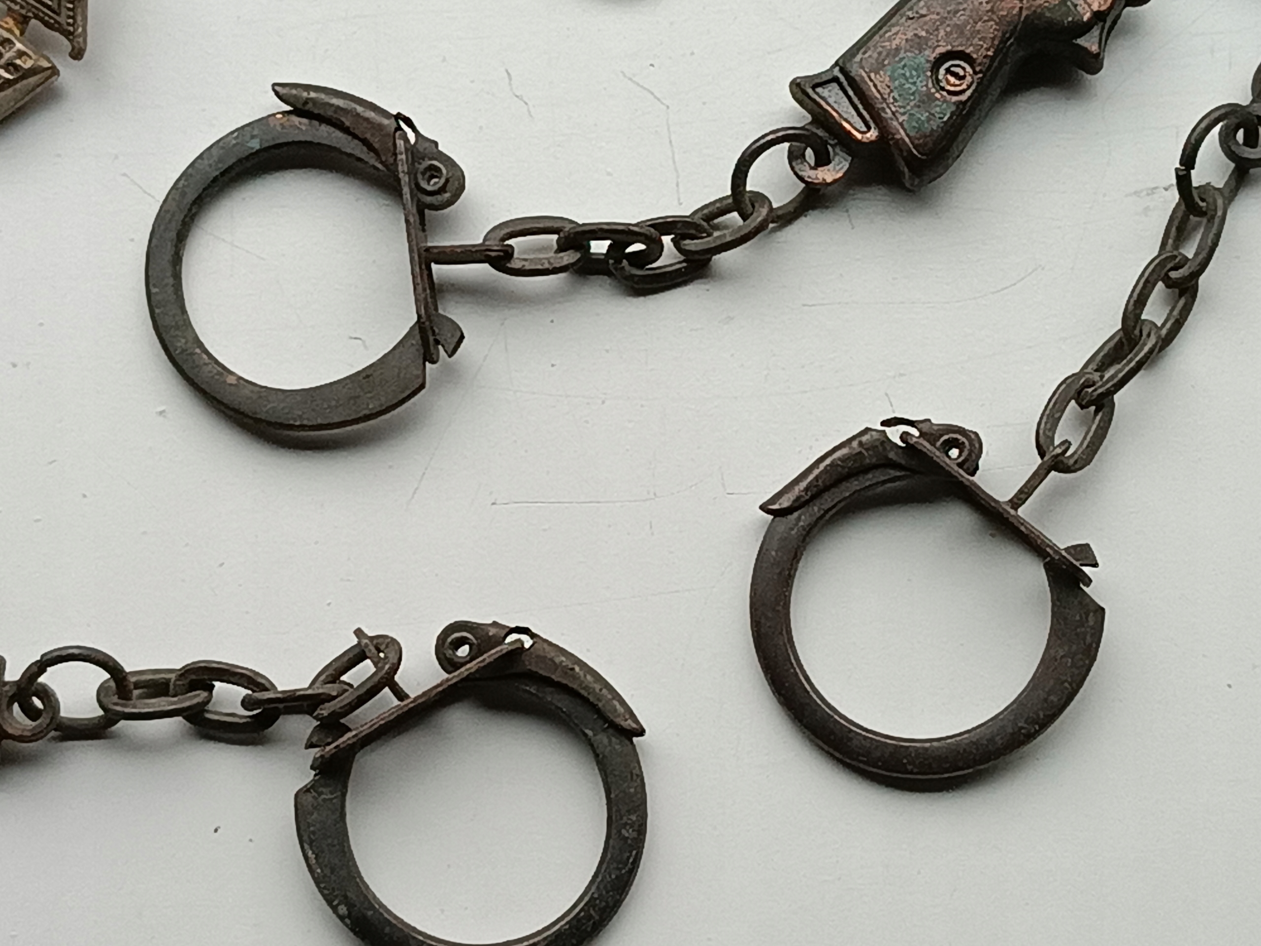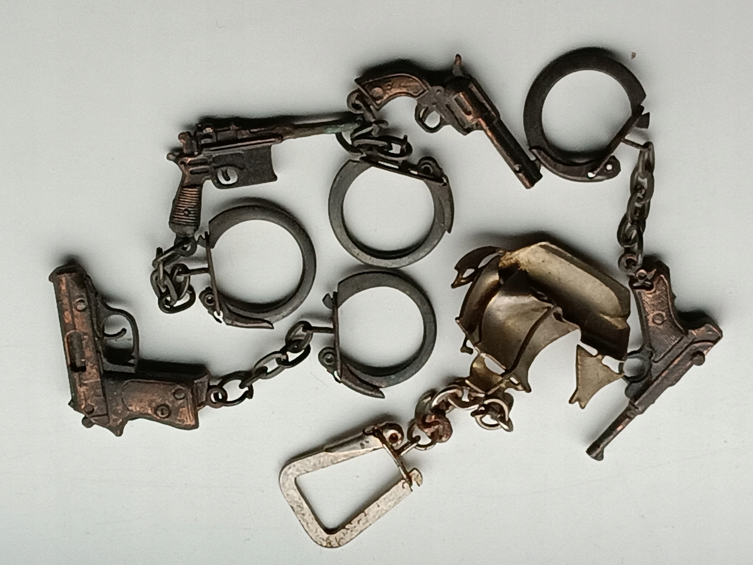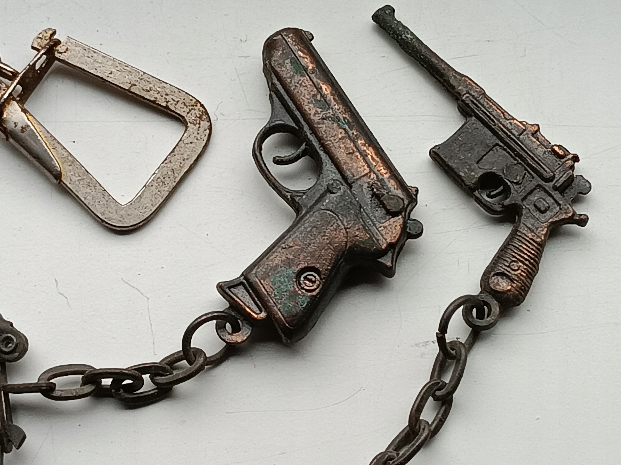 Старые стильные металлические брелки с миниатюрными пистолетами + корабль