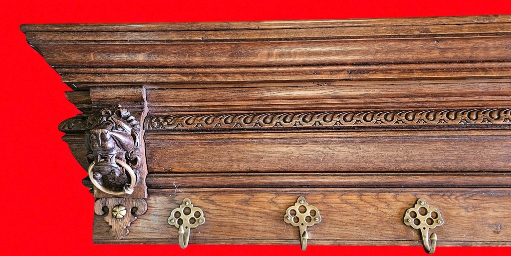 Вешалка из старинного дуба с латунными крючками в виде львиной головы, длина 147 см.