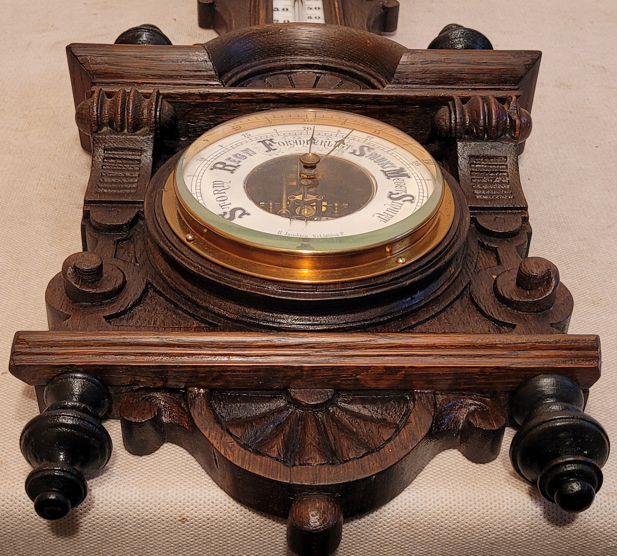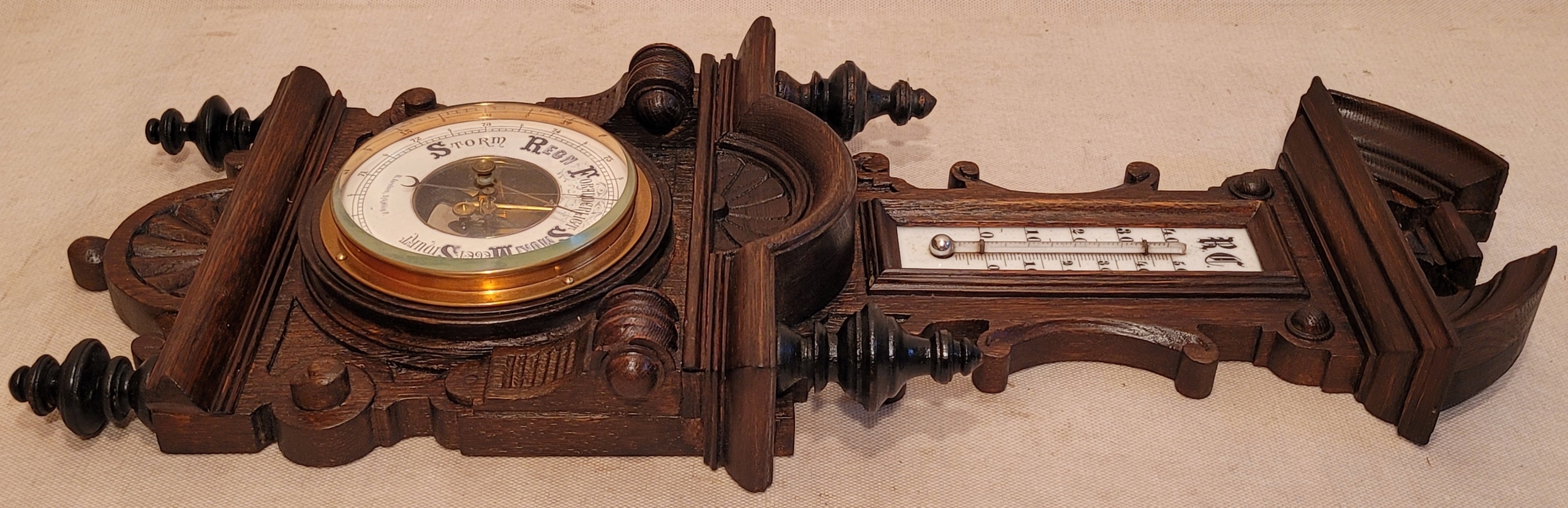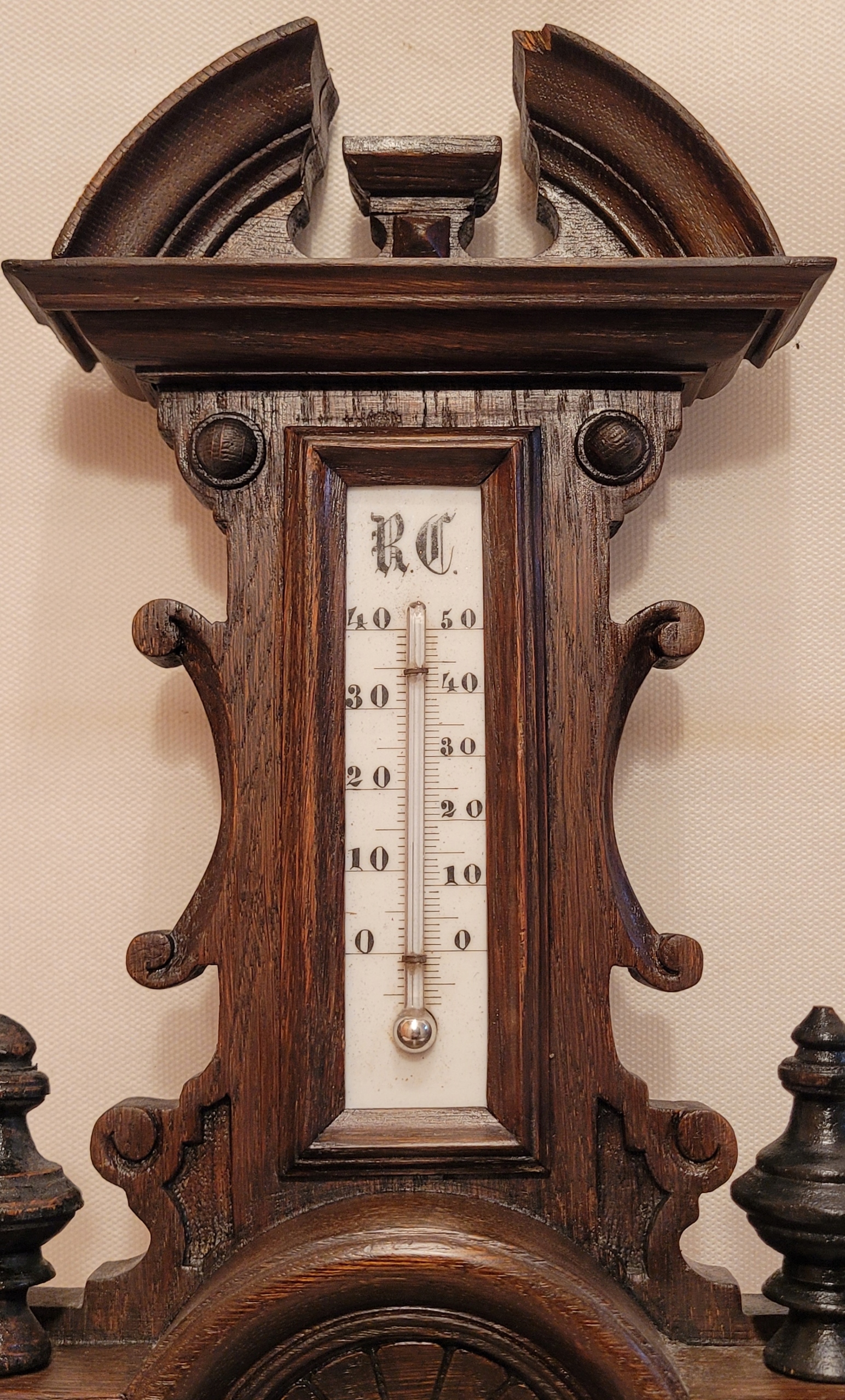 Тема продажи - старый барометр с термометром в деревянной раме.