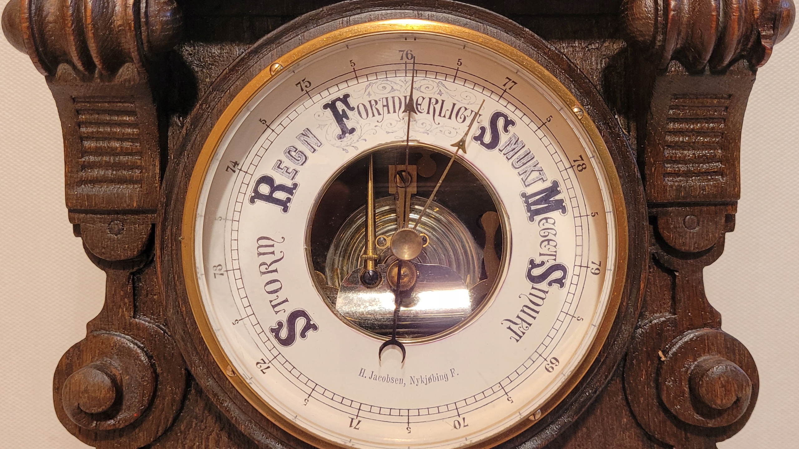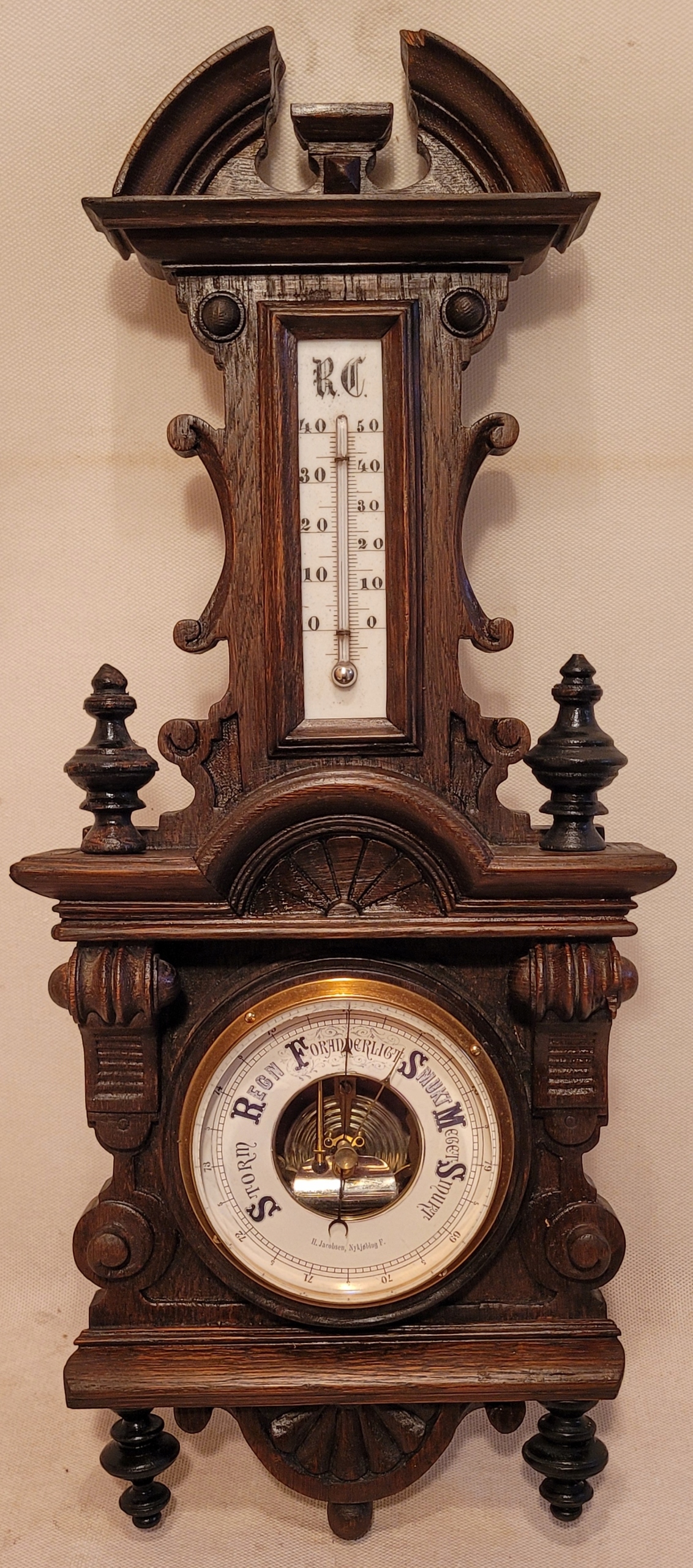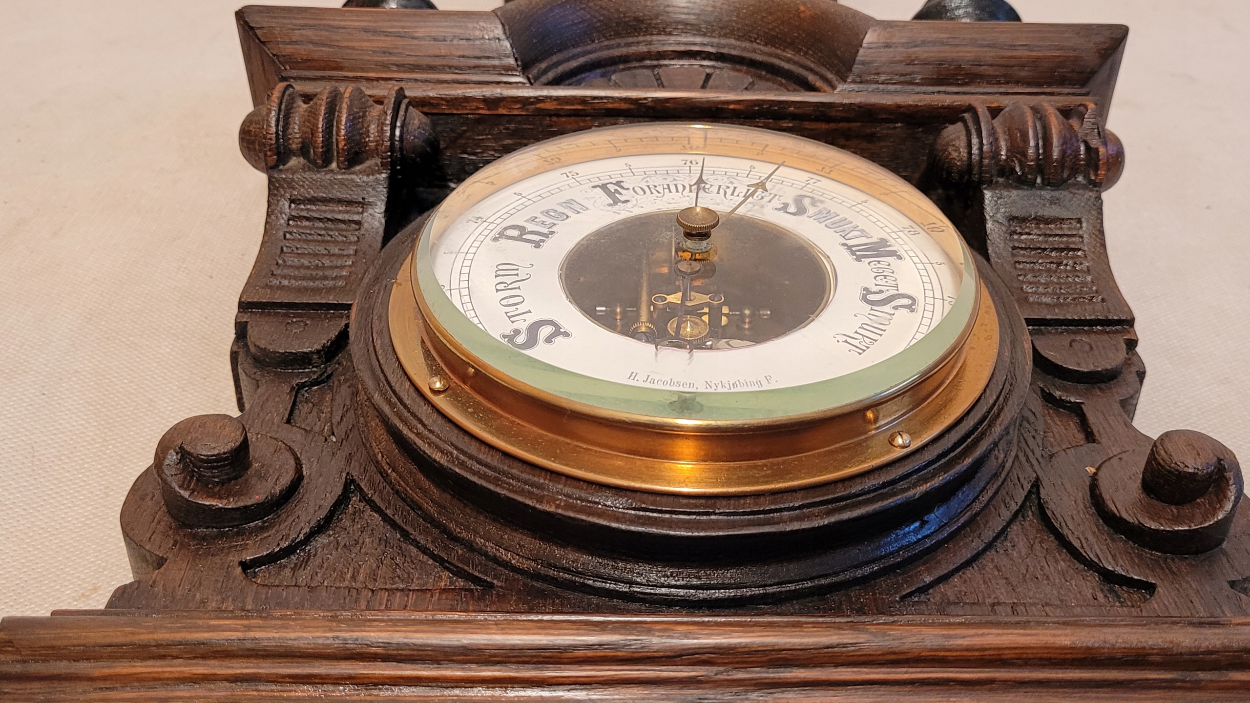Тема продажи - старый барометр с термометром в деревянной раме.