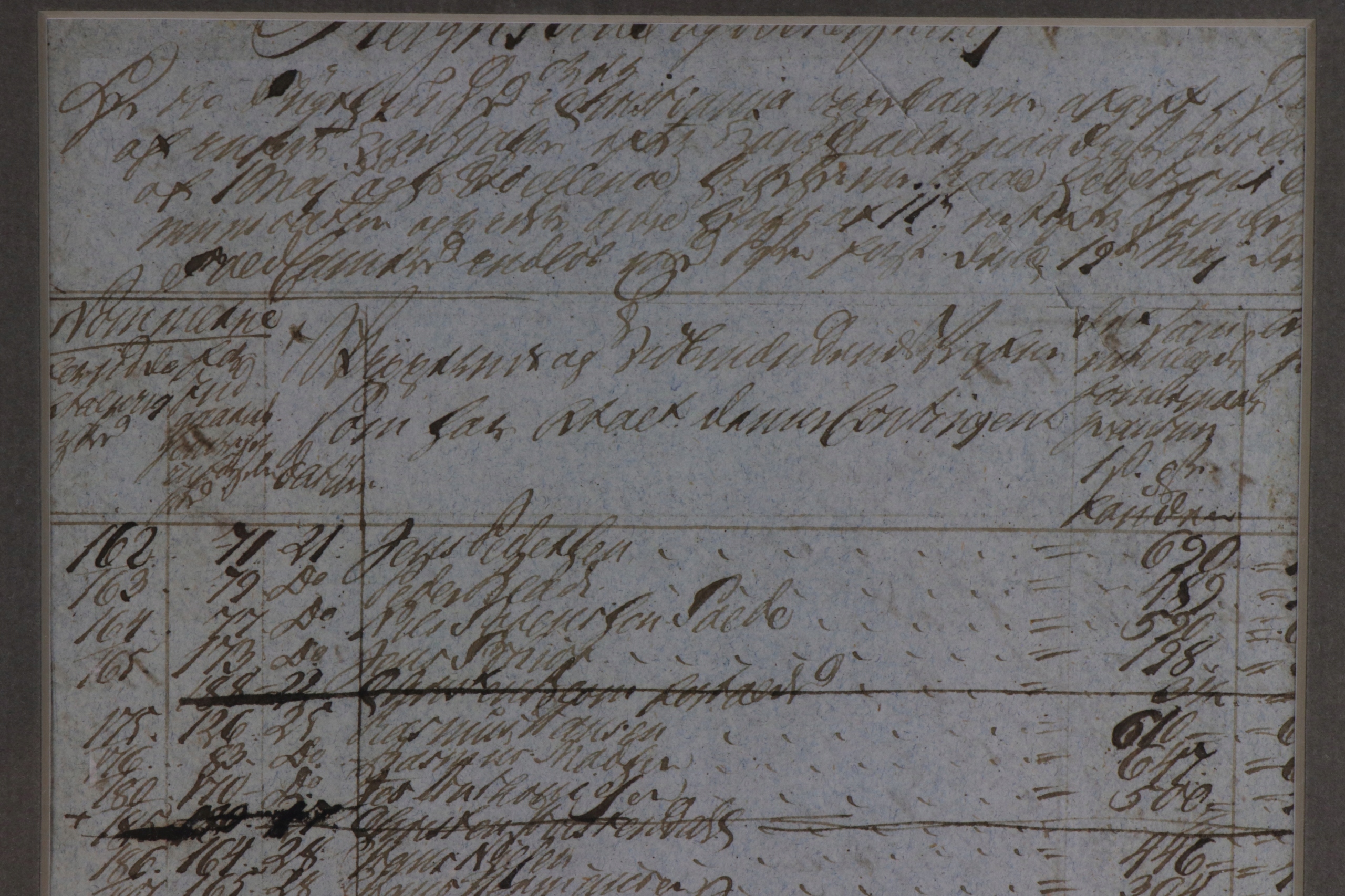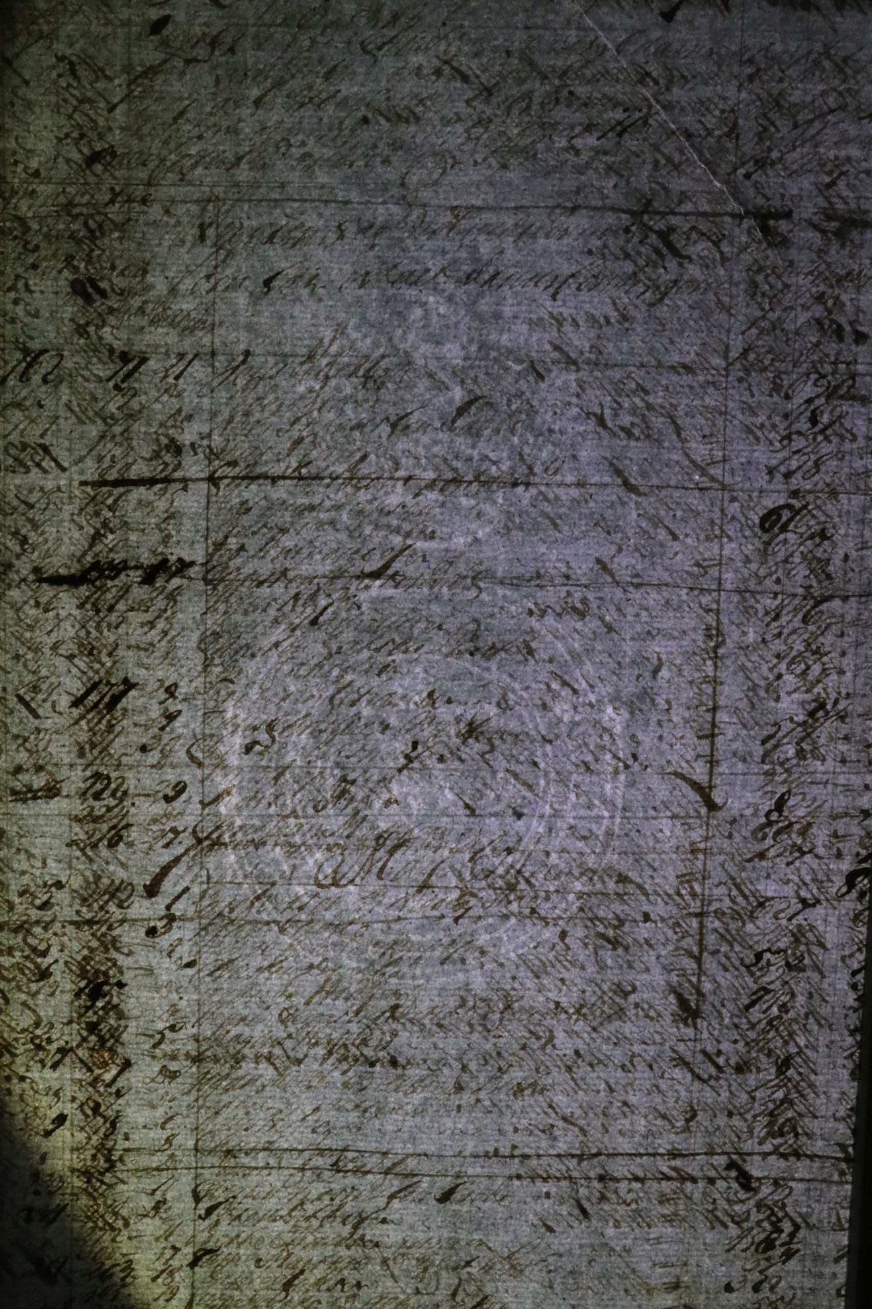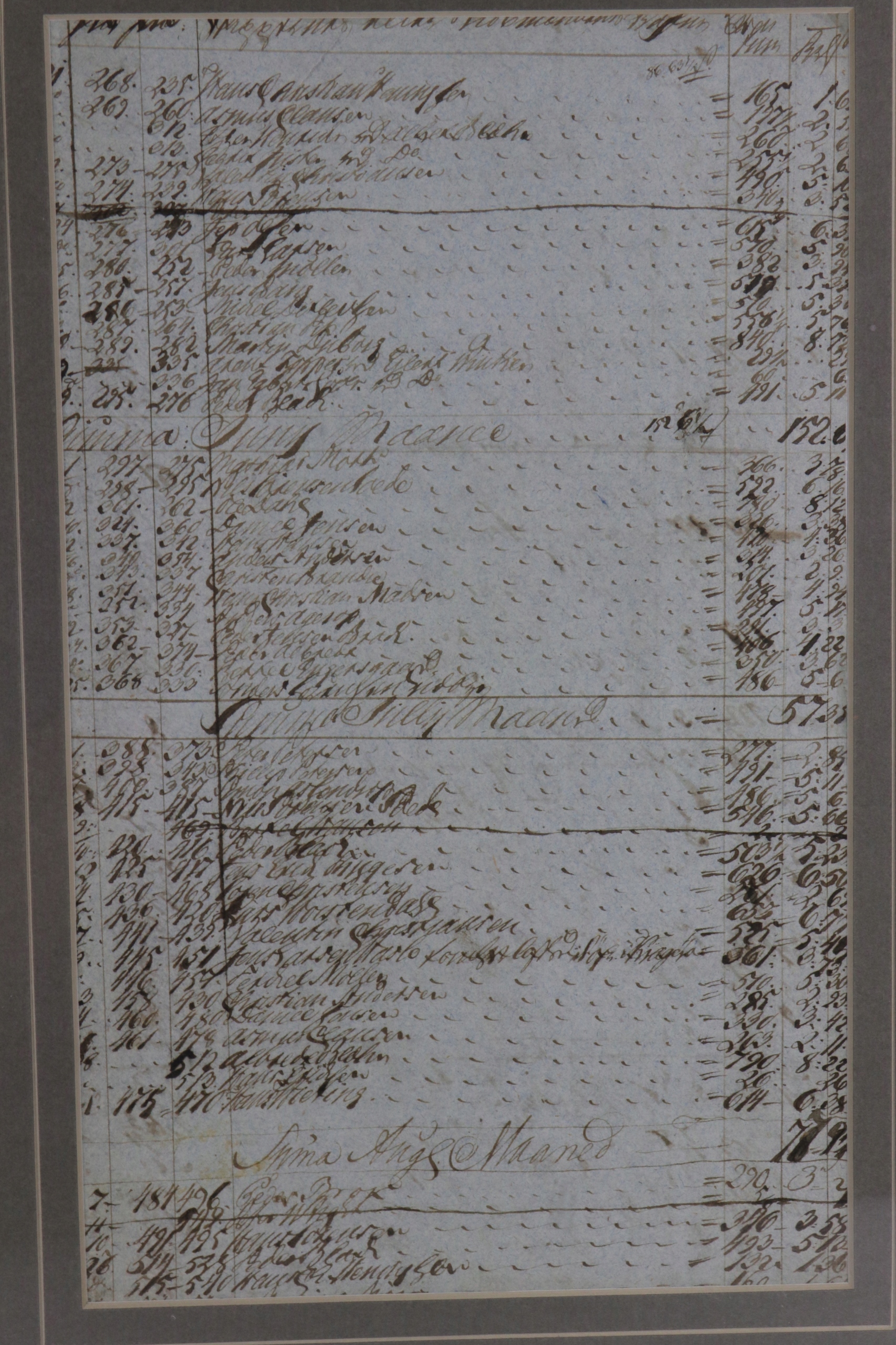 Интересный, очень старый бухгалтерский документ (?). Старая бумага ручной работы с фабричной филигранью. Документ написан чернилами и имеет вид бухгалтерского или официального документа (?). Бумага оформлена в рамку за стеклом и имеет двустороннее паспарту.