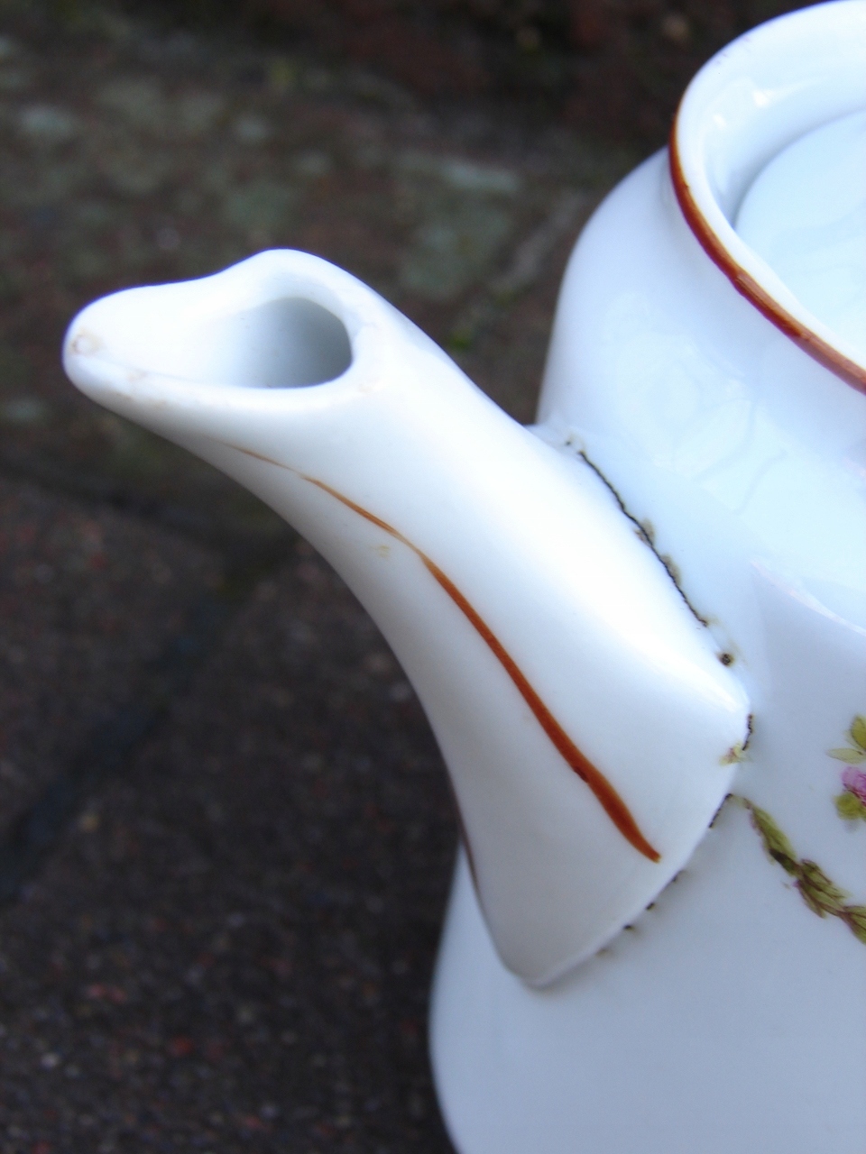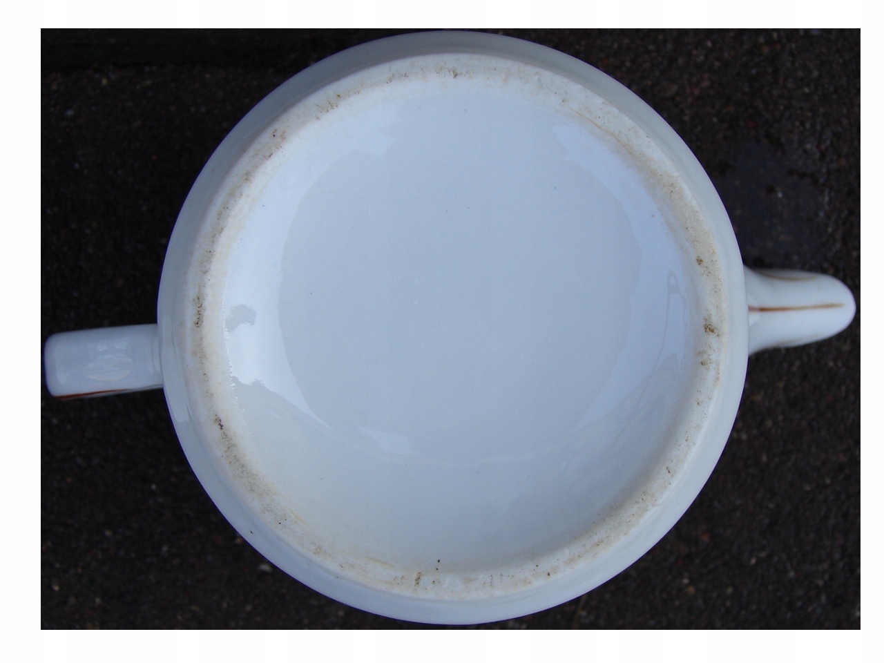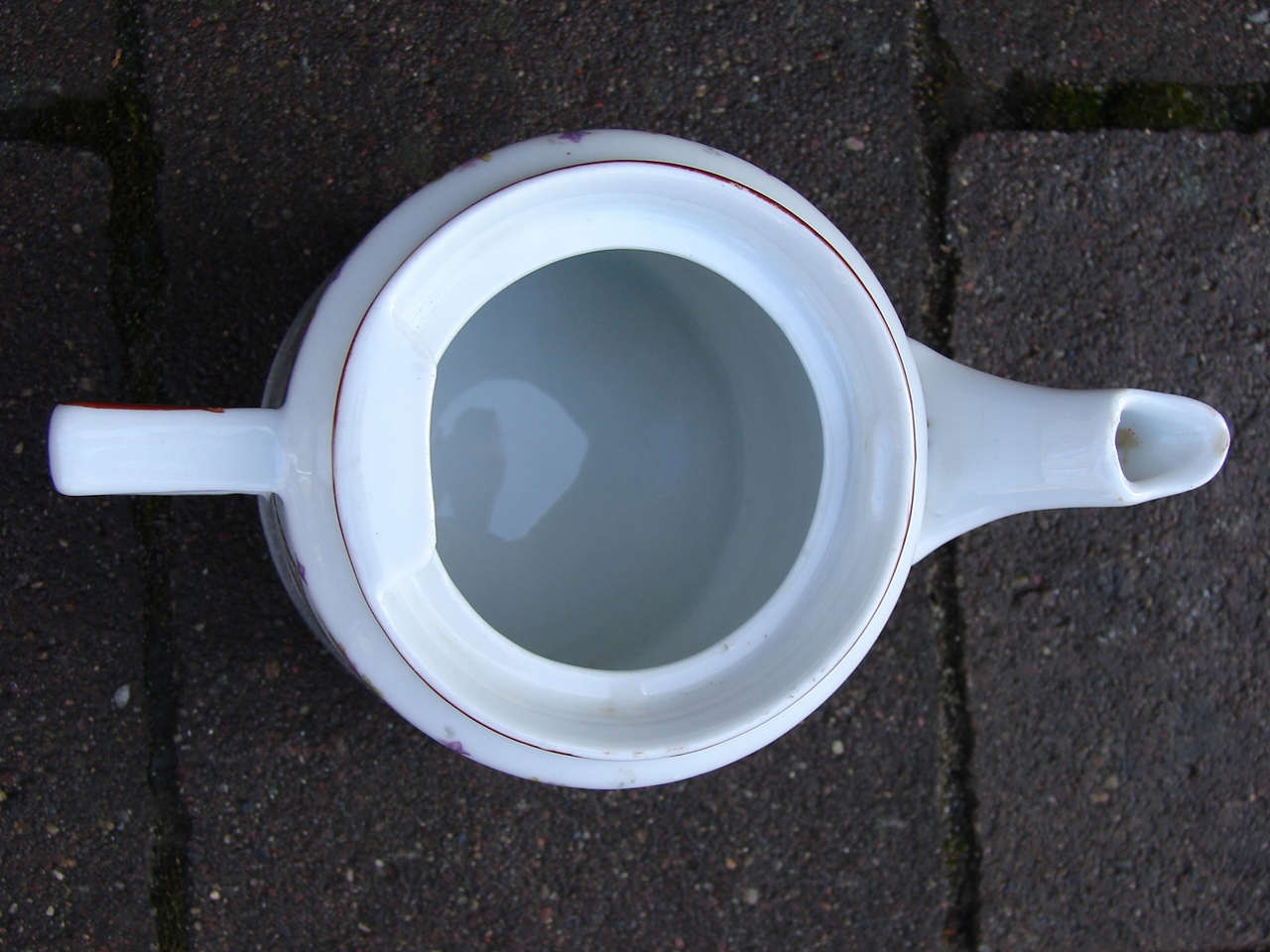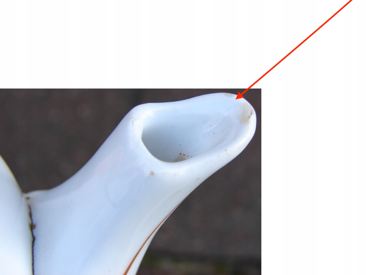 Фарфоровое без трещин только на клюве чашки, в котором кувшины есть разряд, не большая пустыня, которая показывает красную стрелку. Предмет имеет следы возрастного использования. Локальные погони за схемой обесцвечивания и недостатки, созданные во время производства.