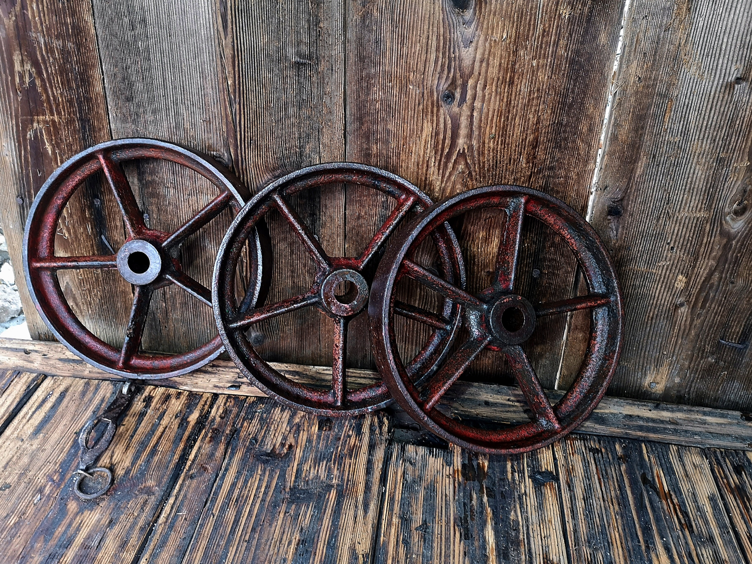 Старое чугунное колесо диаметром 5 плеч 32,5 см.