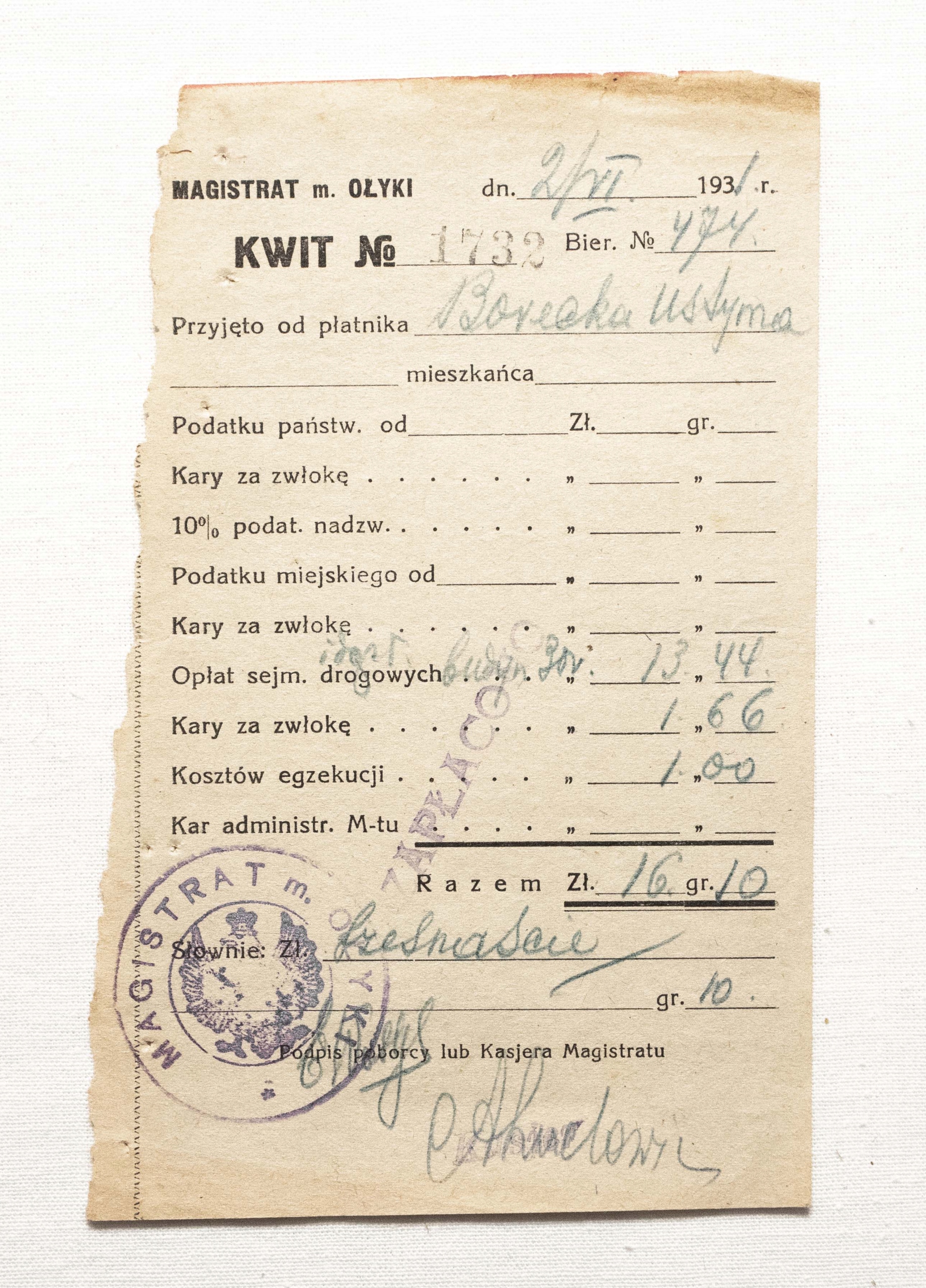 СТАРИЙ ДОКУМЕНТ, КВИТАНЦІЯ НА ПОДАТОК - OŁYKA 1930