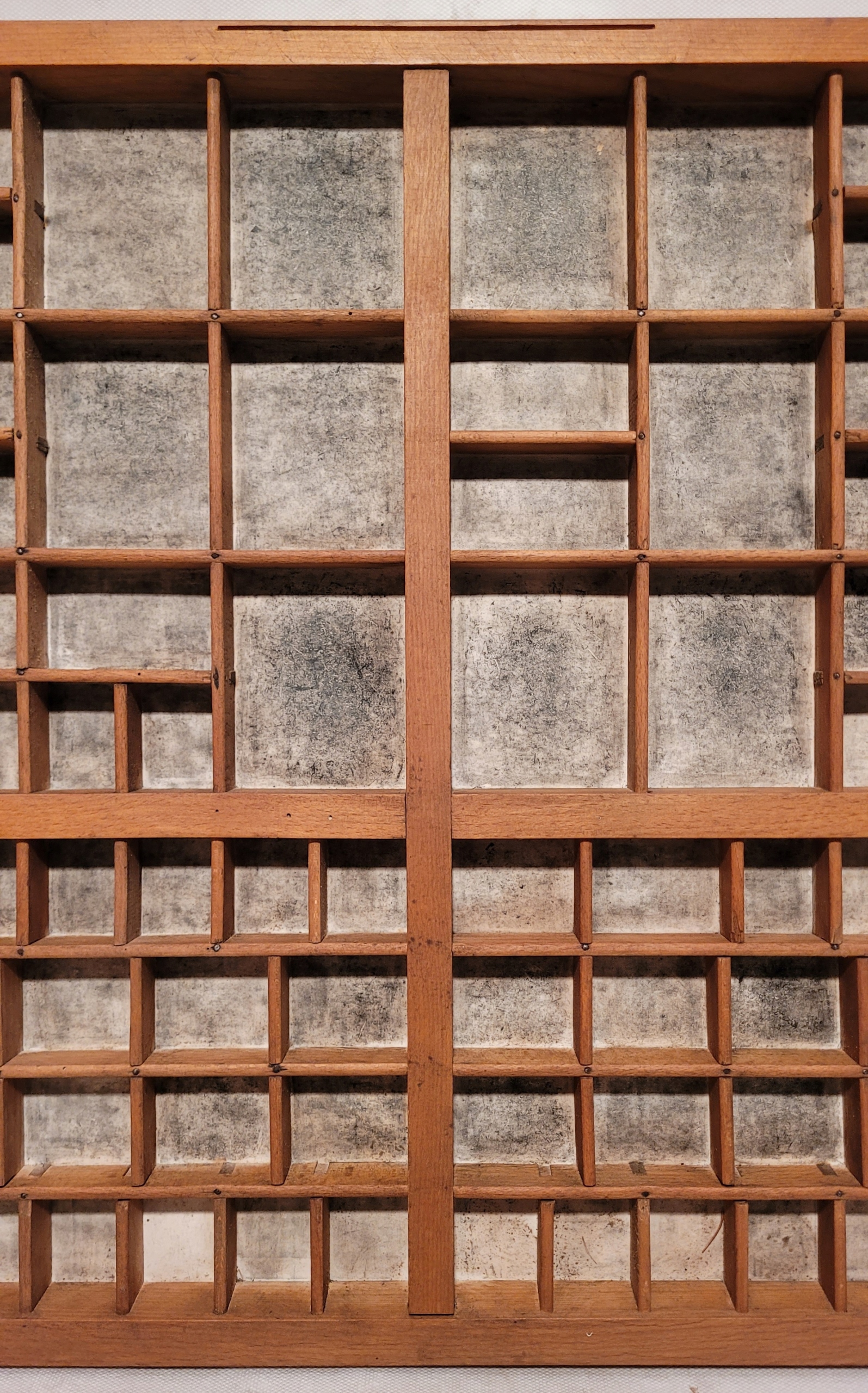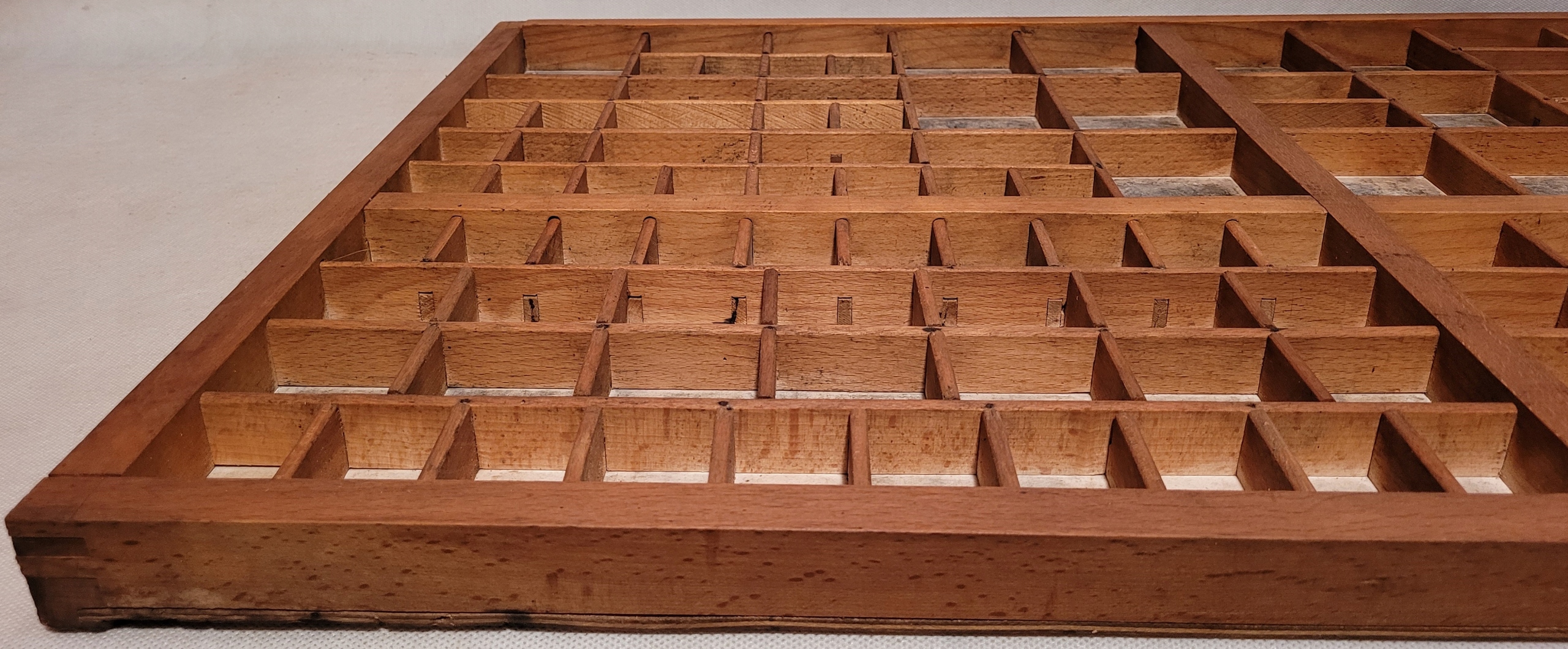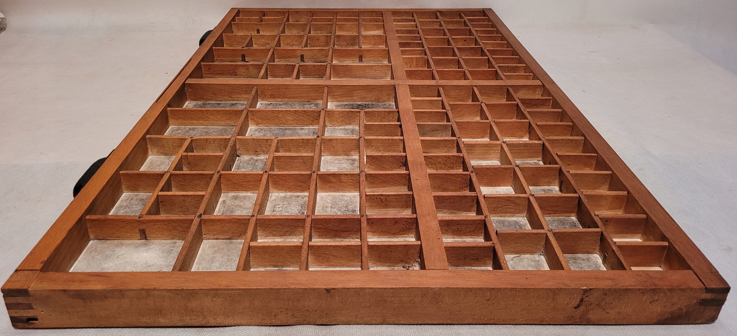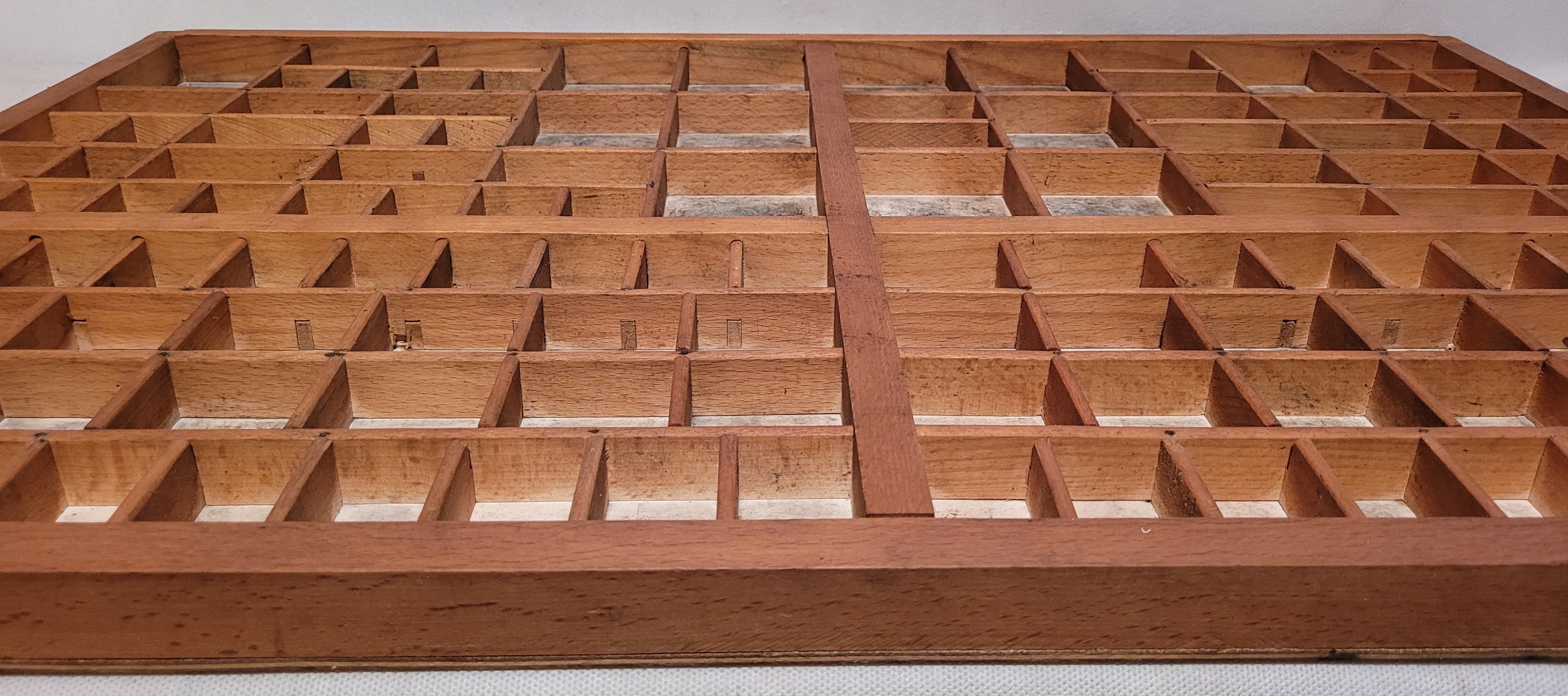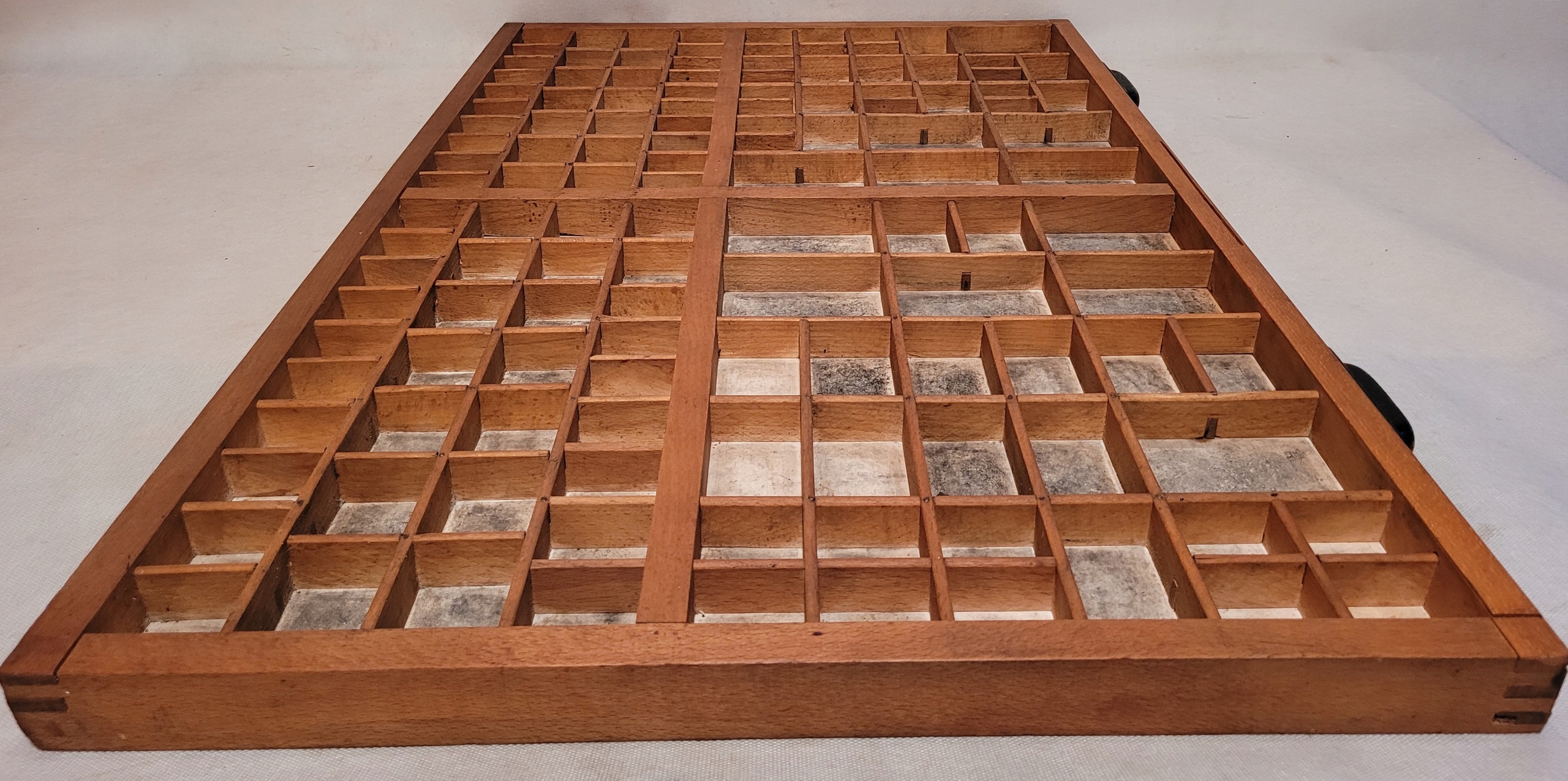 - Сундук - ящик для печати простирается от полки, разделенного на отсеки, в которых подходят шрифты и оправдание. В каши был набор признаков данного типа буквы, в то время как в стойке набор разновидностей и размеров.