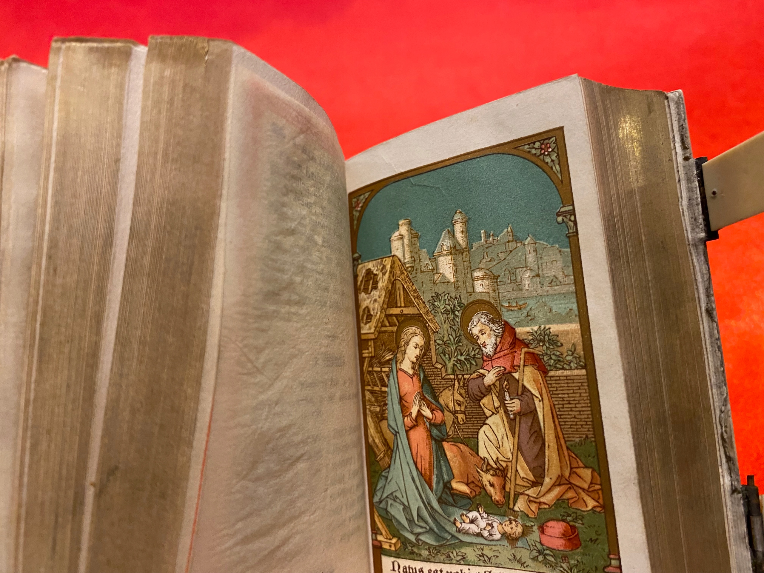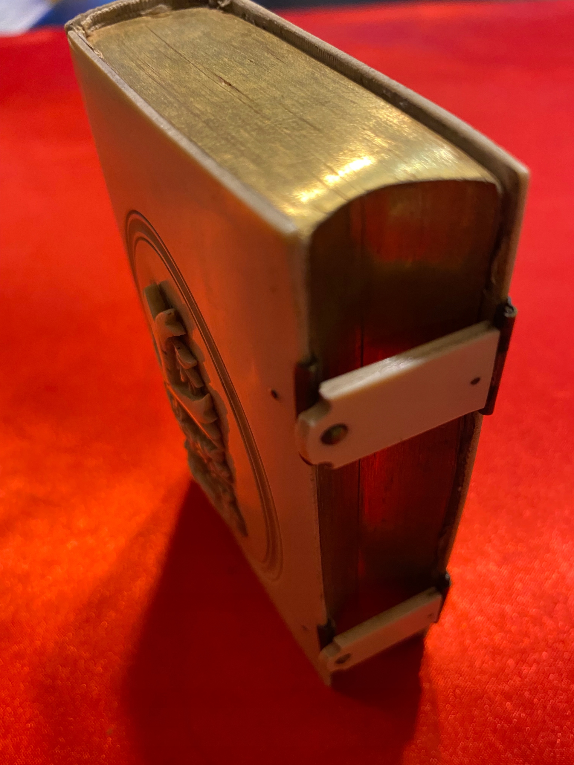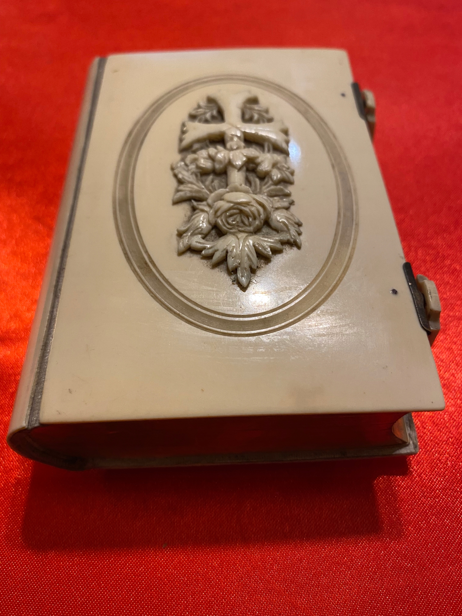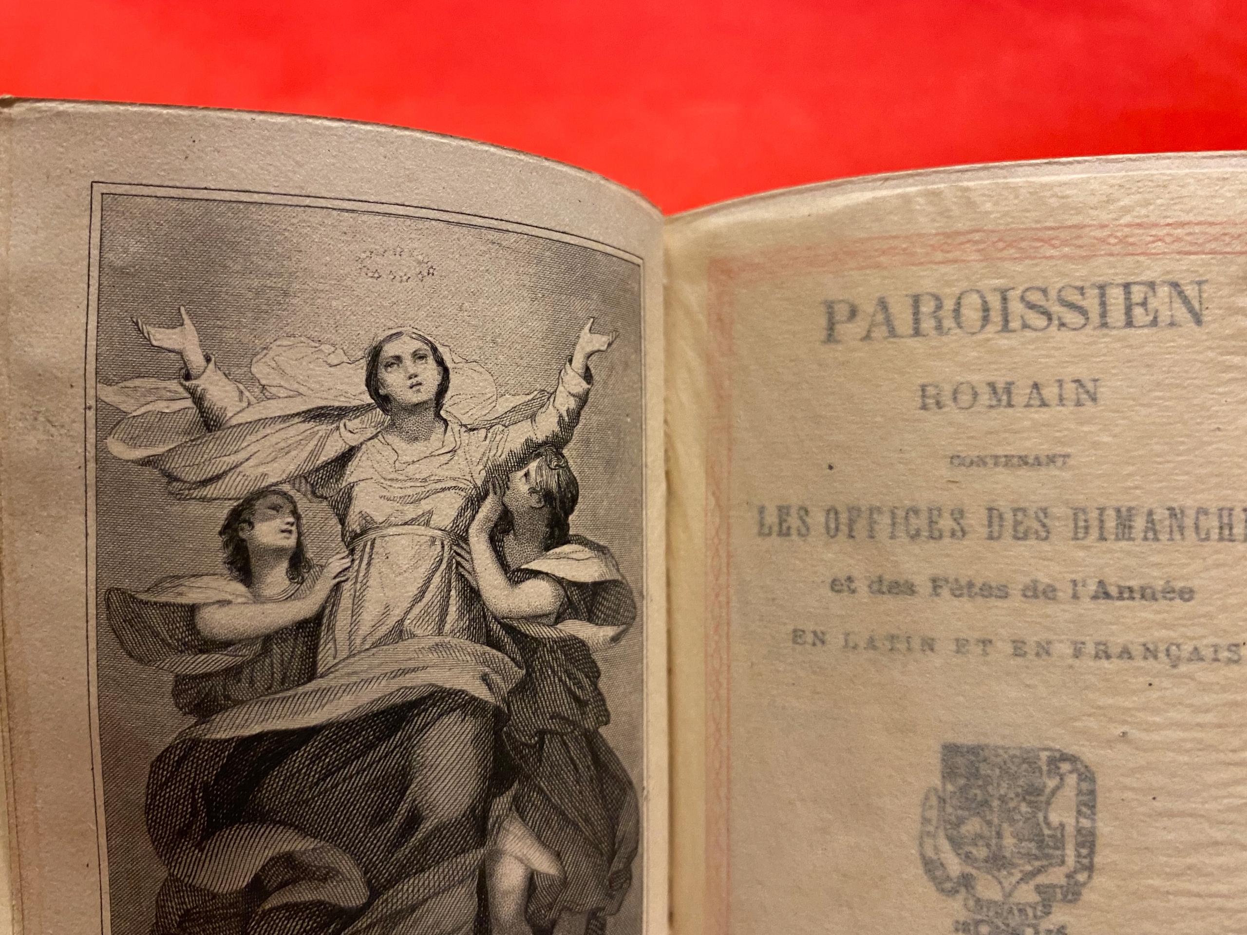 Предметом аукциона является красивый старинный молитвенник на французском языке (Paroissien Romain z), датированный 1886 годом, книга имеет позолоченные страницы в первоначальном состоянии и содержит иллюстрации Успения Пресвятой Девы Марии на лицевой стороне. в книге стоит крест среди цветов розы - красивое украшение.