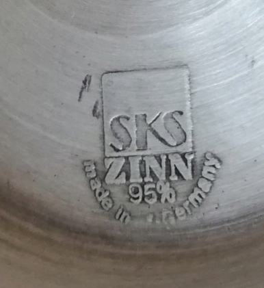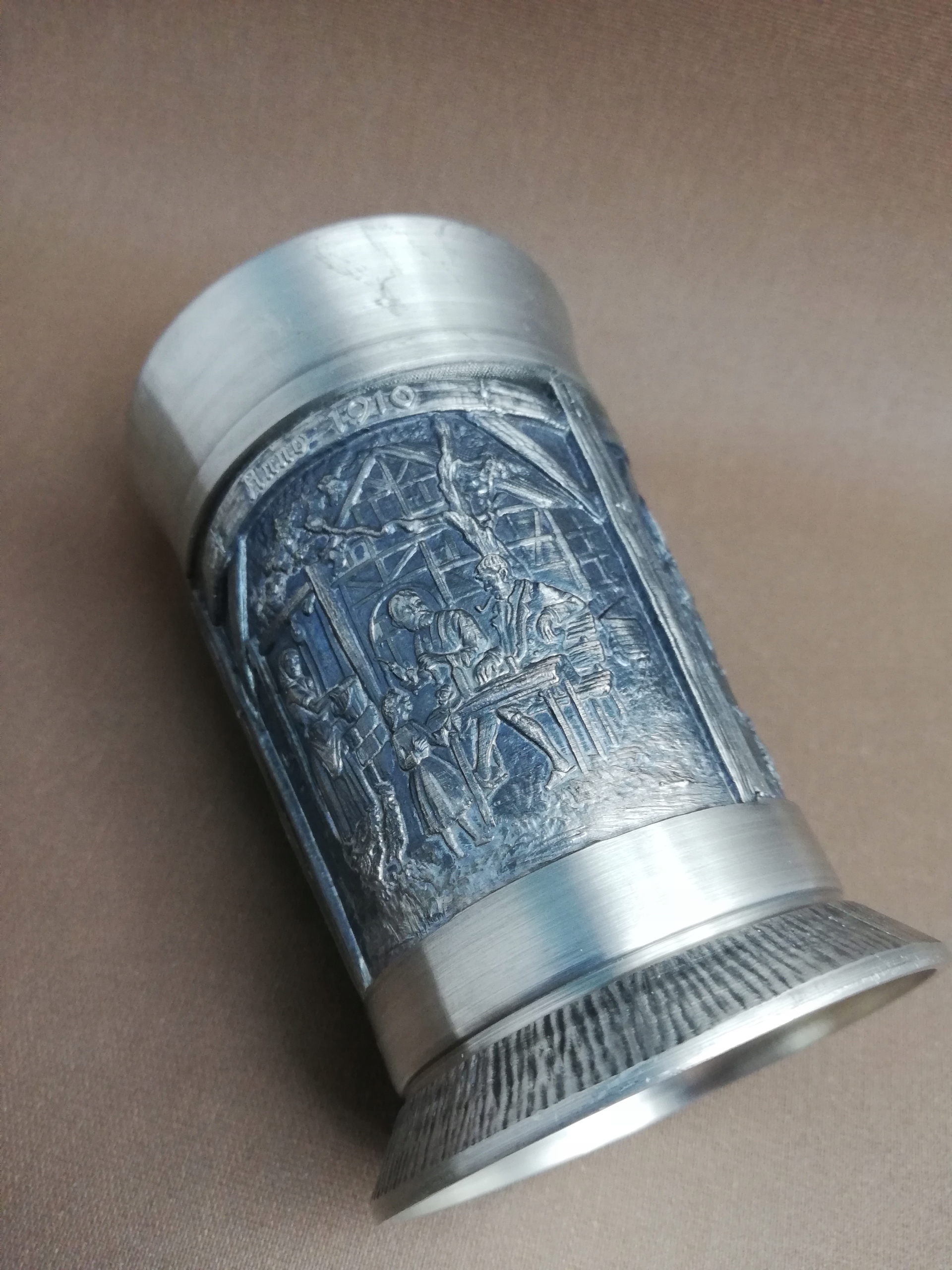 Старый оловянный горшок/чаша из жести, маркированный знаком завода SKS, Германия, украшенный рельефом с сельским мотивом