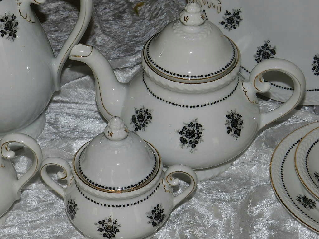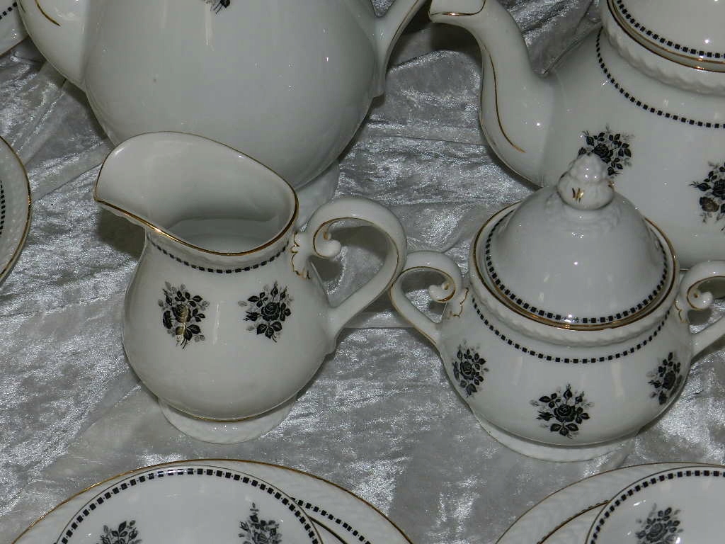 В комплект входят: кувшин, чайник, сахарница, молочник, 6 наборов для завтрака, 2 подставки для торта.