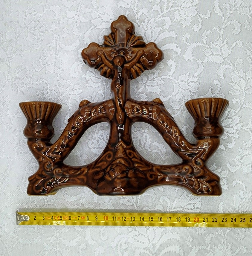 Старый, древний керамический кросс -подсвечник для двух свечей, ширина 23 см.