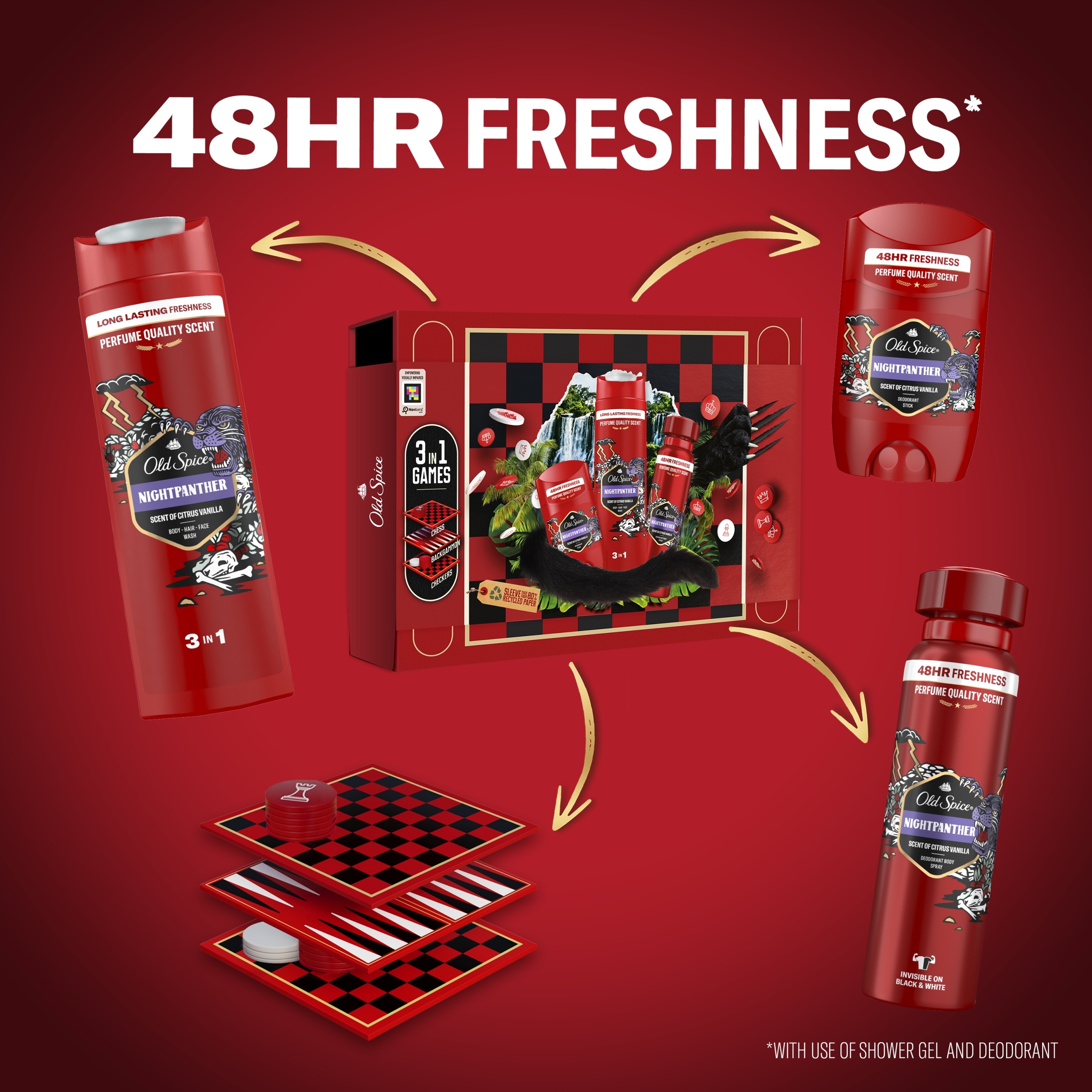Идеальный подарок для него? Не смотрите дальше - вот подарочные наборы Old Spice. Подарочные наборы Old Spice - лучший способ произвести впечатление на современного человека - очаровательные, мужские ароматы специй, безусловно, не разочаруют вас. Подарочный комплект Old Spice Gamebox содержит дезодорант в палке, спрей -дезодорант и 400 мл геля для душа из серии «Ночной пантеры», а также набор из 3 знаковых настольных игр - шахматы, триткрак и шашки. Продукты предлагаются в старой картонной коробке Spice, оснащенные магнитным закрытием и предназначенные для повторного использования, в котором настоящий фанат игры может скрывать свои сокровища. У продуктов в подарочном наборе Gamebox есть мужской аромат ночной пантеры, который отличается вкусными нотами темного шоколада и ванили. Кроме того, этикетка этого подарочного набора изготовлена в 80% переработанной бумаги и сертифицированных FSC материалов, полученных сбалансированным образом. Интересно, почему этот старый подарочный набор специй для мужчин еще не оказался в вашей корзине.