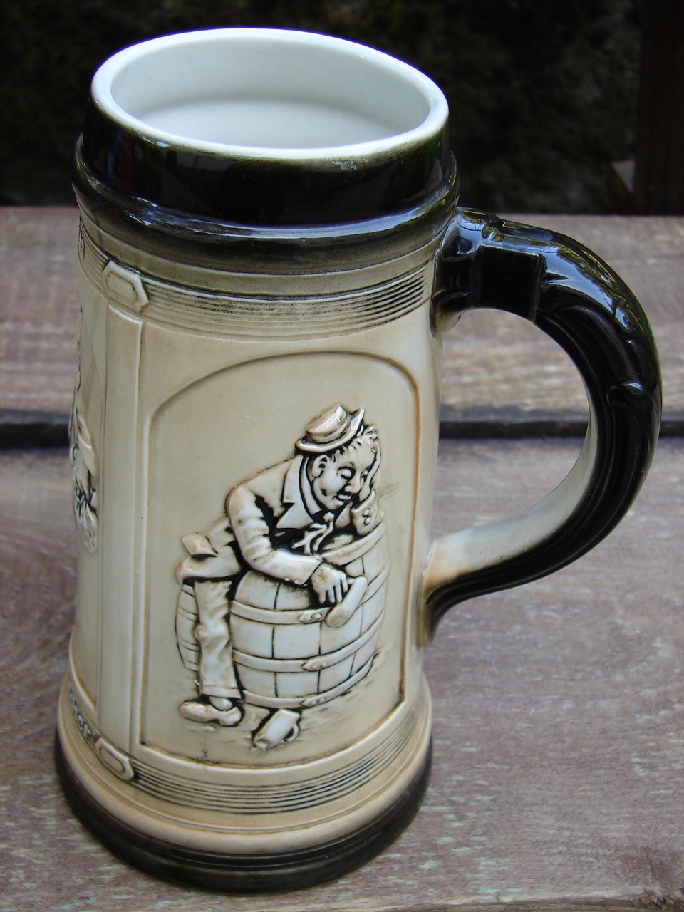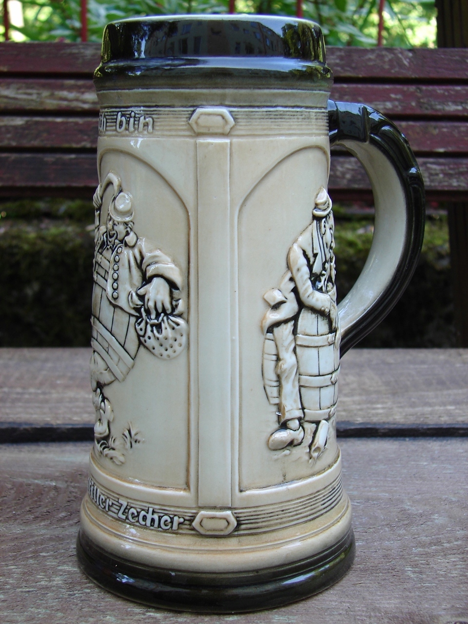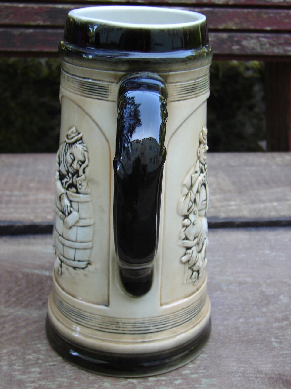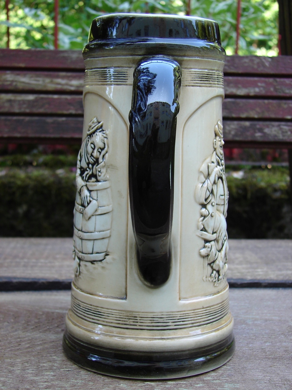 Старинная кружка, украшенная жанровой сценой в виде Зитцендорфского барельефа.