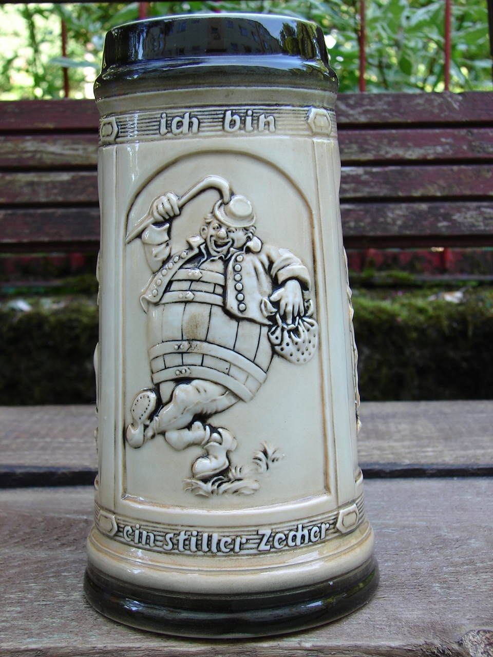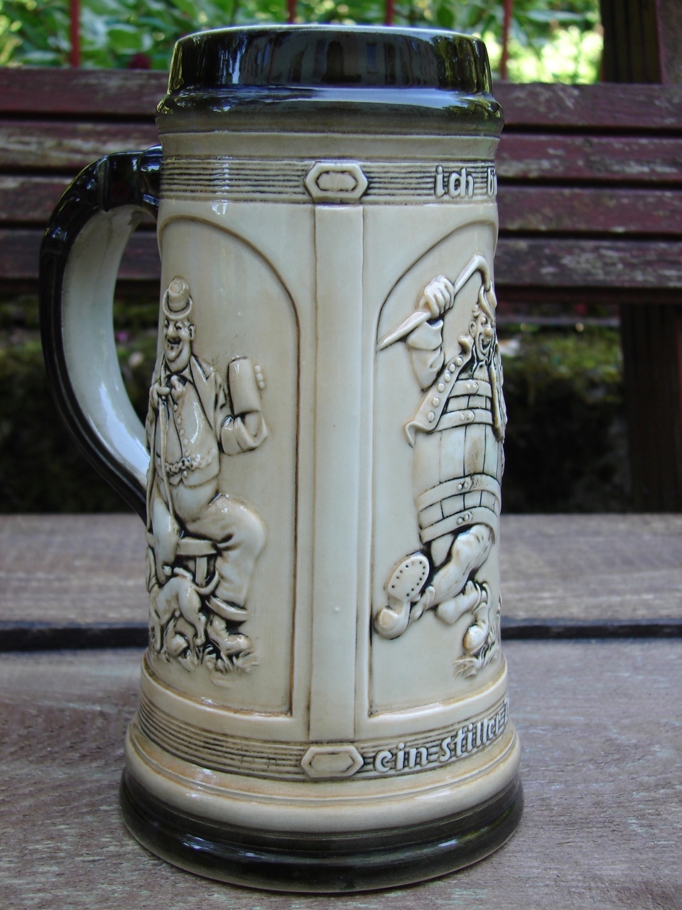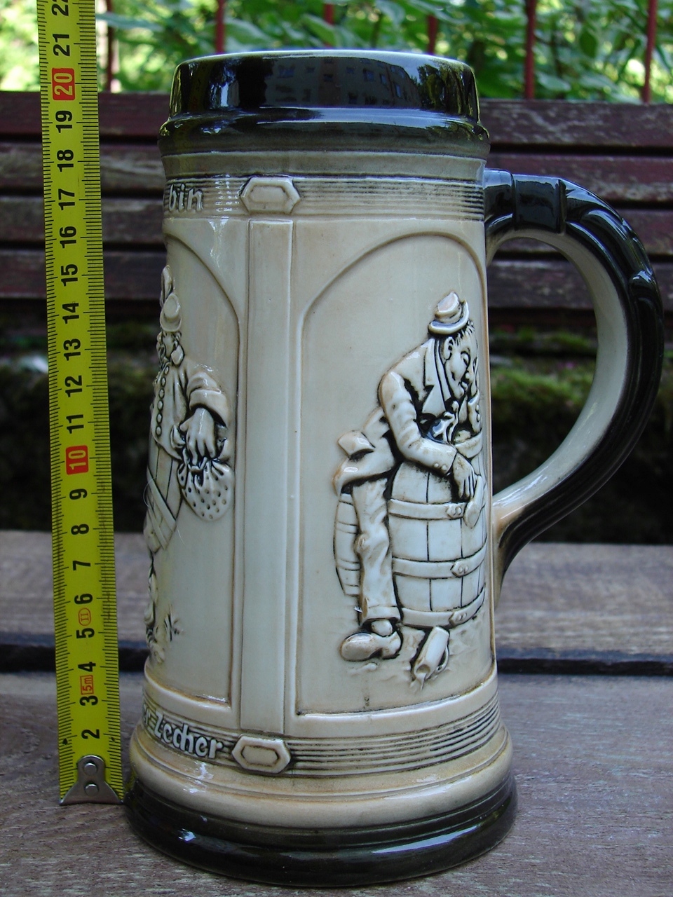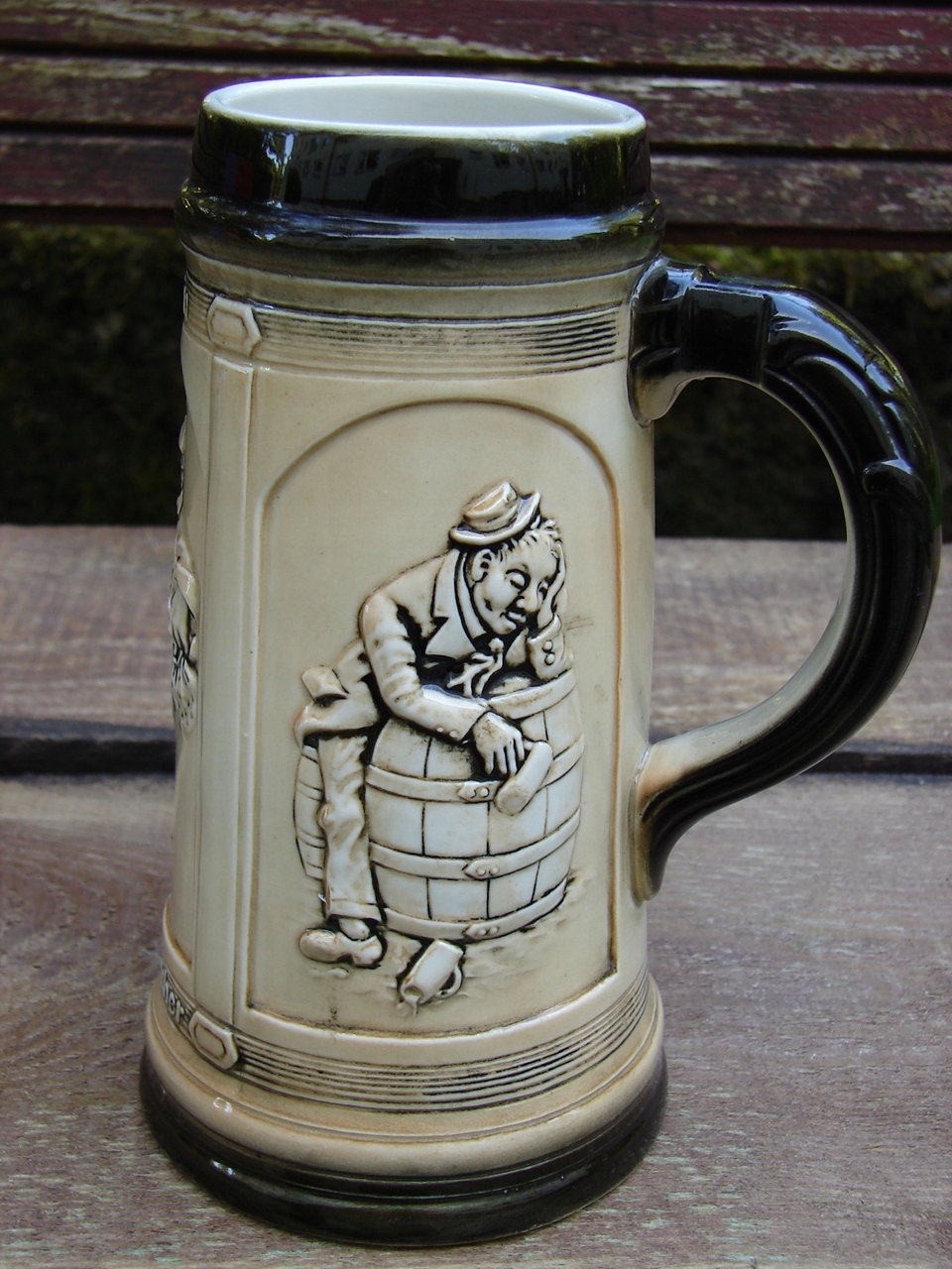 Старинная кружка, украшенная жанровой сценой в виде Зитцендорфского барельефа.