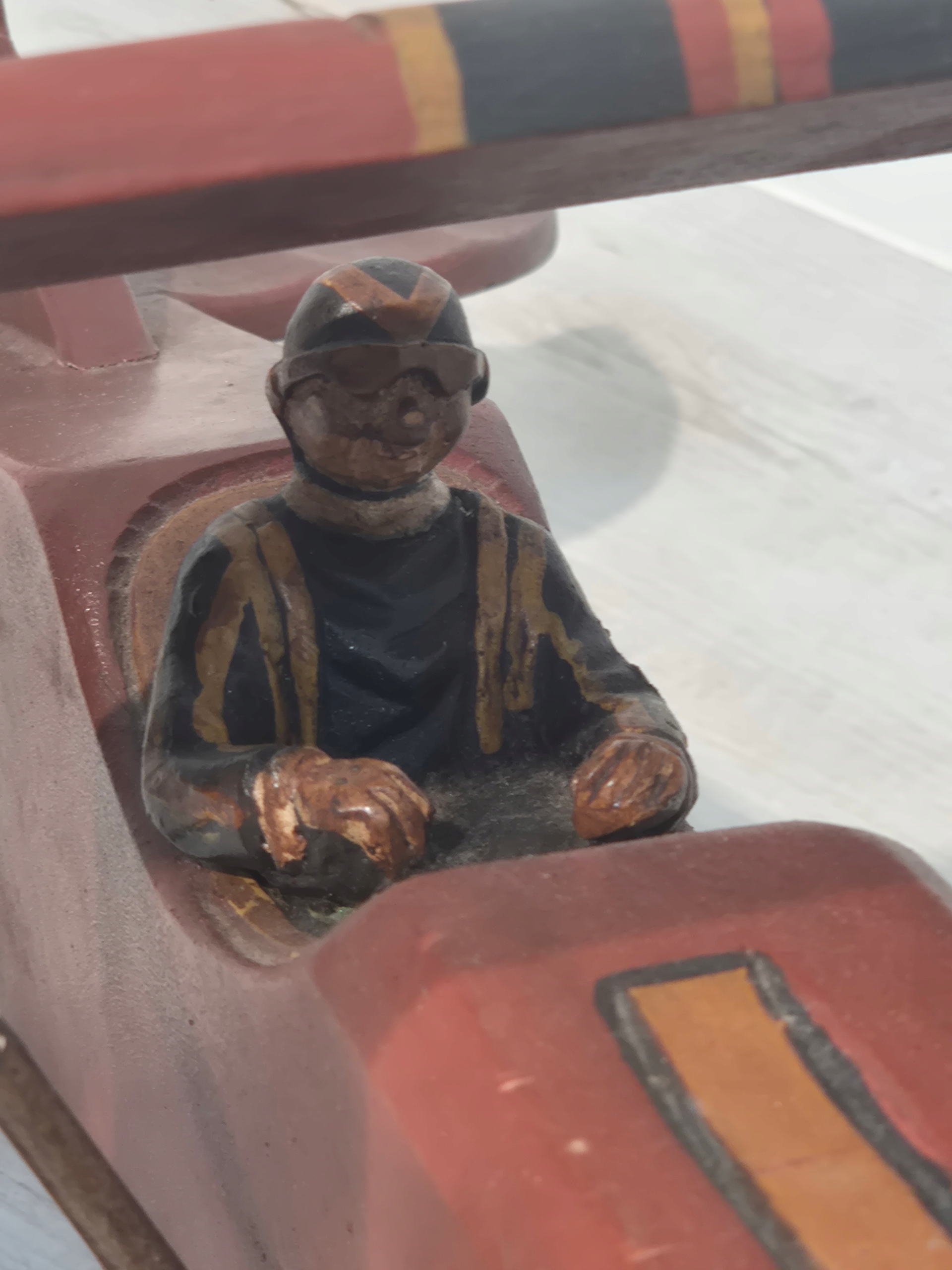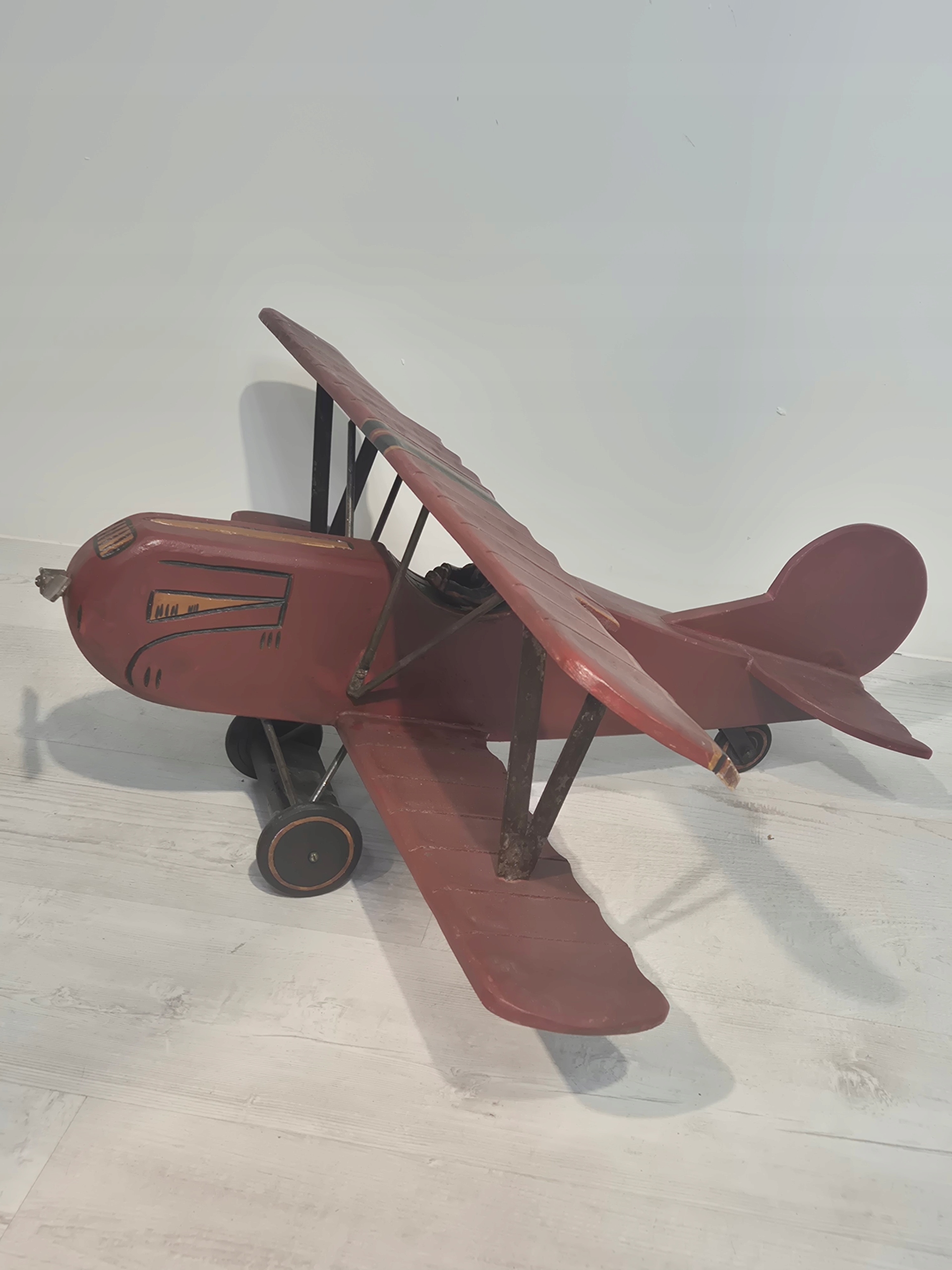 Большая коллекционная модель истребителя-биплана с фигуркой пилота 1950-1960-х годов. Деревянный самолет был очень тщательно изготовлен и расписан вручную. Пропеллер, обода колес, а также опоры крыла и колес изготовлены из металла.