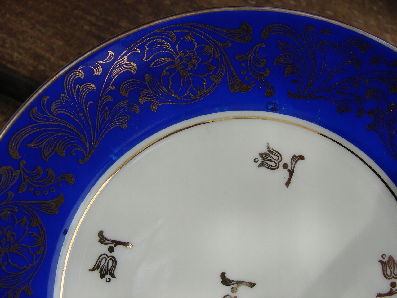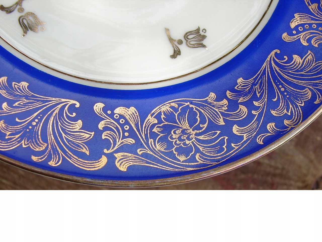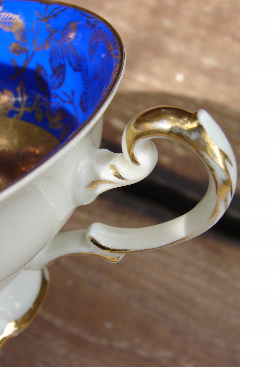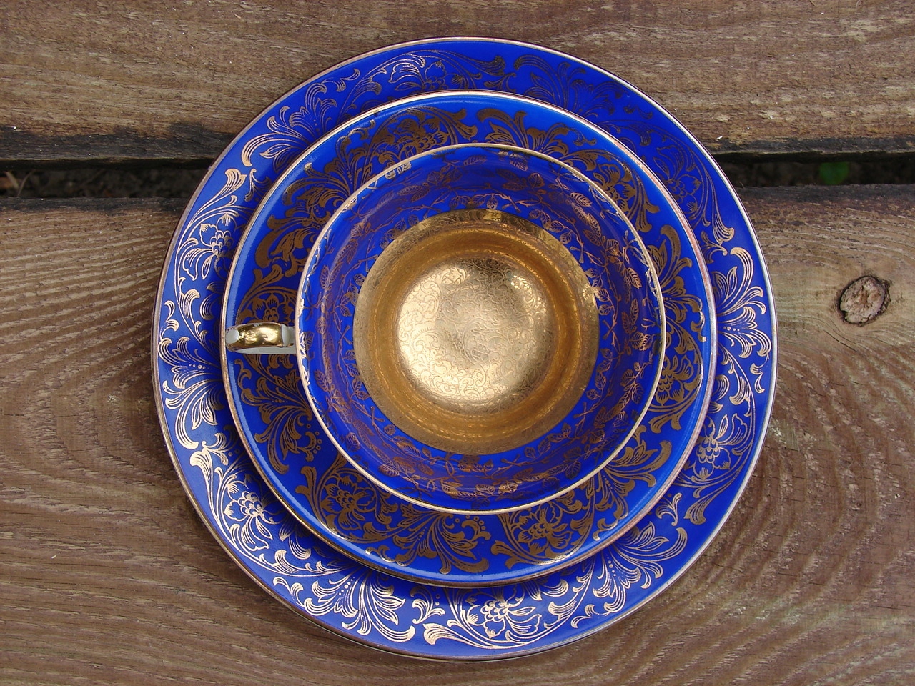 Красивый набор для завтрака, выполненный в стильной форме из кобальтового фарфора с декором в виде старинных золотых рельефов.