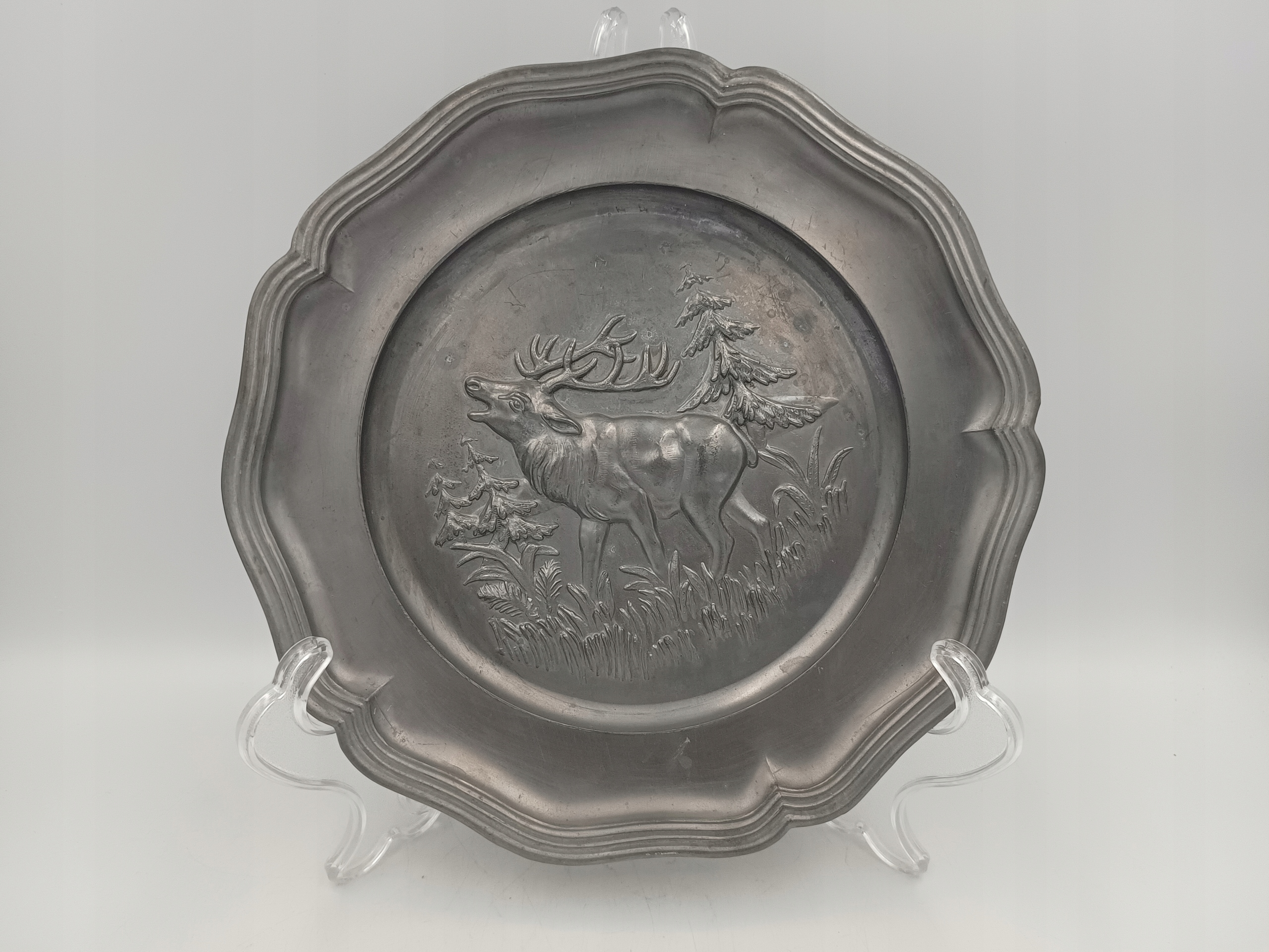 Старая олова Патера подписала охотничье мотив тарелку с оленей 24 см.