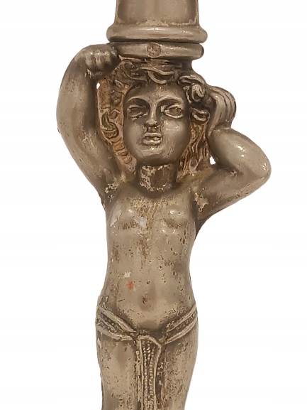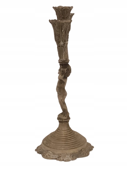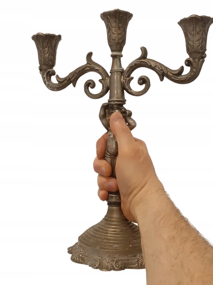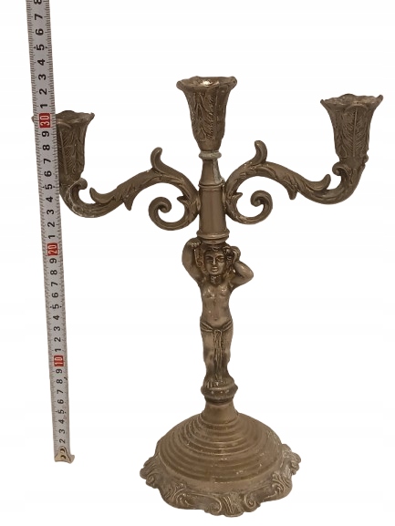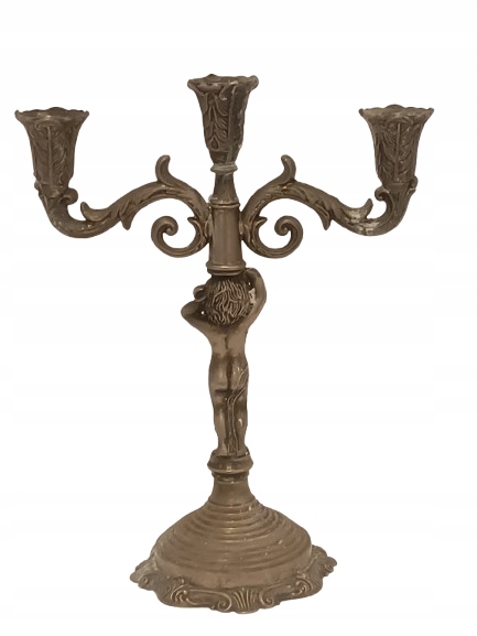 Старый жестяной фигуральный подсвечник, распределенный 3-строх Candelabrum с классическими украшениями. Внимание привлекает центральную фигуру в древнем стиле.