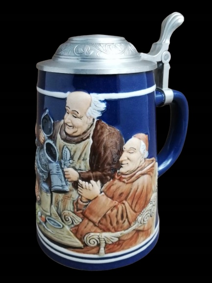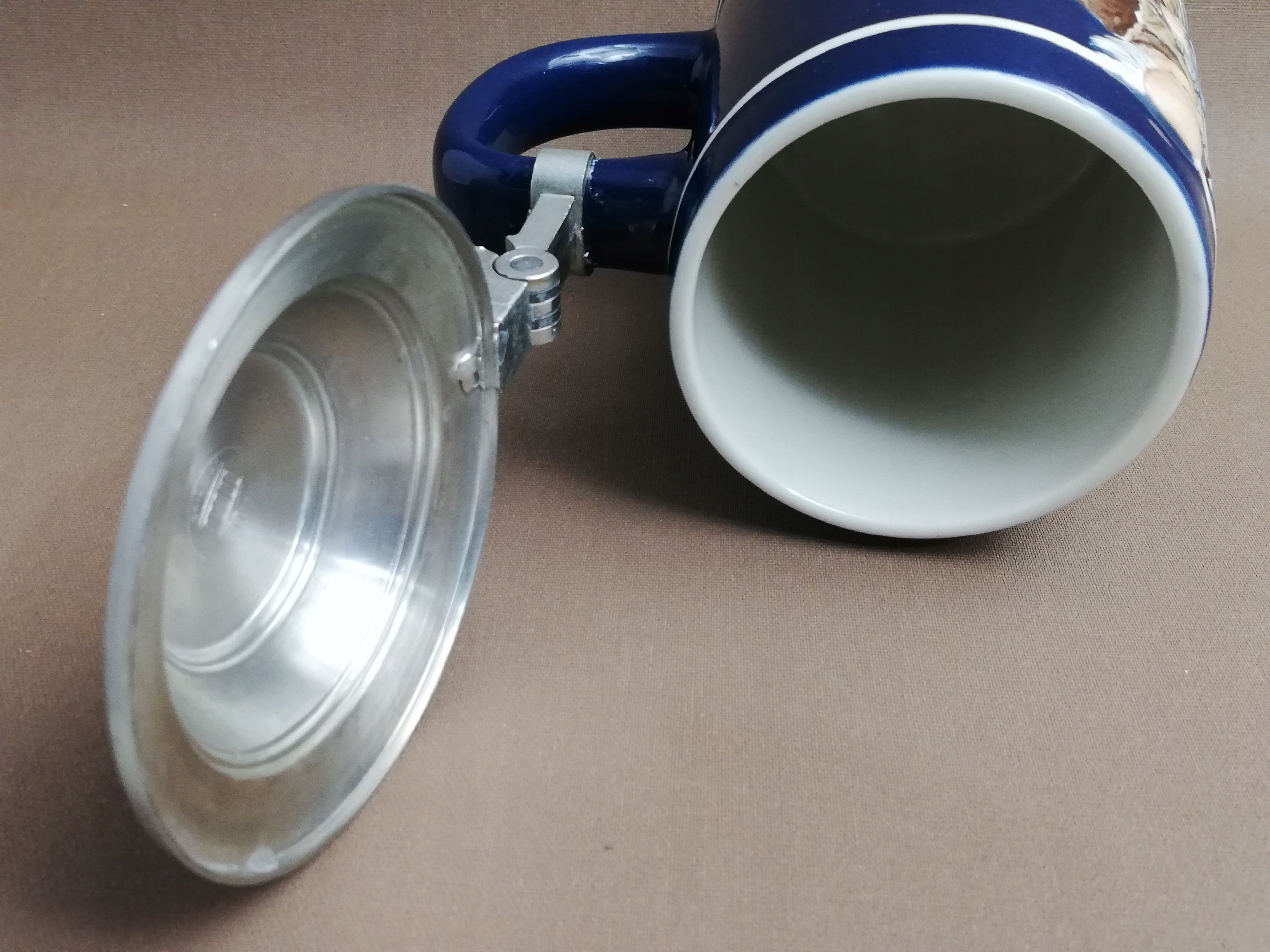 Старий пивний кухоль з жерстяною кришкою, колекційний рельєфний мотив