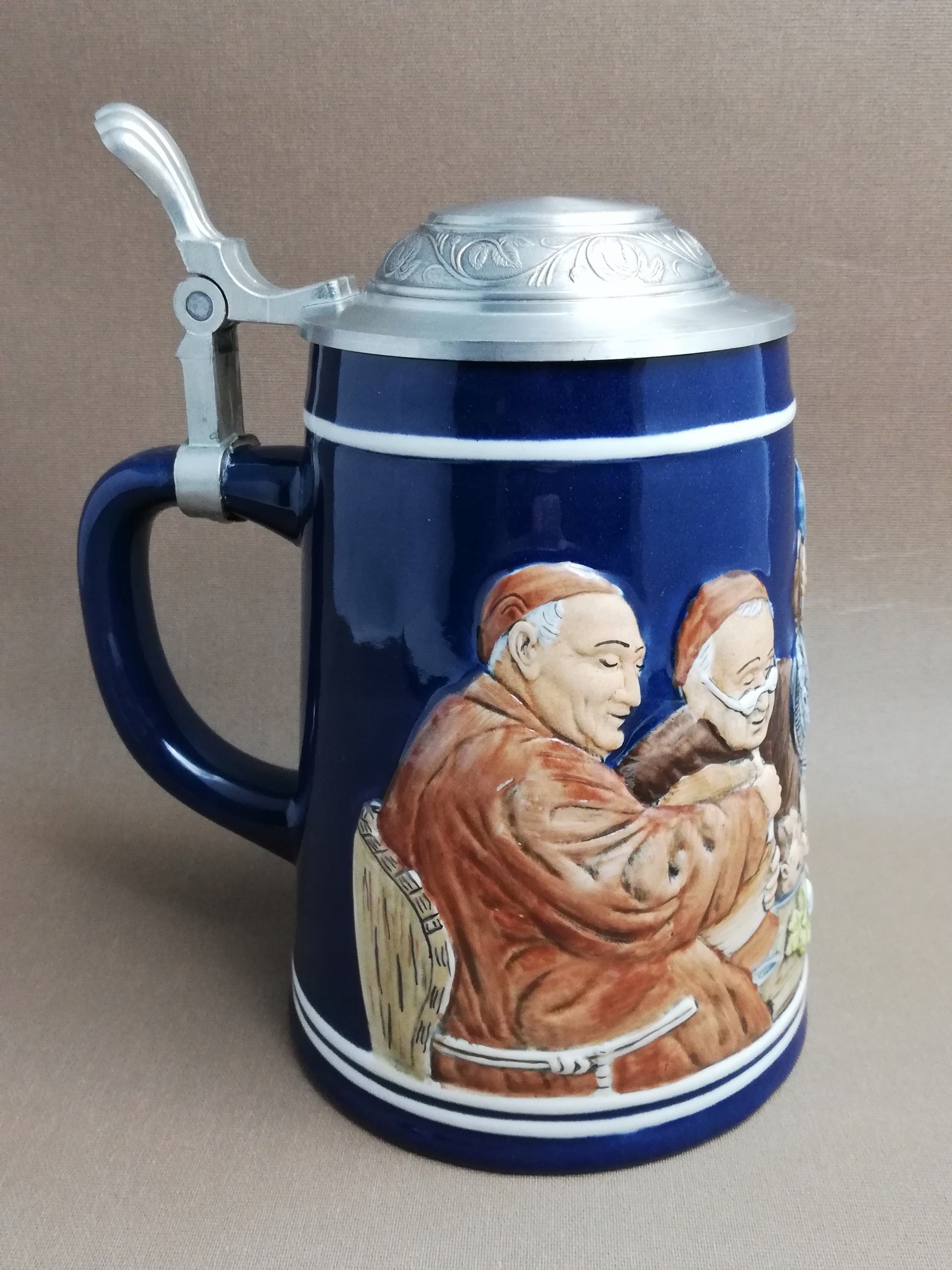 Старая керамическая пивная кружка с жестяной крышкой, украшенная рельефом с банкетным мотивом