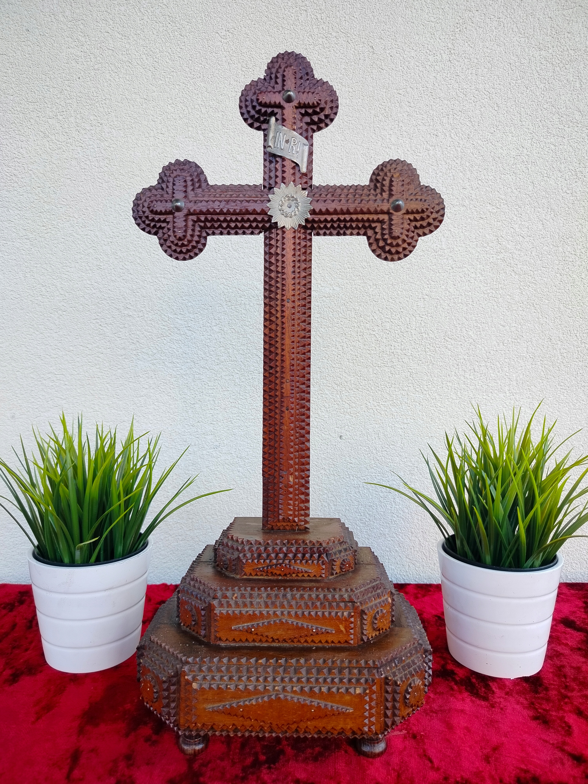 Старая страсть, созданная в стиле бродяги, характерно для народных ремесленных изделий с рутины 19 -го и 20 -го веков. Крест из дерева, украшенный слоями, вырезанными в типичной технике.