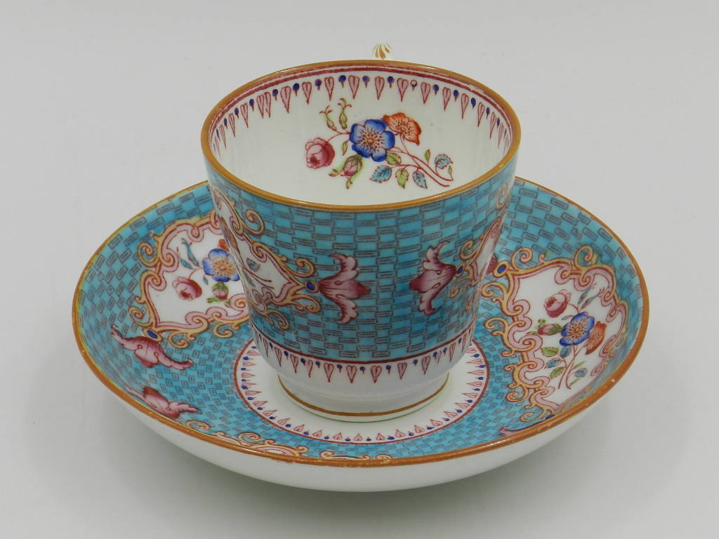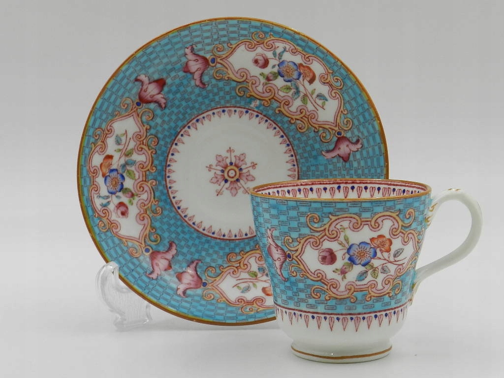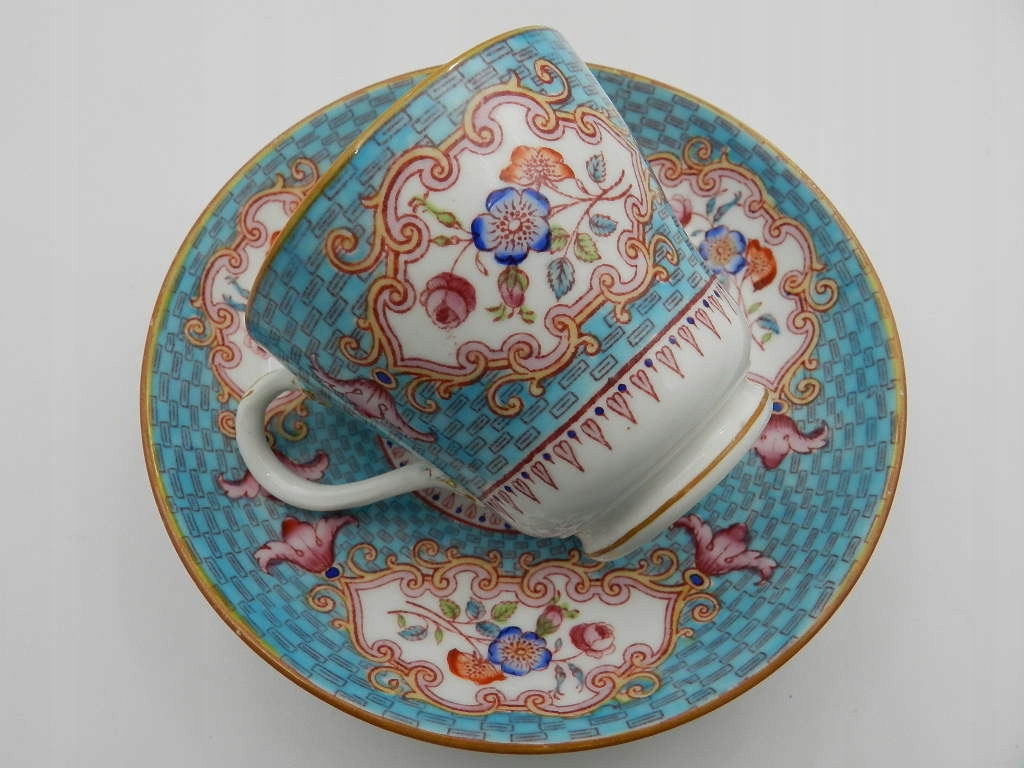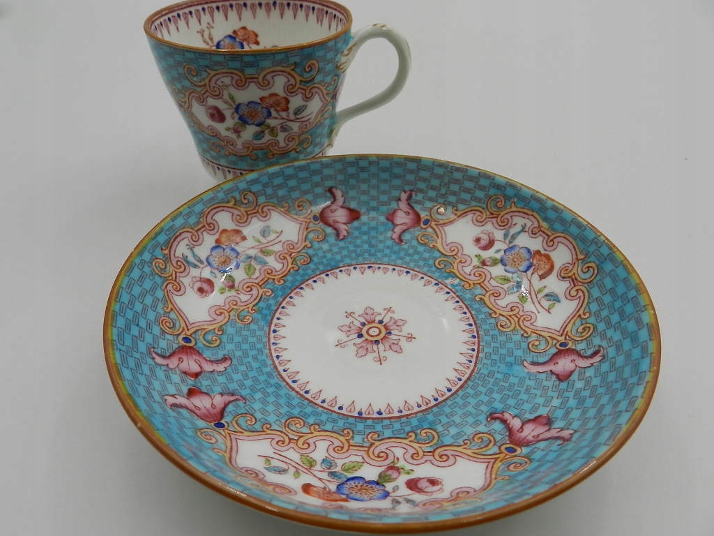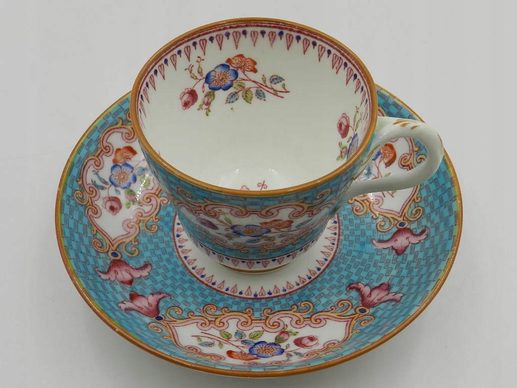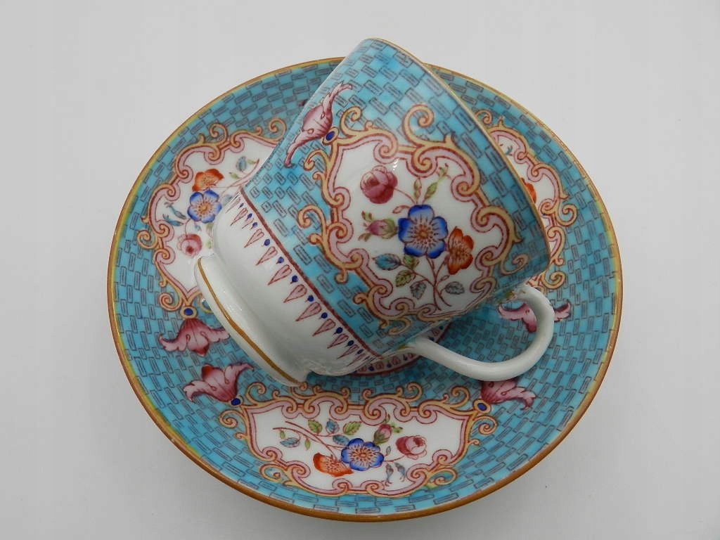 Чашка чрезвычайно богато расписана вручную красивой светло-голубой краской с тонкими геометрическими узорами и красивыми разноцветными цветочными композициями, выполненными с особой тщательностью.