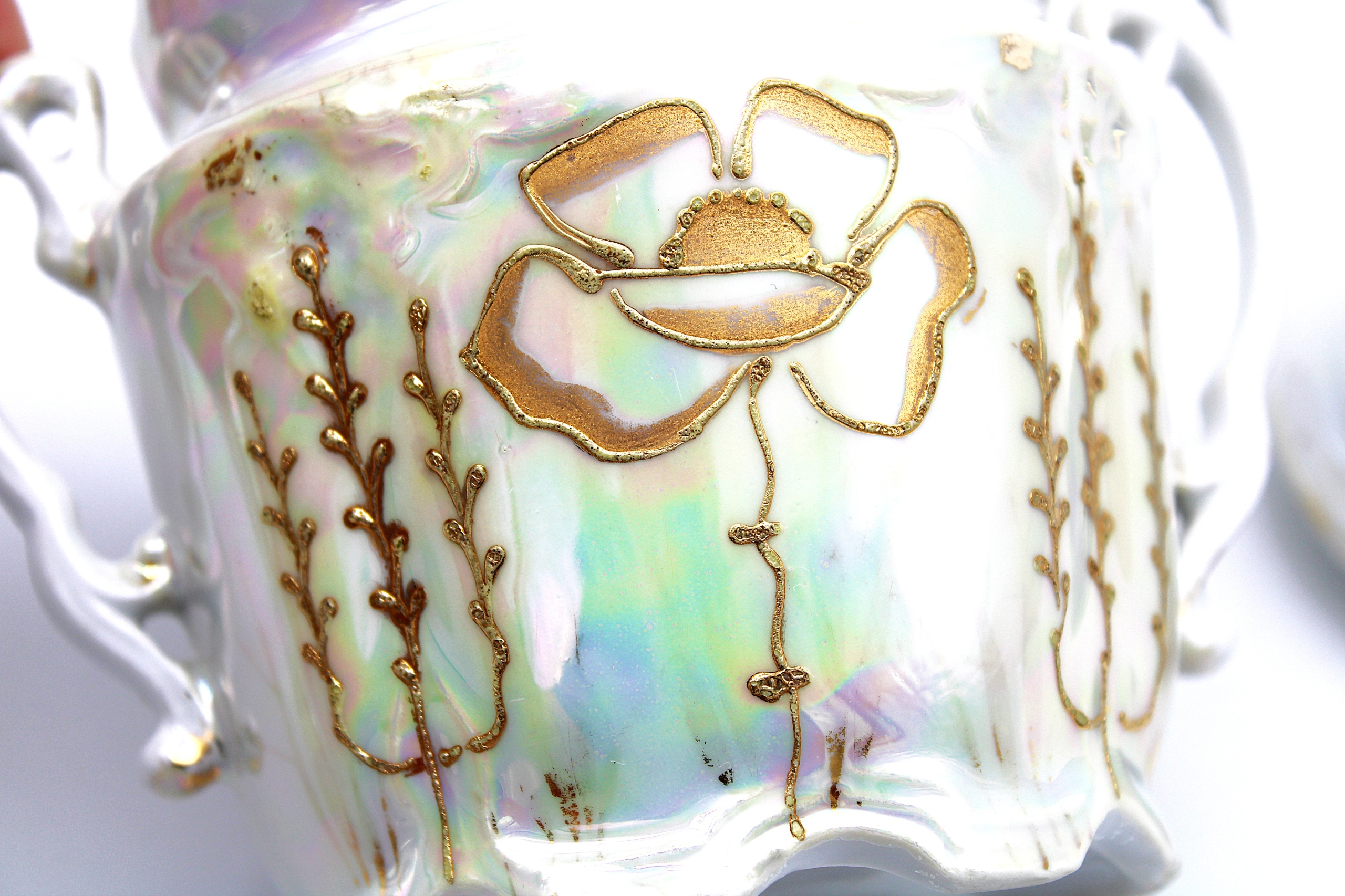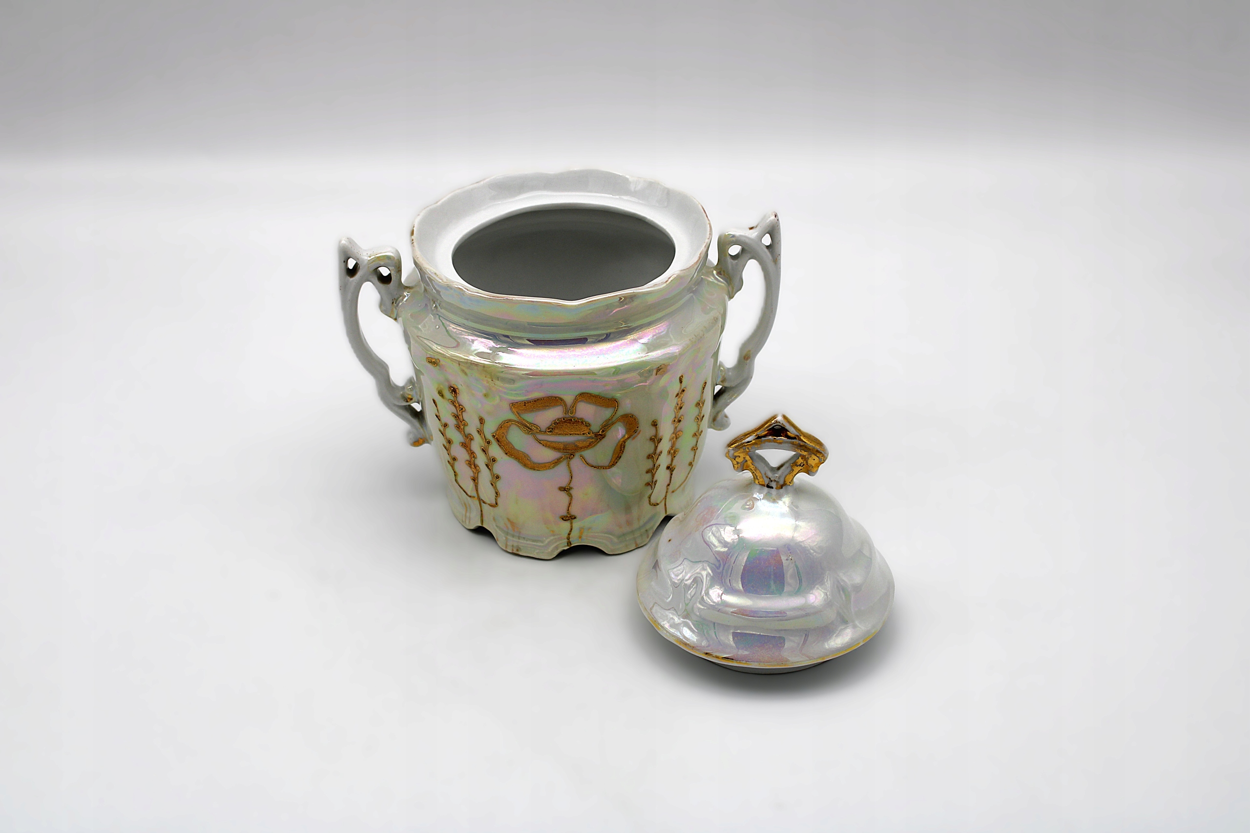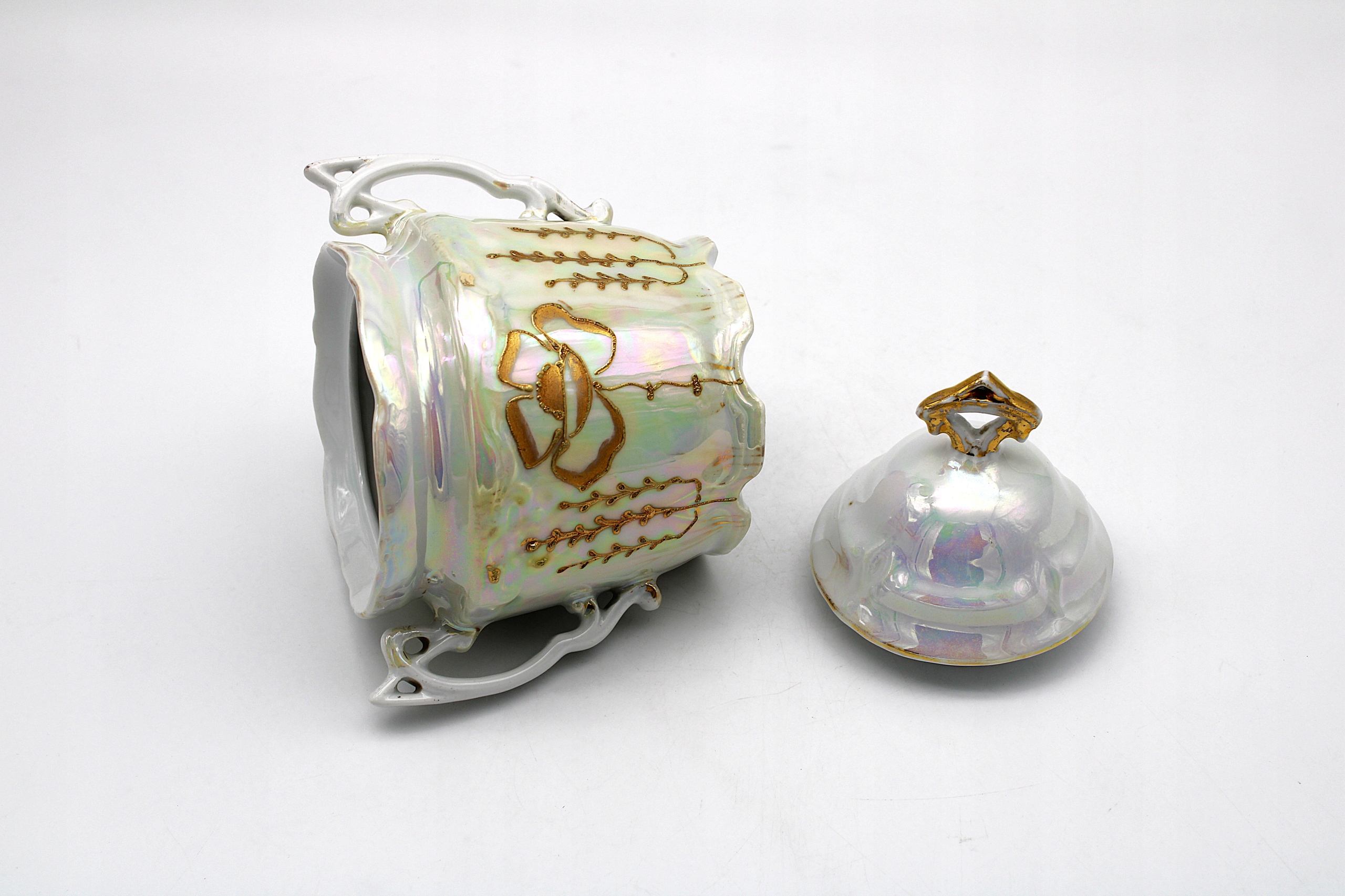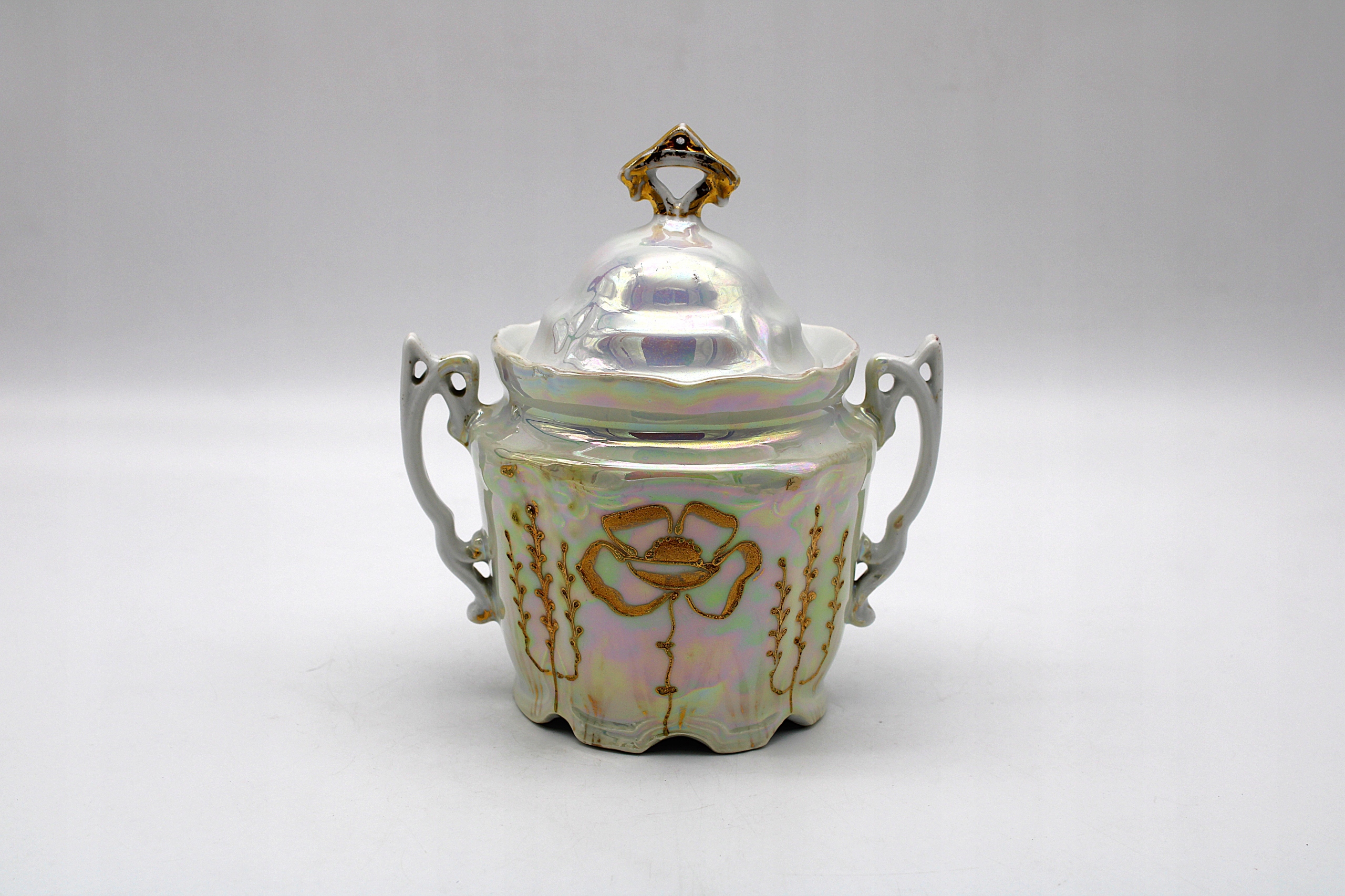 Я рекомендую старую антикварную сахарную чашу с фарфоровой фабрики в Кенигселте - Jaworzyna ląska Stary Silesia, все это зарегистрировано между 1914-1918 ** состоянием, такими как на сканировании для сканирования для ее субсидий 100 лет, имеет только естественные временные испарения, естественные маленькие фастористы. Позолота и 100 % оригинальный декор