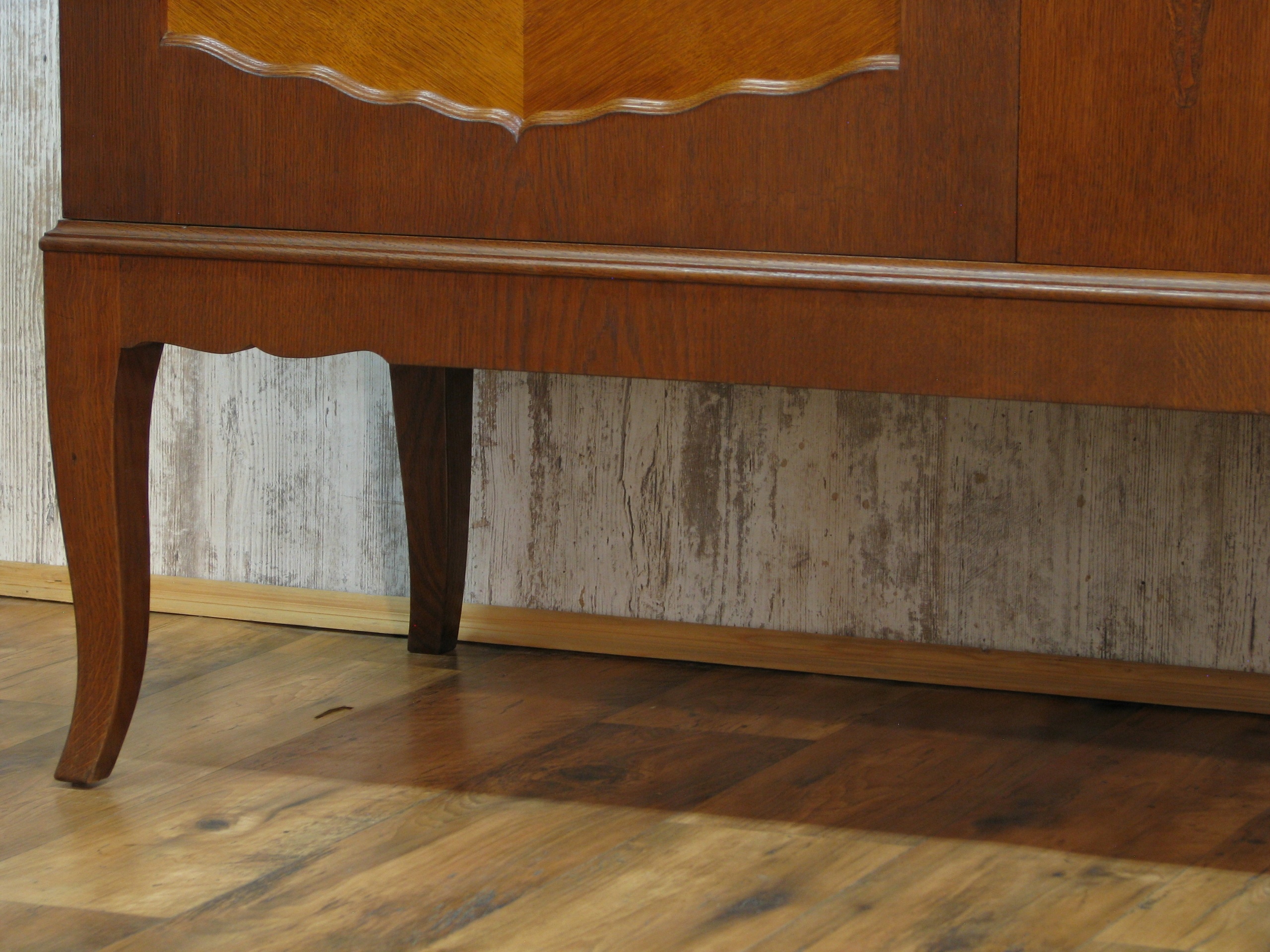 Этот предмет Мебель очищена от старых покрытий и покрыта лаком теплого медового оттенка коричневого. Внутри мебель очищена и покрыта лаком, видна оригинальная красивая фактура старого дерева, мебель шпонирована дубом. Красивые инкрустации на дверях.